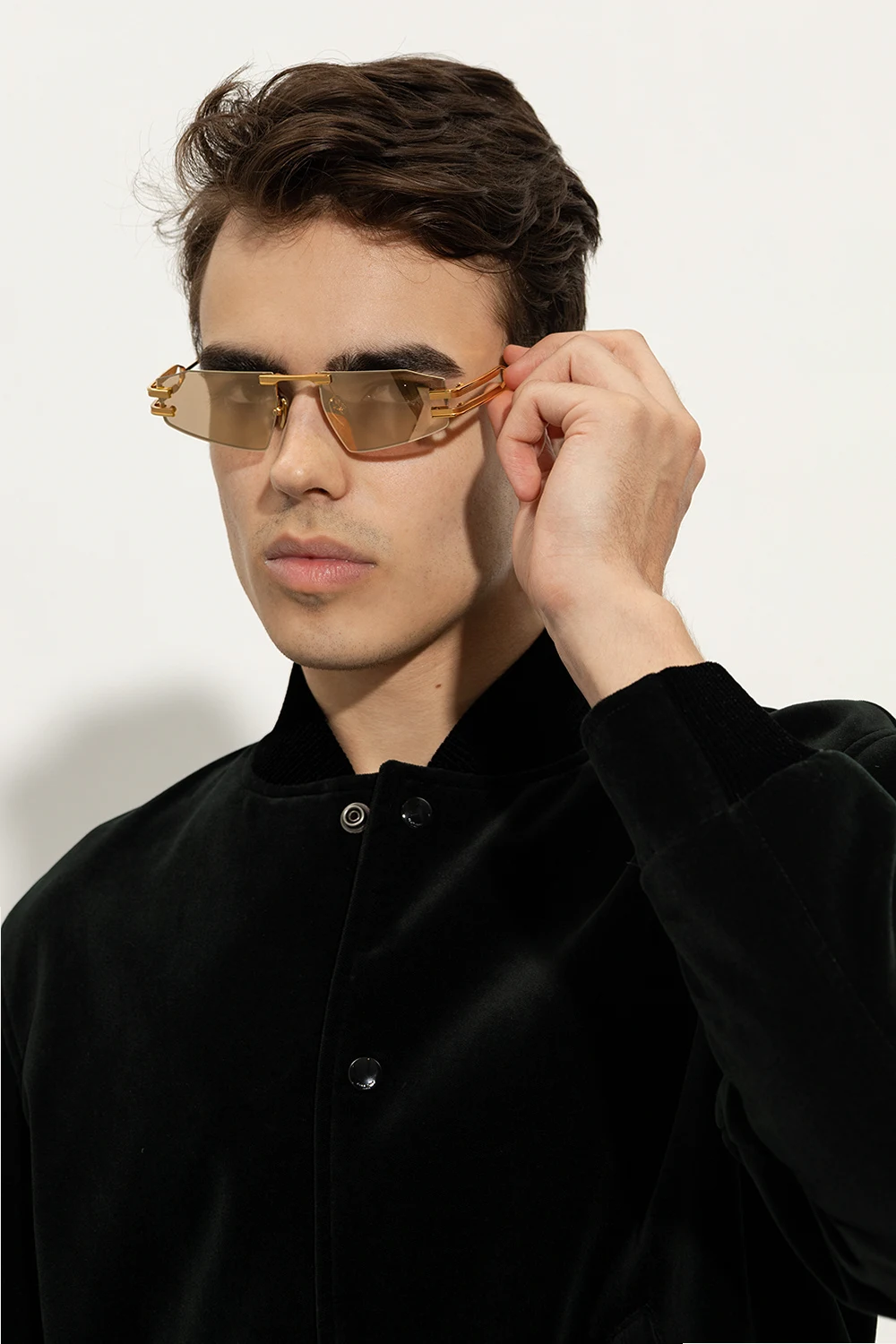 Okulary przeciwsłoneczne w kolorze złoto-białym, model ‘Fixe II’ Balmain. Wykonane z tytanu. Dekoracyjne zauszniki. Brązowe szkła z efektem lustrzanym i ze 100% ochroną przed promieniowaniem UVA/UVB. Dołączone etui.