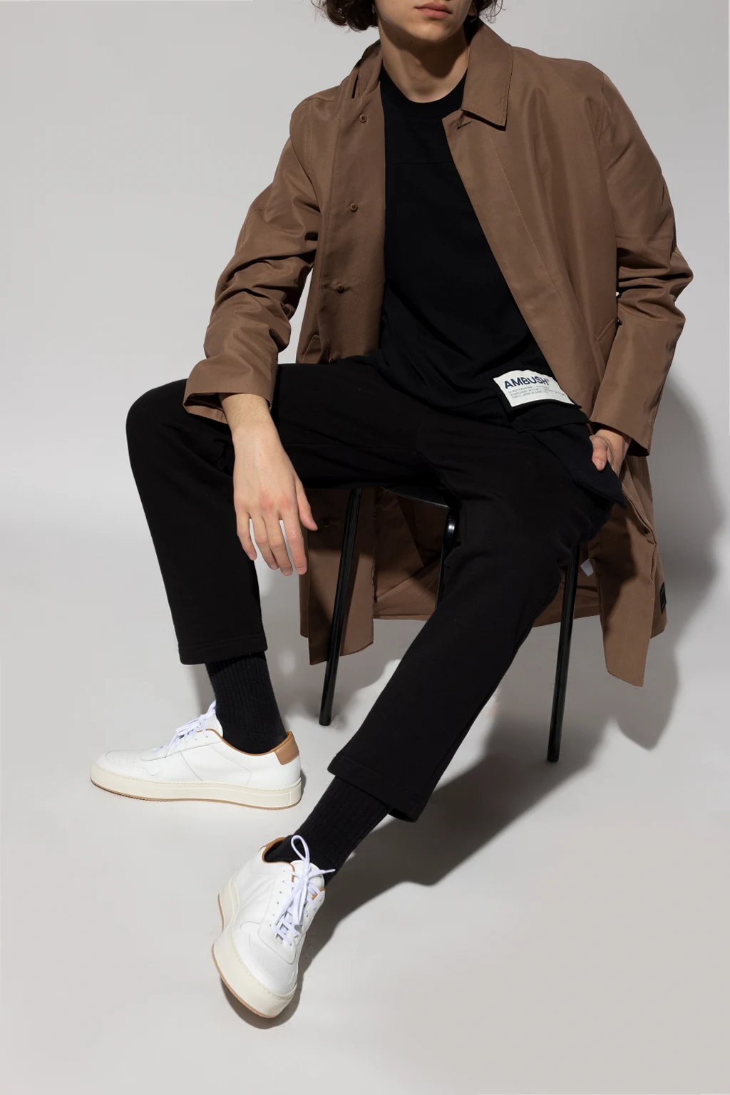 Białe, sznurowane buty sportowe, model ‘Bball ‘90’ Common Projects. Wykonane ze skóry. Ozdobione nadrukowanym wzorem z logo w kolorze złotym. Z tyłu brązowa wstawka. Brązowa, gumowa podeszwa.