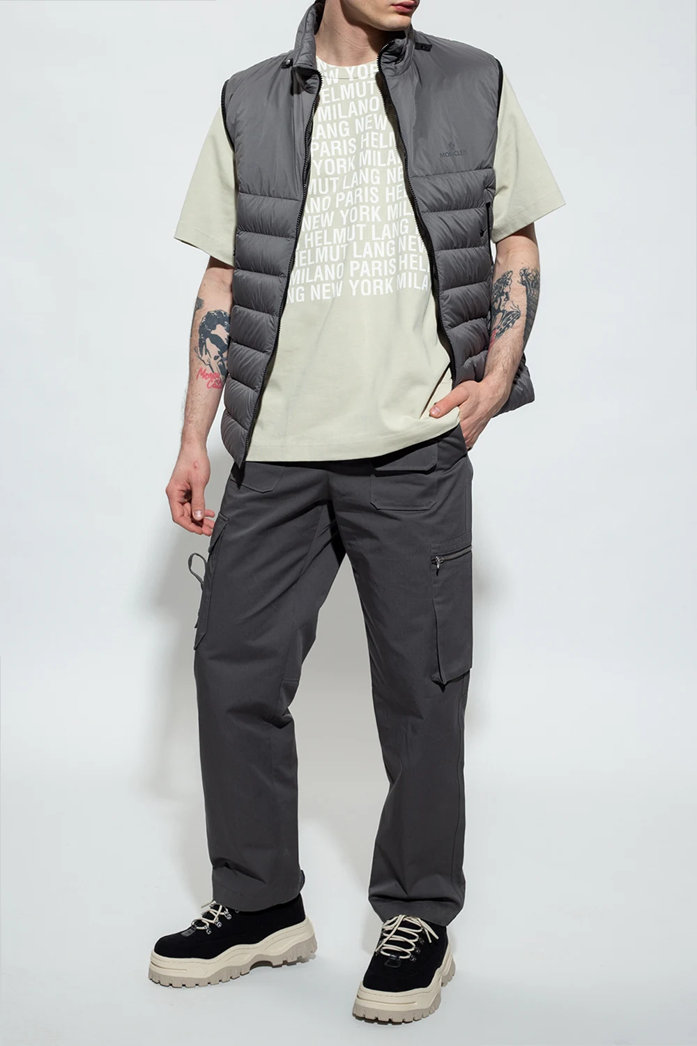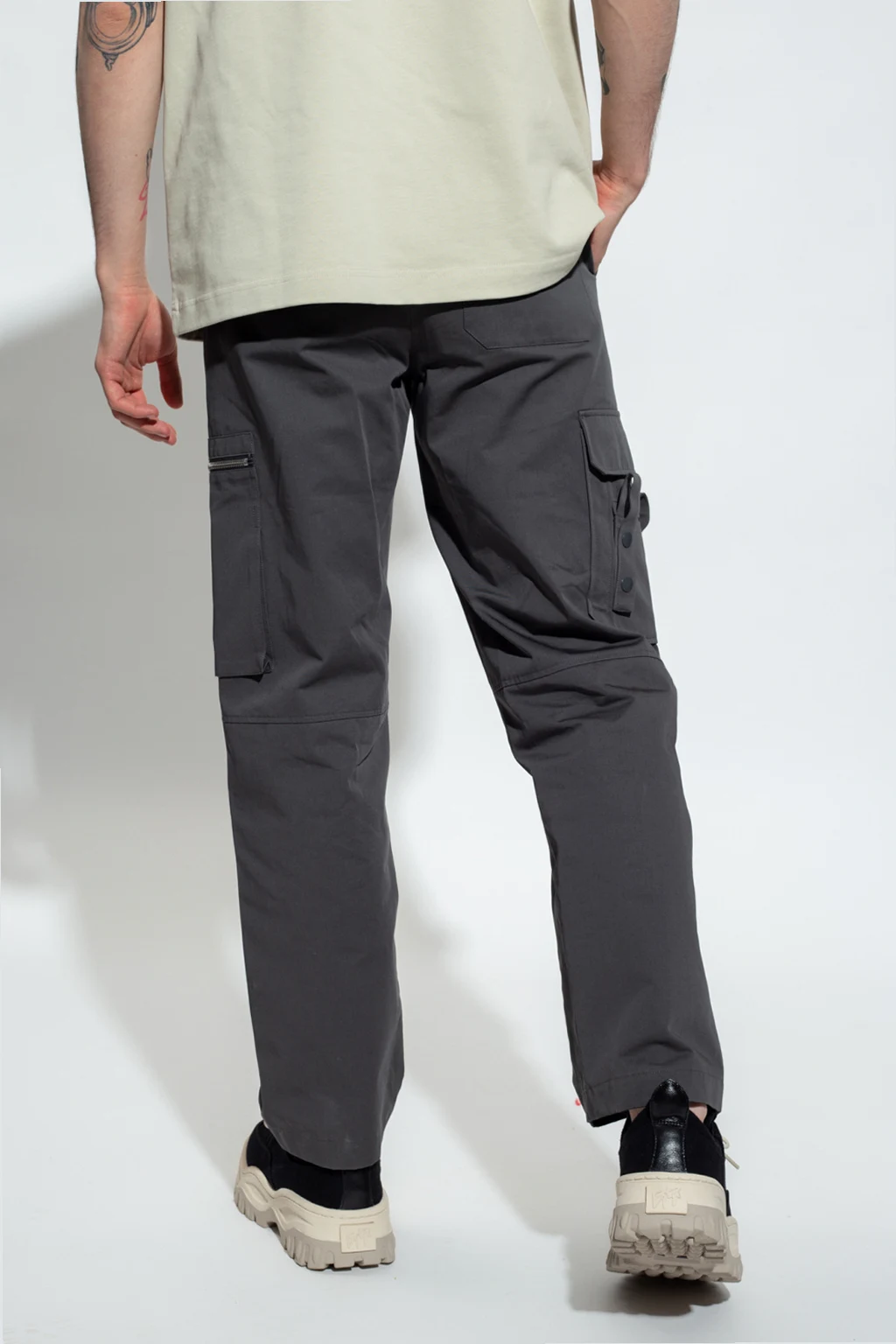 Szare, bawełniane spodnie typu ‘cargo’ Helmut Lang. Zapinane na zamek, zaczepy i guzik. Lekko zwężane nogawki.