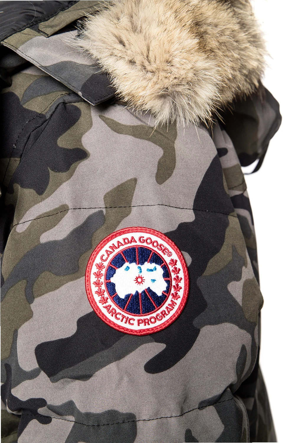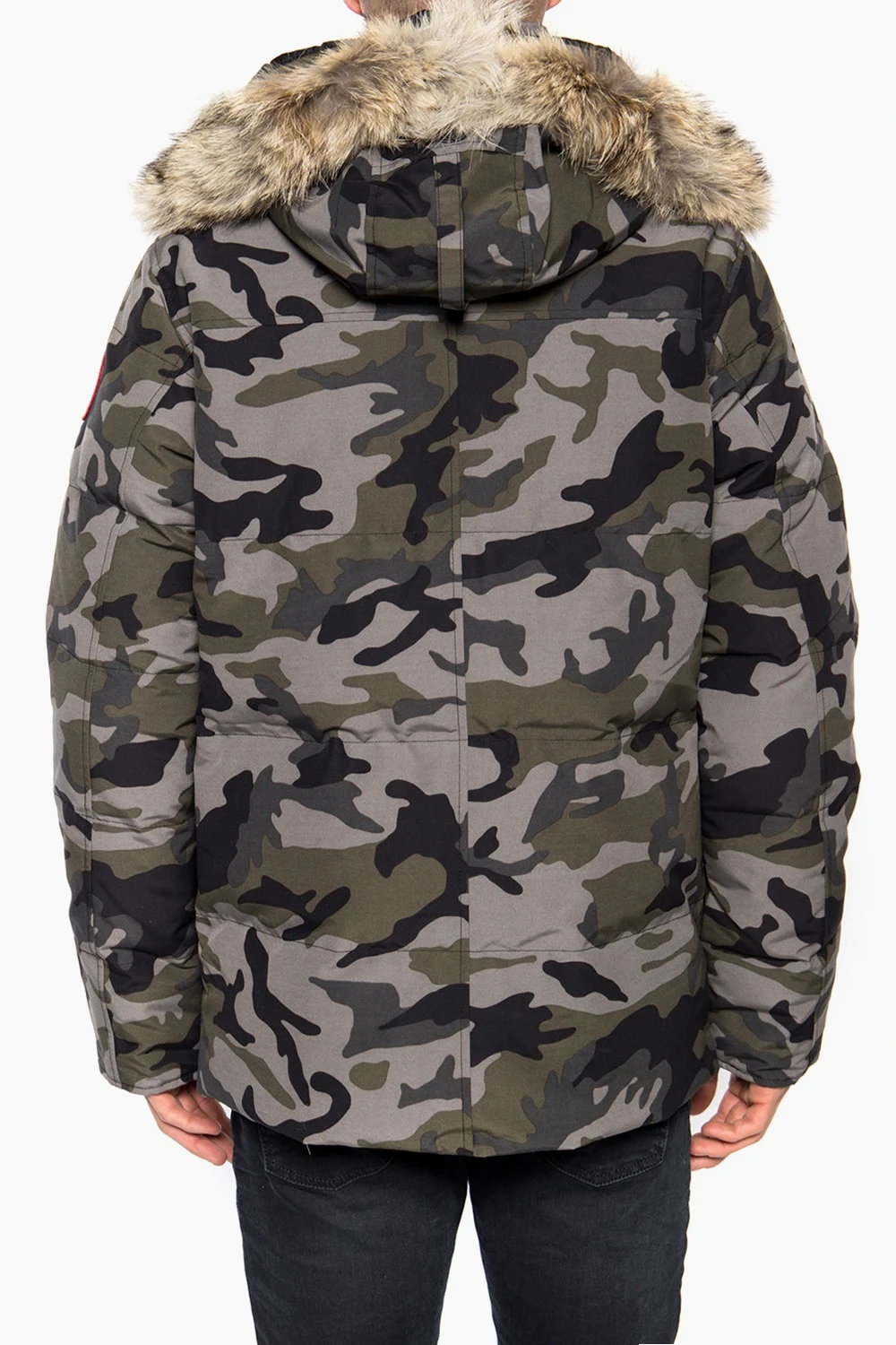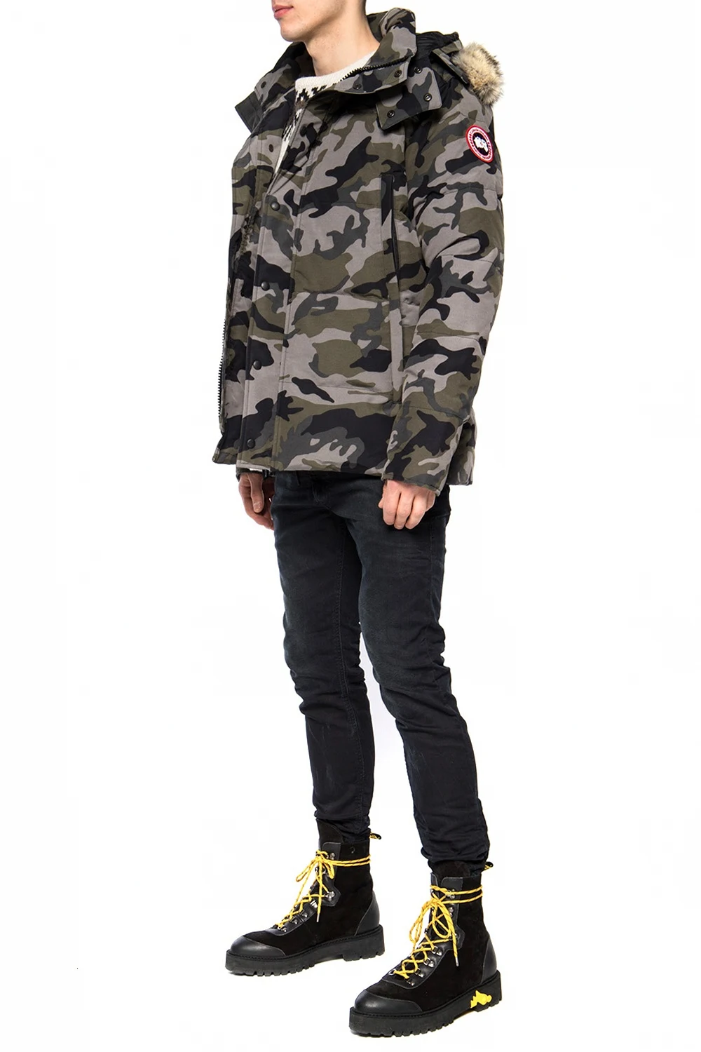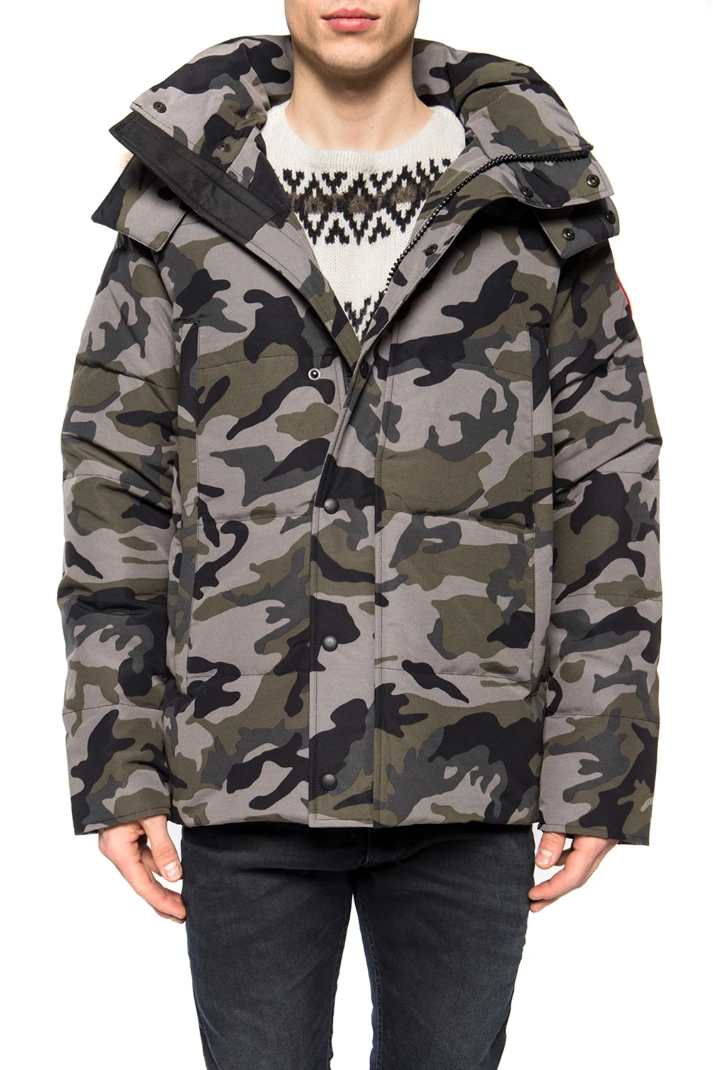 Szaro-zielono-czarna kurtka puchowa, model ‘Wyndham’ Canada Goose. Zapinana na dwubiegunowy zamek oraz zatrzaski. Ozdobiona wzorem z motywem moro. Kaptur wykończony futrem w kolorze beżowym. Z przodu cztery kieszenie zamykane na zamki. Na rękawie naszywka z logo w kolorze czerwono-niebiesko-białym.