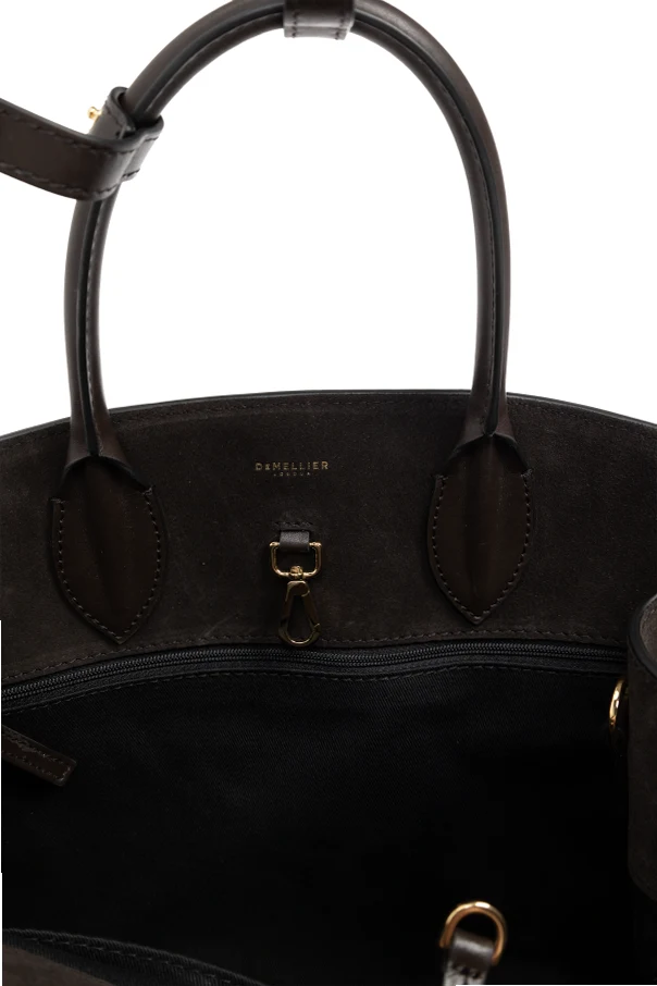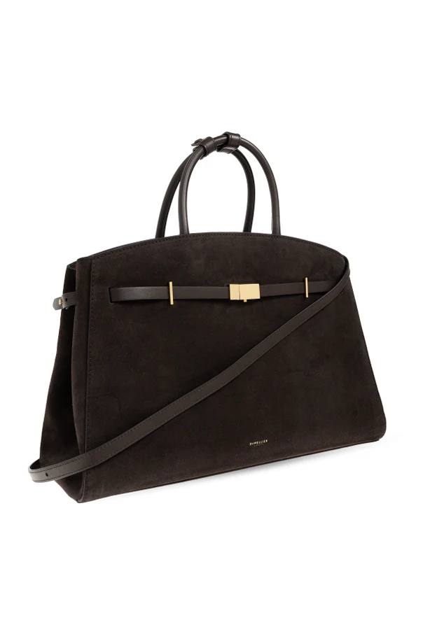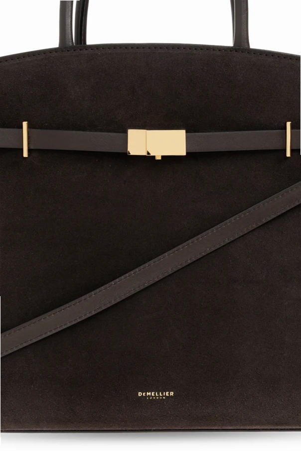 Front ozdobiony został dekoracyjnym, wąskim paskiem przewleczonym przez złote detale z centralnie osadzoną, geometryczną klamrą. Subtelne, tłoczone logo marki DeMellier podkreśla unikatowy charakter produktu, a bawełniana podszewka zapewnia trwałość i szlachetność użytkowania.