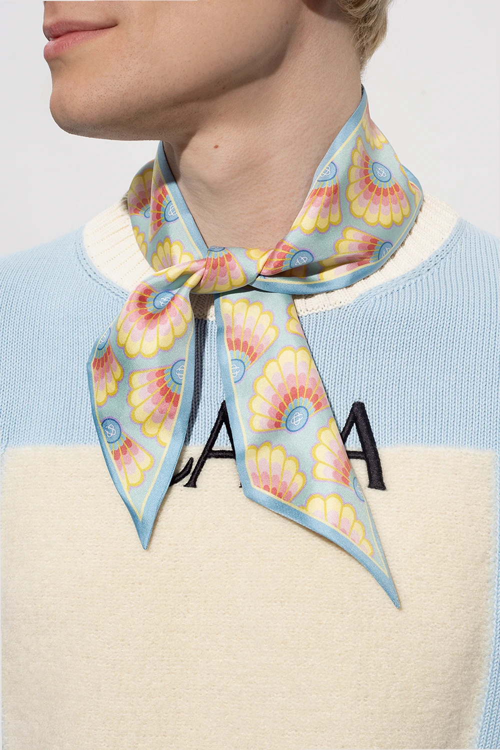 Jasnoniebieska, jedwabna apaszka Casablanca. Ozdobiona kolorowym, pastelowym wzorem z monogramem z motywem muszli, inspirowanym ruchem postmodernistycznym Memphis.