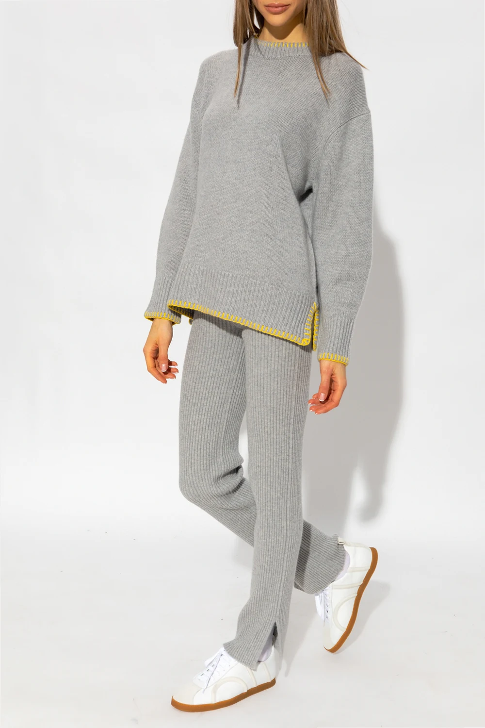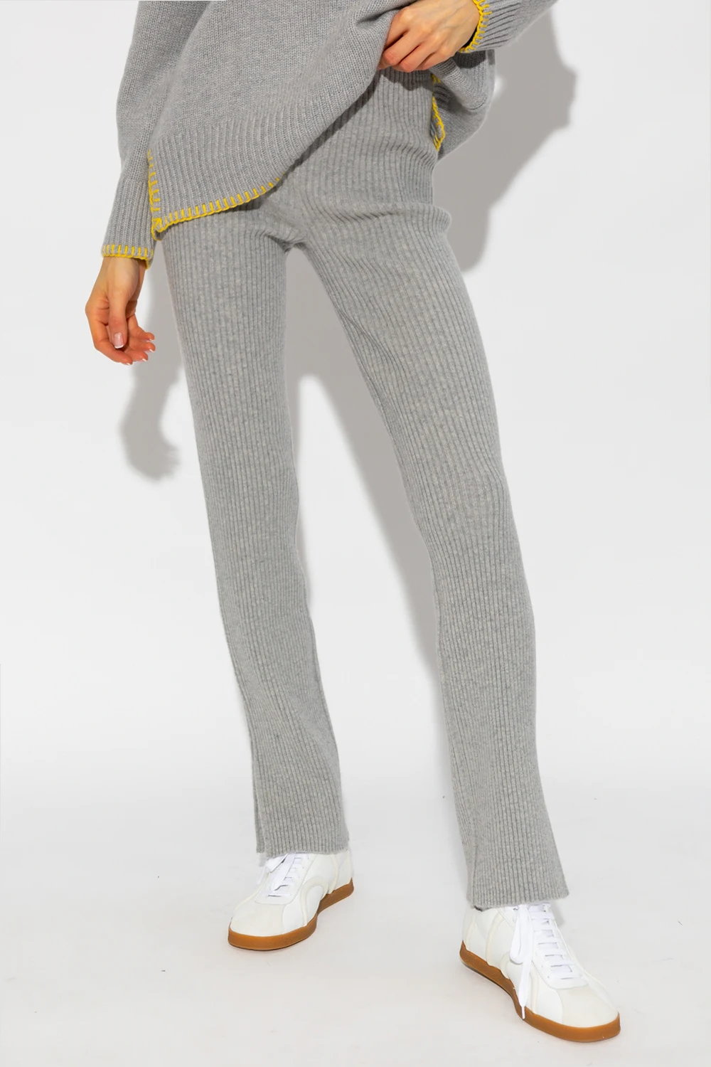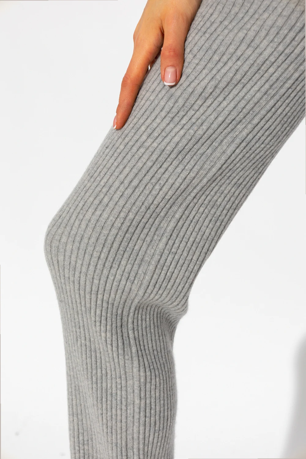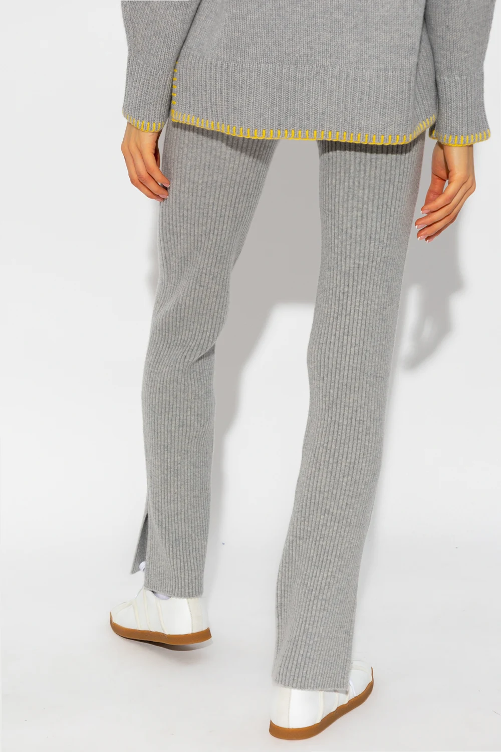 Szare, prążkowane spodnie, model ‘Detta’ Lisa Yang. Wykonane z kaszmiru. W pasie wszyta guma. Długie nogawki lekko rozszerzające się ku dołowi.
