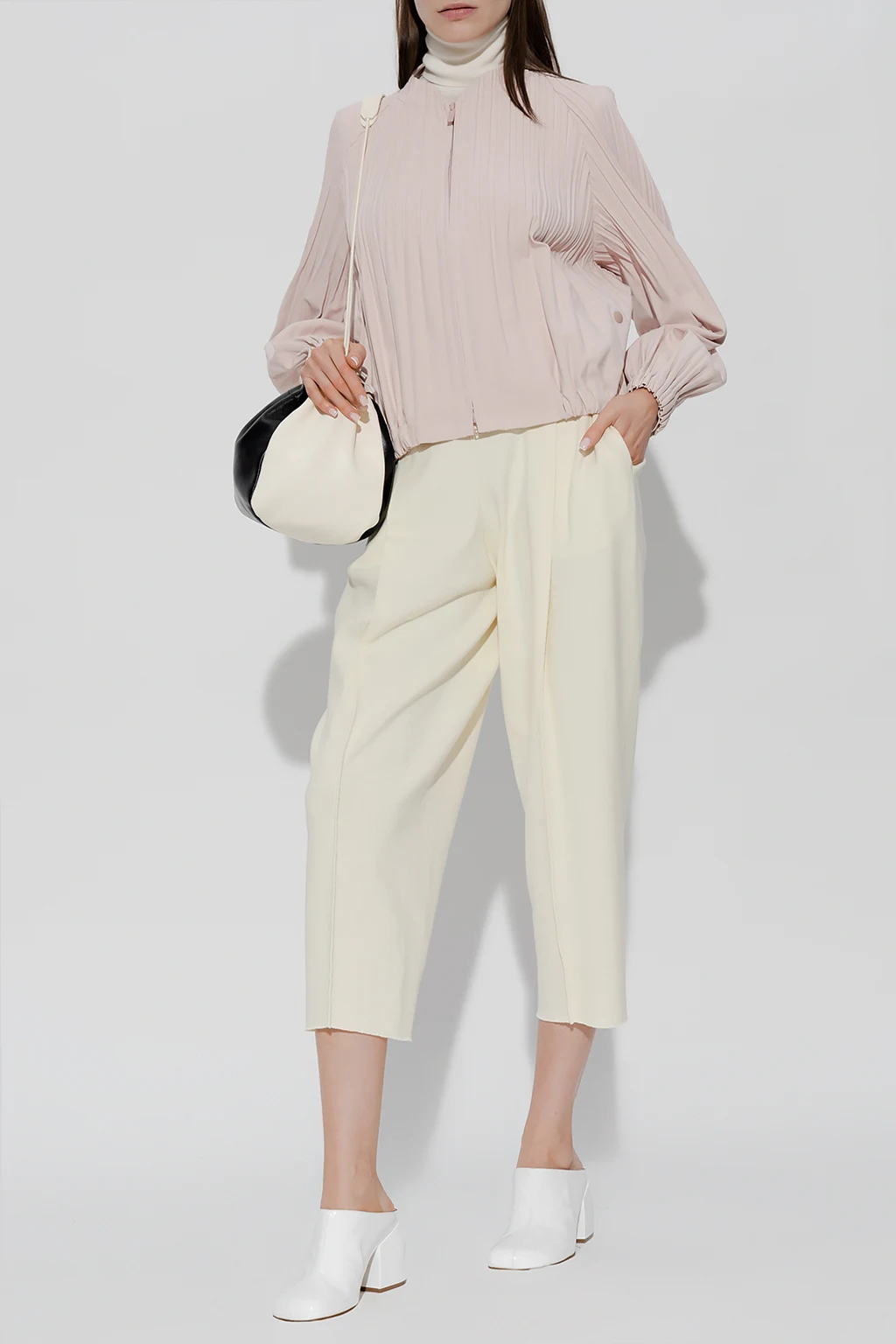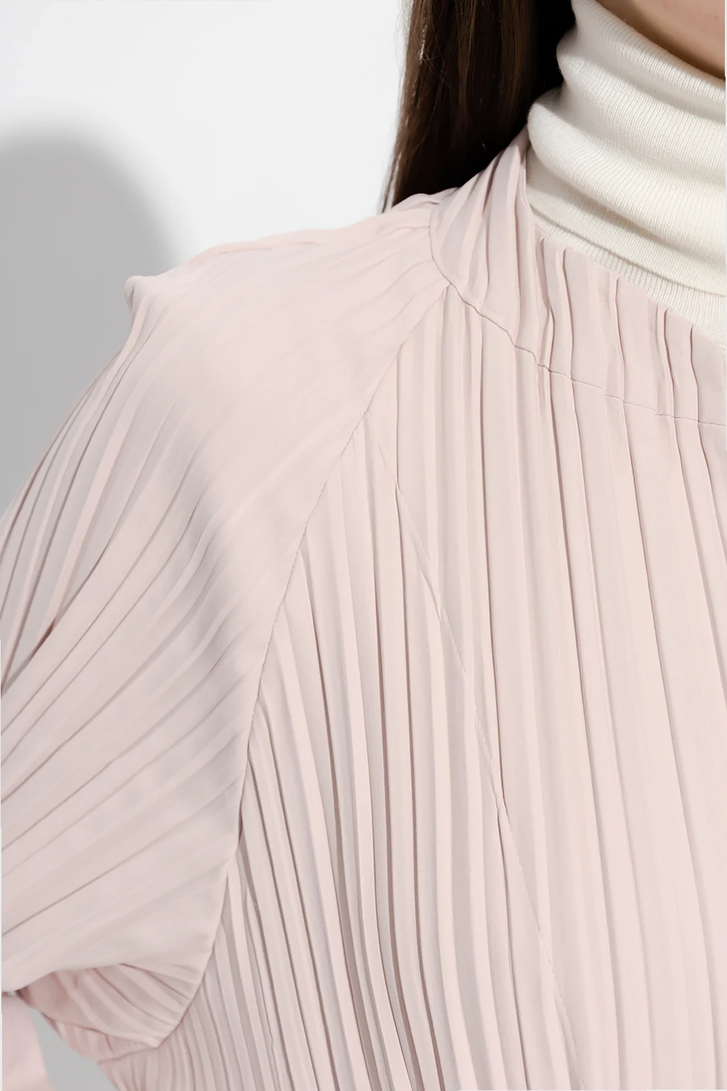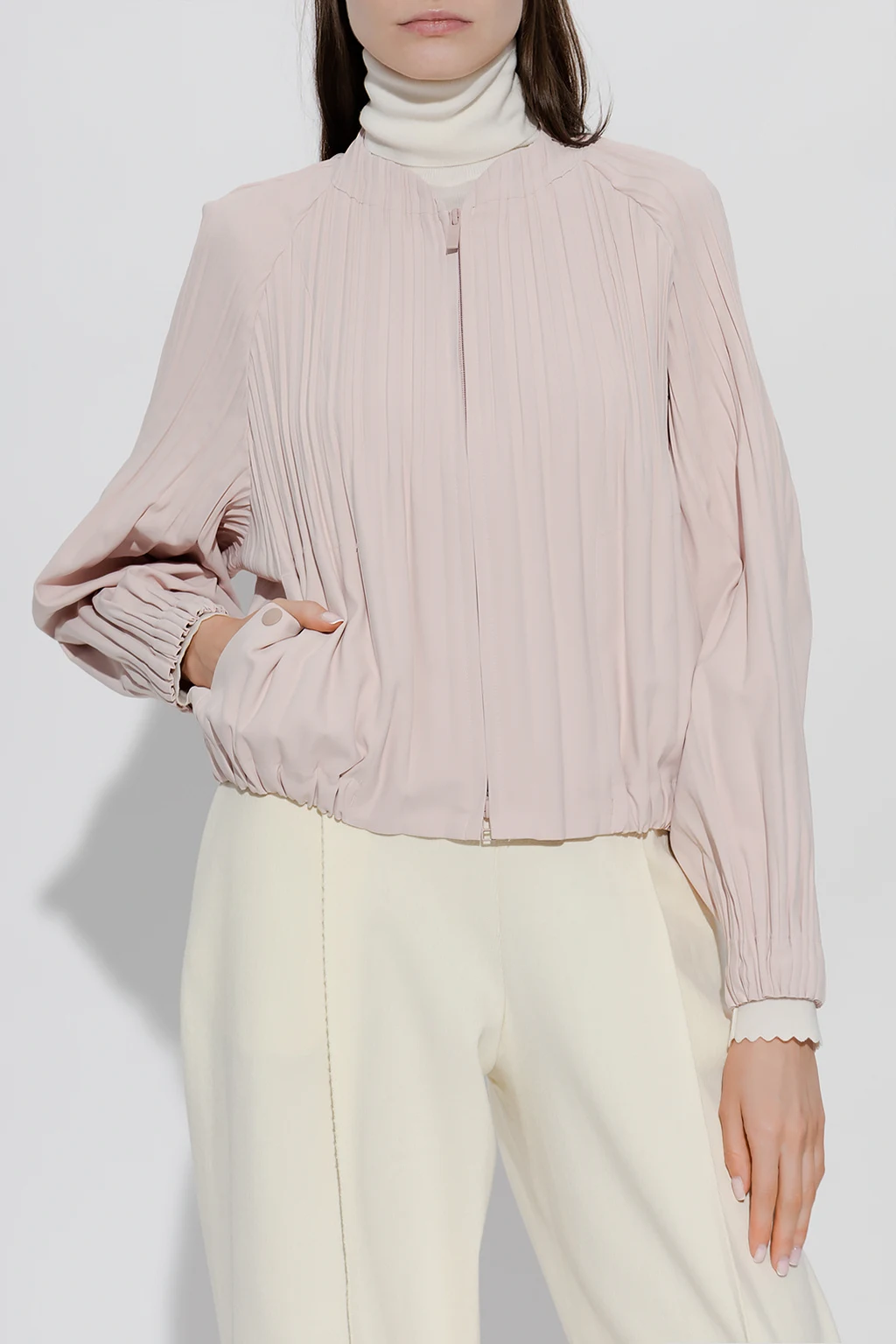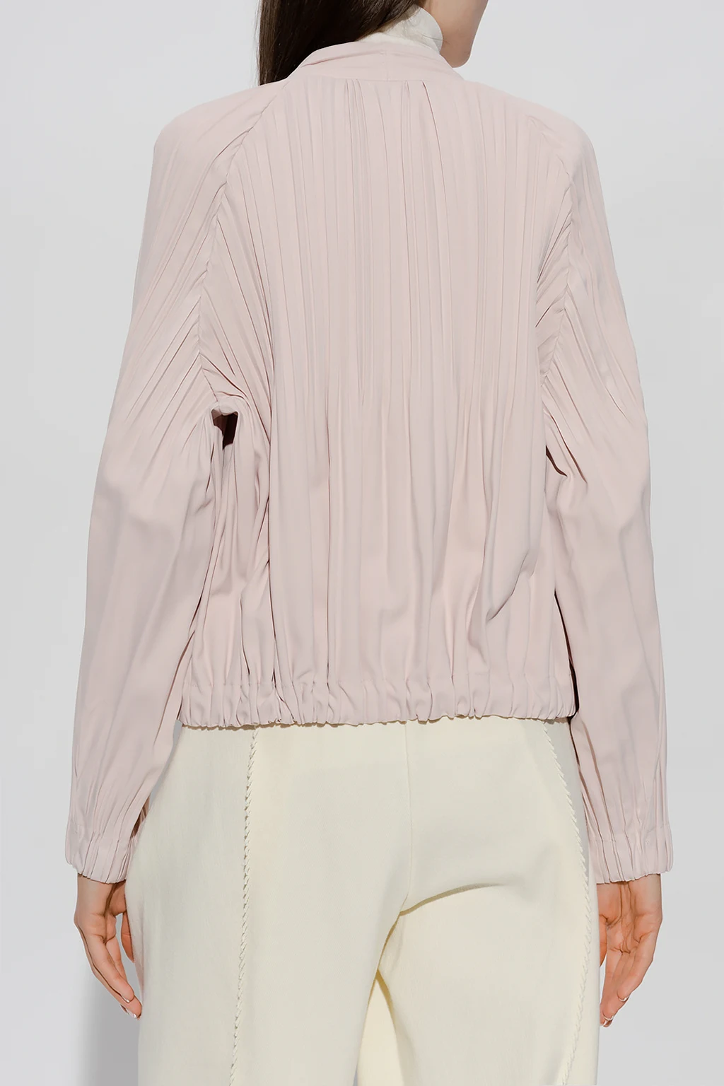Jasnoróżowa, plisowana kurtka Issey Miyake Pleats Please. Zapinana na zamek. Dwie kieszenie. Długie rękawy oraz dół wykończony ściągaczem.