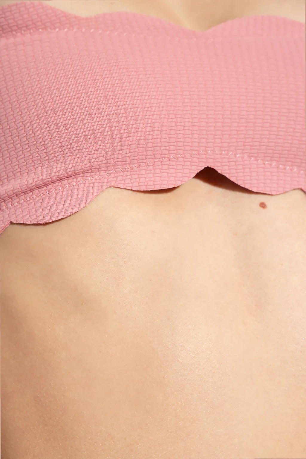 Różowa góra od kostiumu kąpielowego, model ‘Santa Monica’ Marysia. Wykonana z elastycznej teksturowanej tkaniny. Z tyłu zapinana na zaczep z wytłoczonym logo. Charakterystyczne, ręcznie wycinane brzegi.