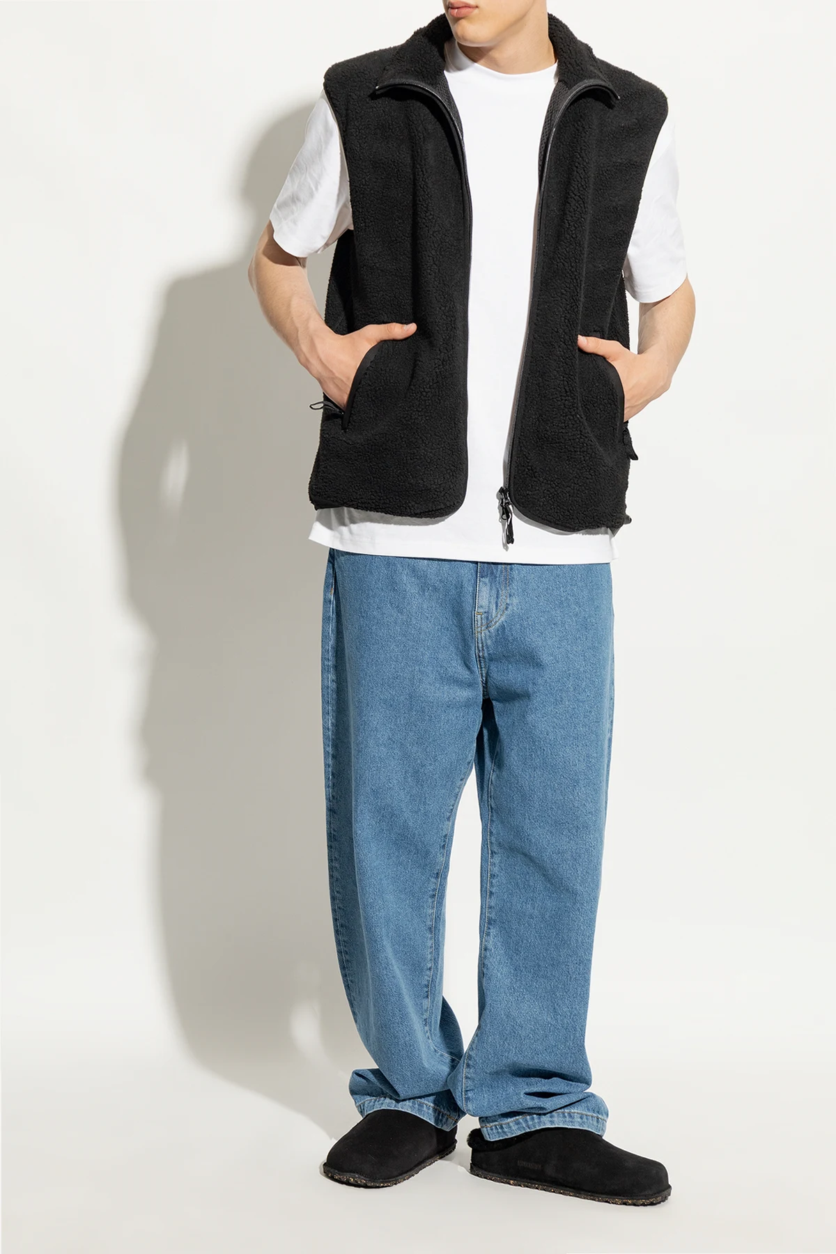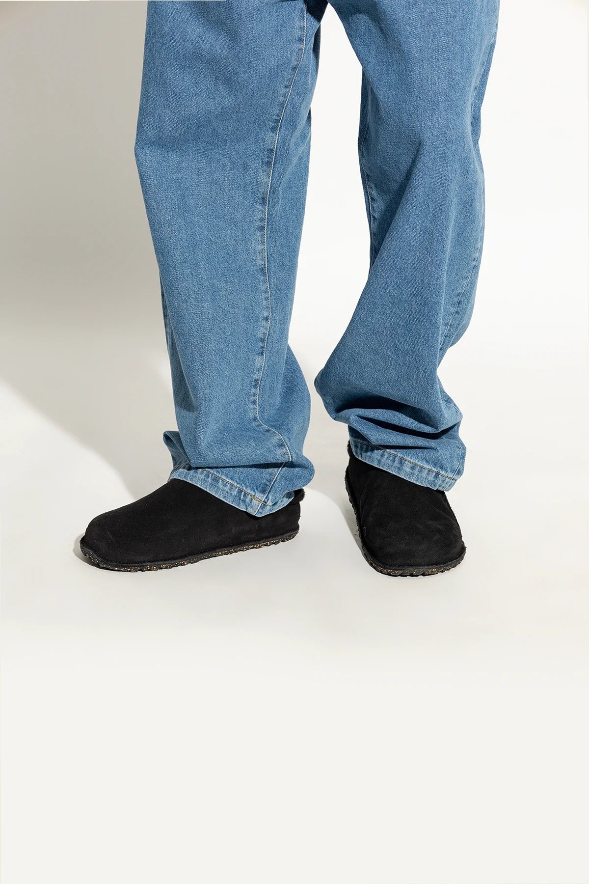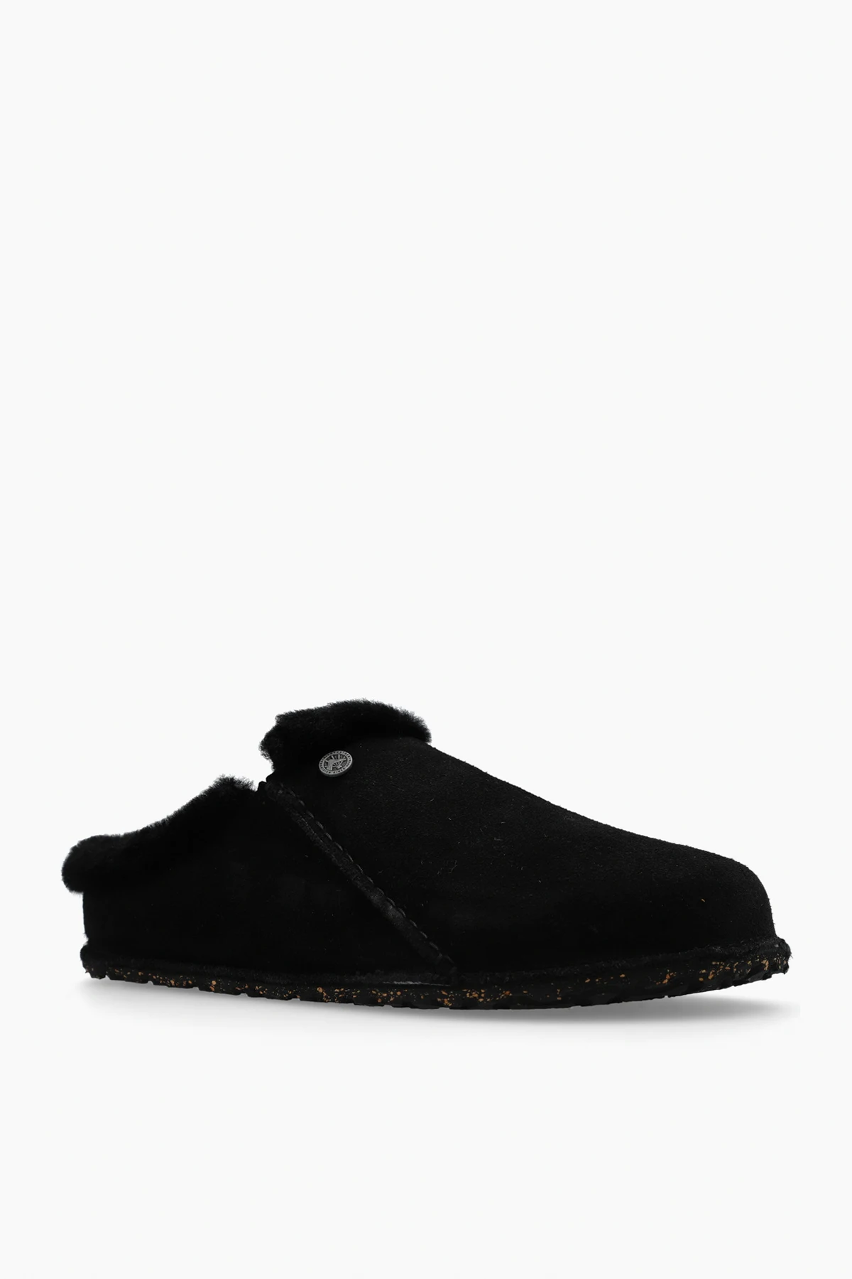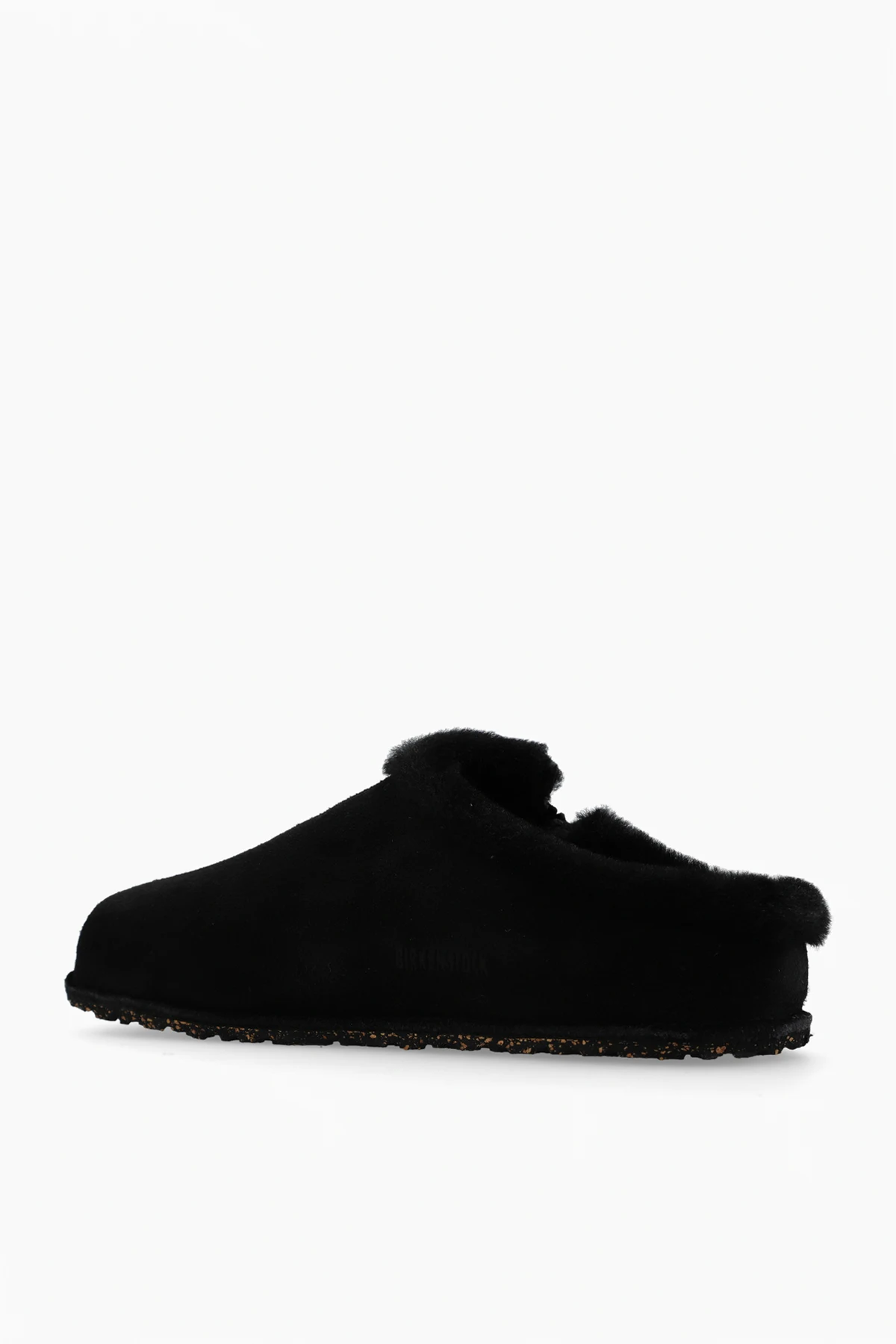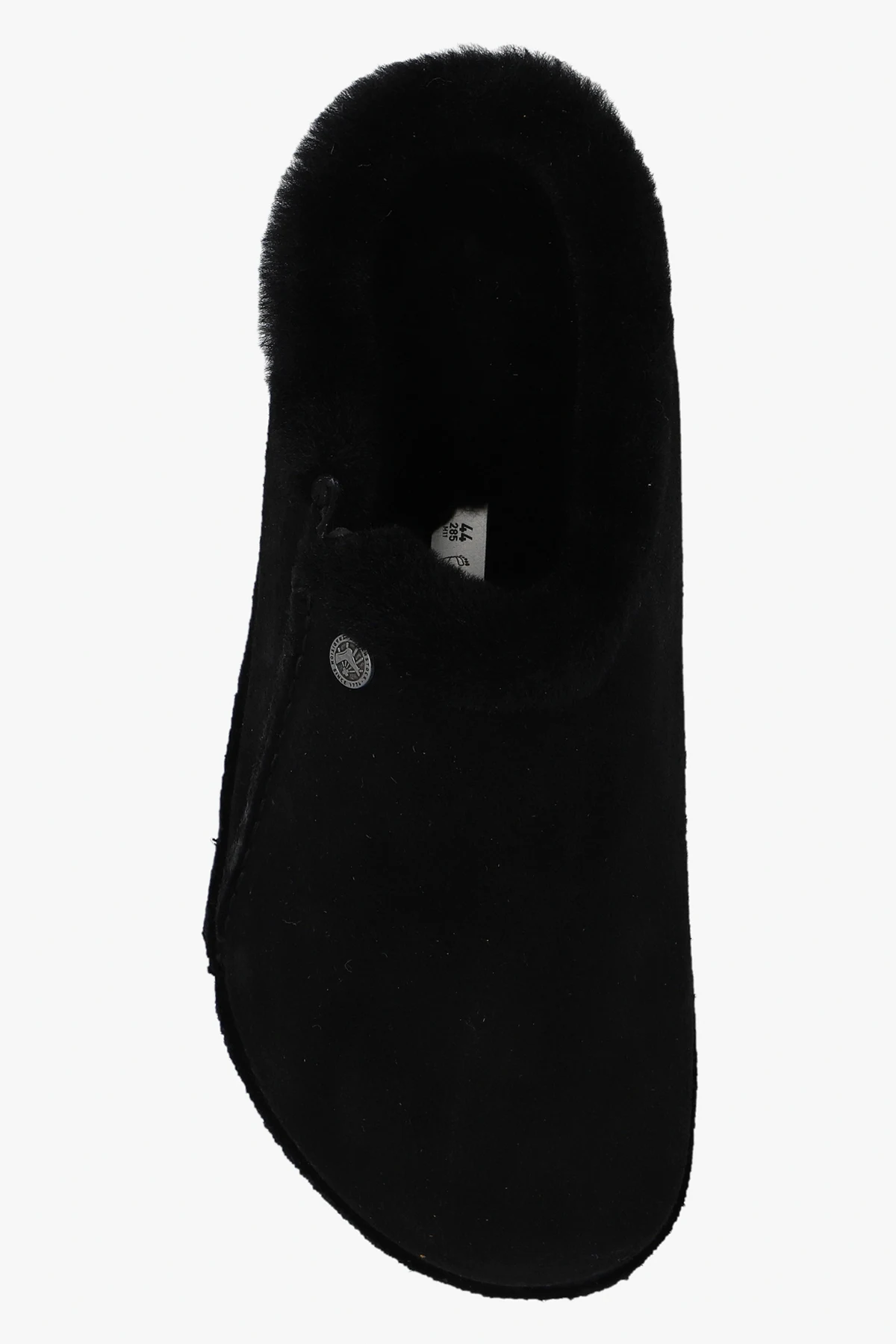 Czarne klapki, model ‘Zermatt Premium’ Birkenstock. Cholewka o standardowej szerokości wykonana z zamszu. Z boku ozdobione wytłoczonym logo. Warstwa wewnętrzna wykończona jagnięcym futrem. Anatomicznie ukształtowana wkładka korkowo-lateksowa. Czarna, gumowa podeszwa.