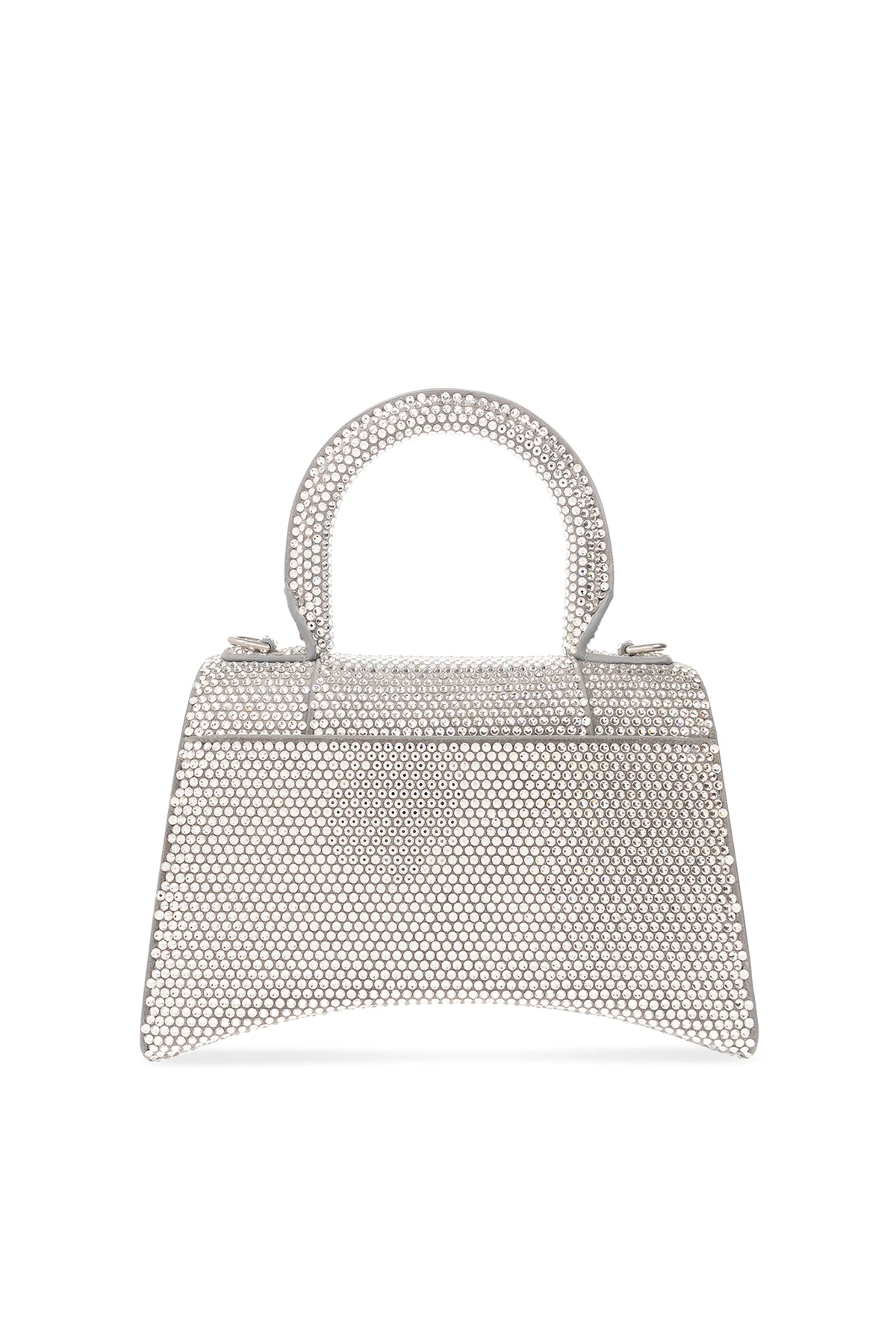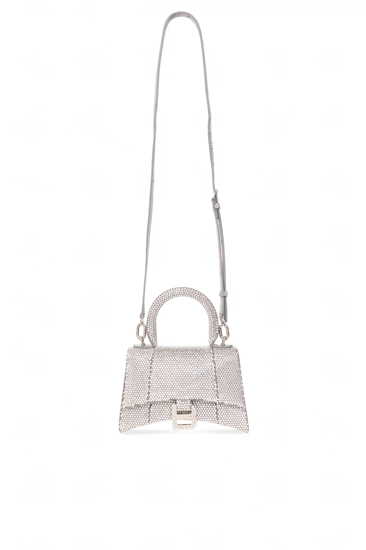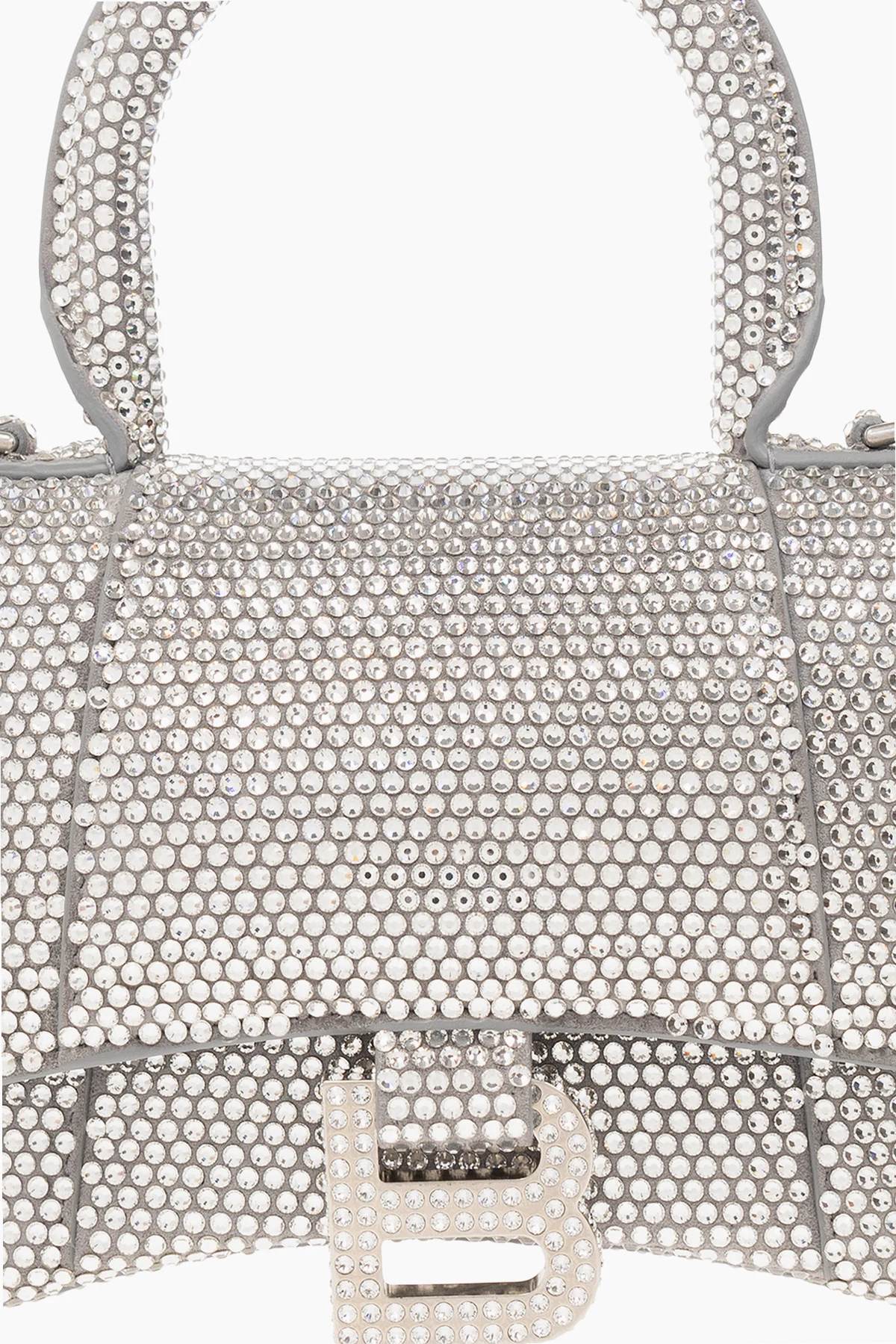 Torba na ramię w kolorze srebrnym, model 'Hourglass XS' Balenciaga. Wykonana ze skóry cielęcej w całości pokrytej połyskującymi kryształami. Zamykana na magnetyczny zatrzask. Ozdobiona metalową zawieszką z logo. Z tyłu wsuwana kieszeń. Półokrągła rączka. Odpinany, regulowany pas. Wewnątrz komora. Metalowe elementy w kolorze srebrnym.
