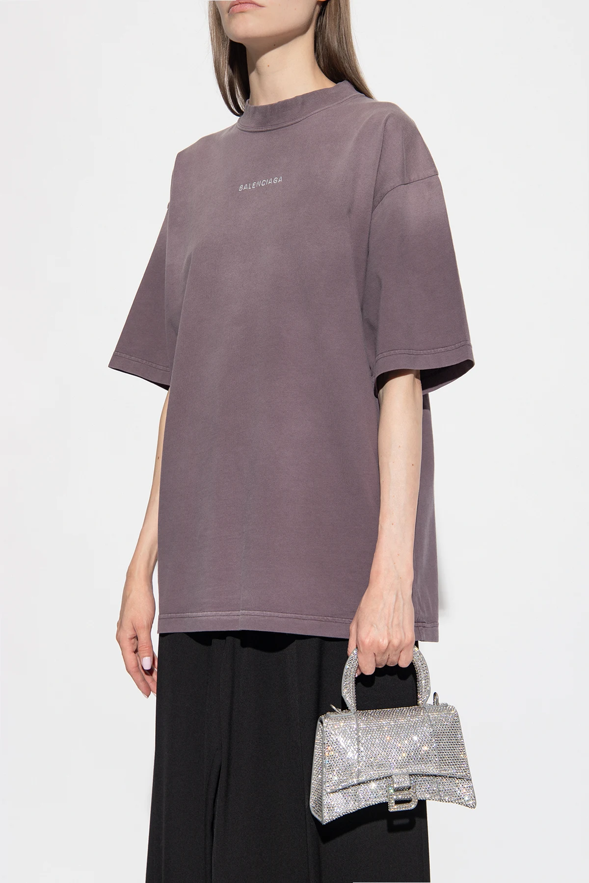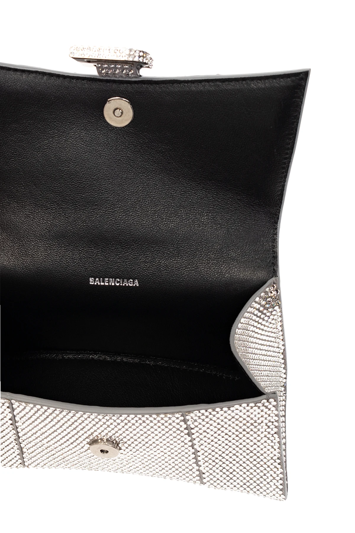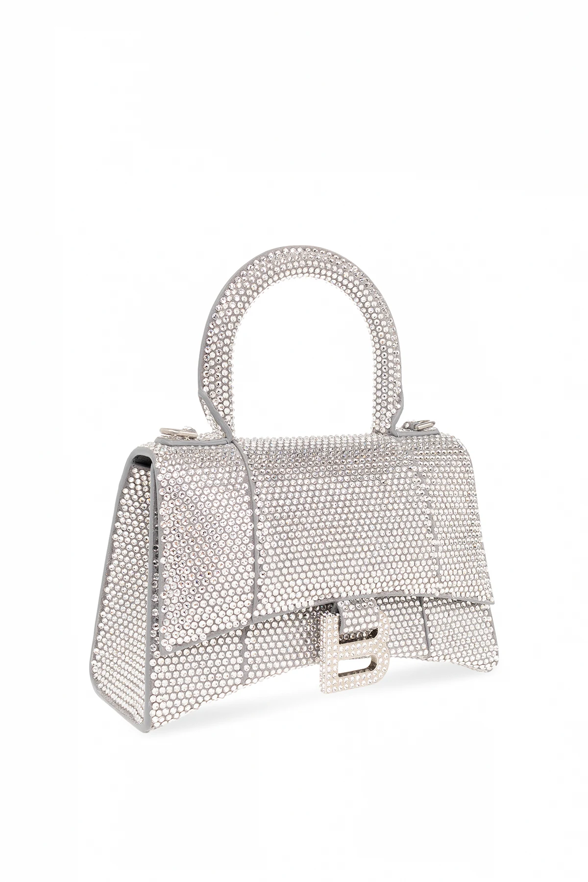 Torba na ramię w kolorze srebrnym, model 'Hourglass XS' Balenciaga. Wykonana ze skóry cielęcej w całości pokrytej połyskującymi kryształami. Zamykana na magnetyczny zatrzask. Ozdobiona metalową zawieszką z logo. Z tyłu wsuwana kieszeń. Półokrągła rączka. Odpinany, regulowany pas. Wewnątrz komora. Metalowe elementy w kolorze srebrnym.