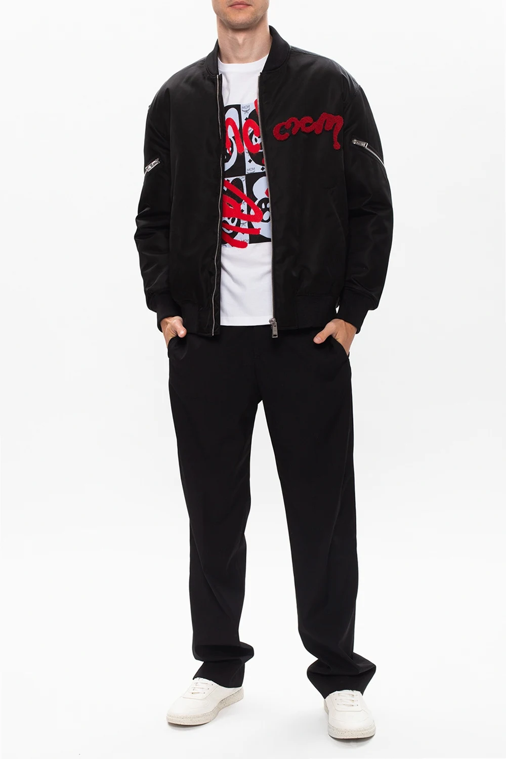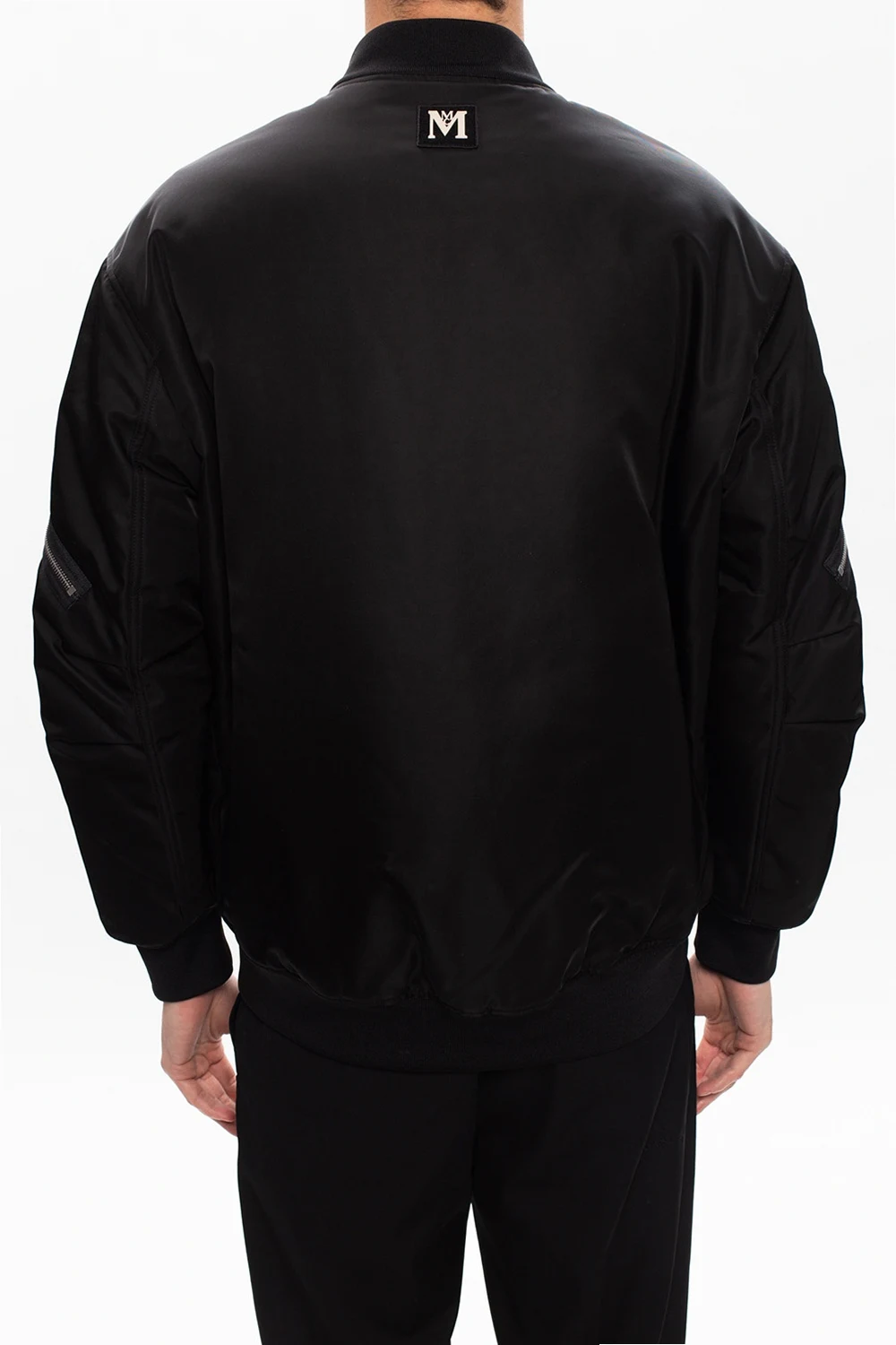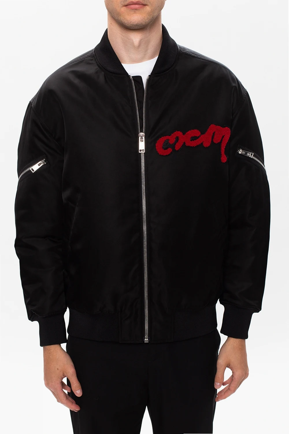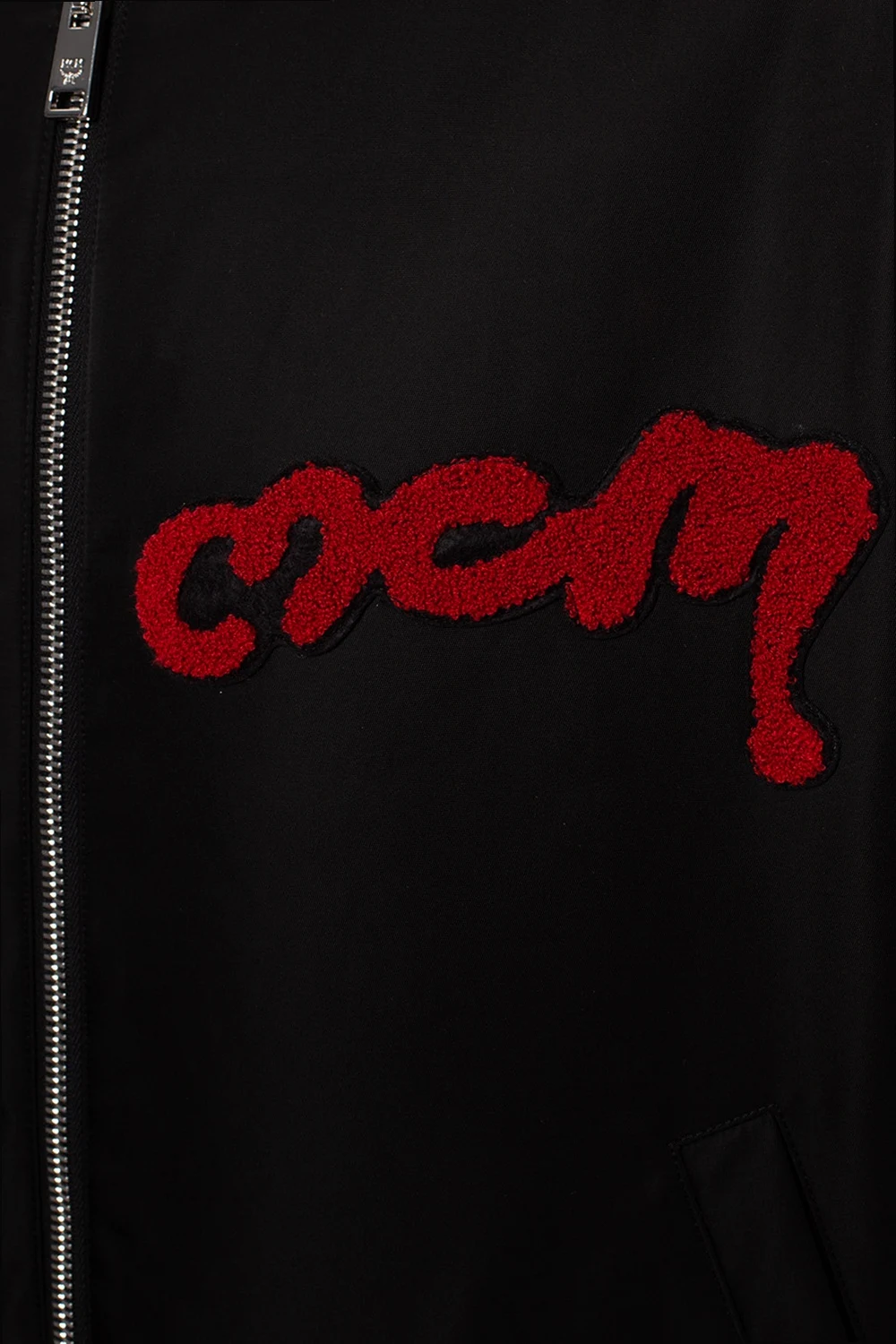 Czarna kurtka typu ‘bomber’ MCM. Zapinana na zamek. Ozdobiona dekoracyjną, czerwoną naszywką z logo o specjalnej fakturze. Dwie wsuwane kieszenie. Na rękawach dwie zapinane na zamki. Kołnierz, dół i rękawy zakończone ściągaczem.