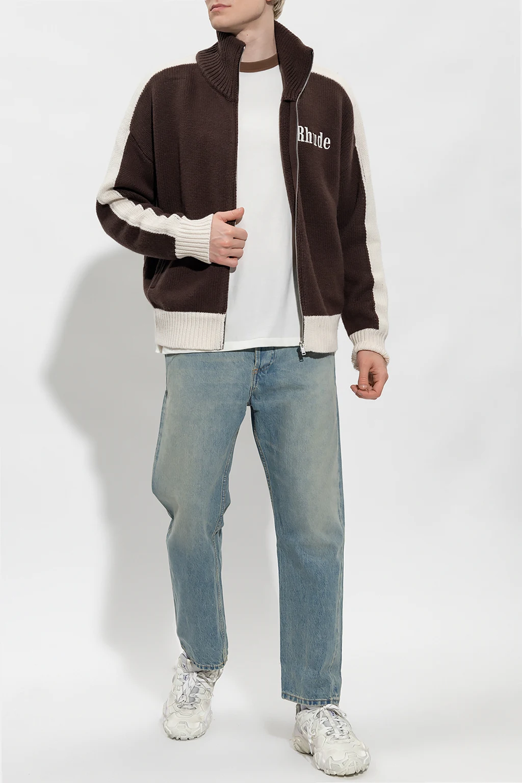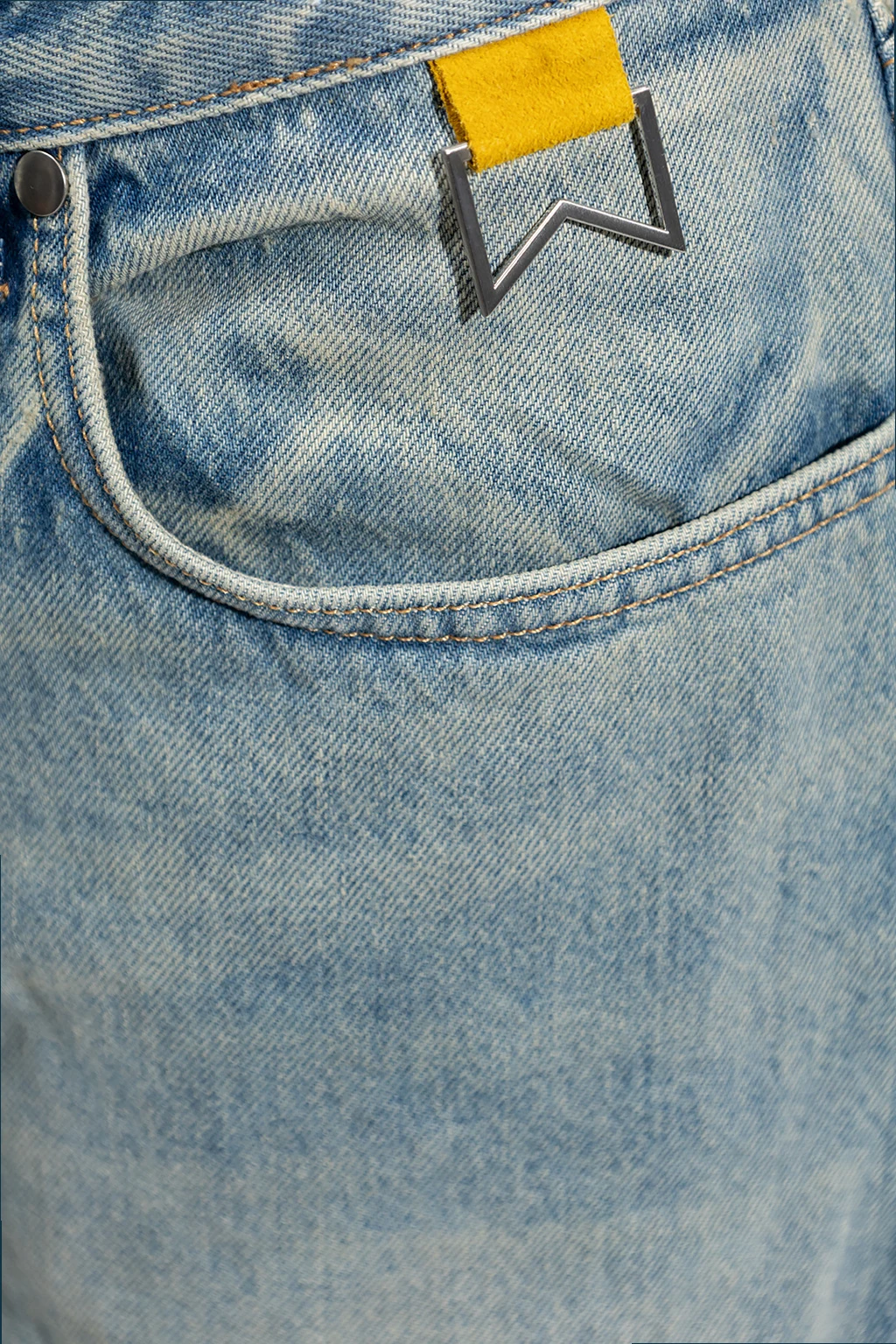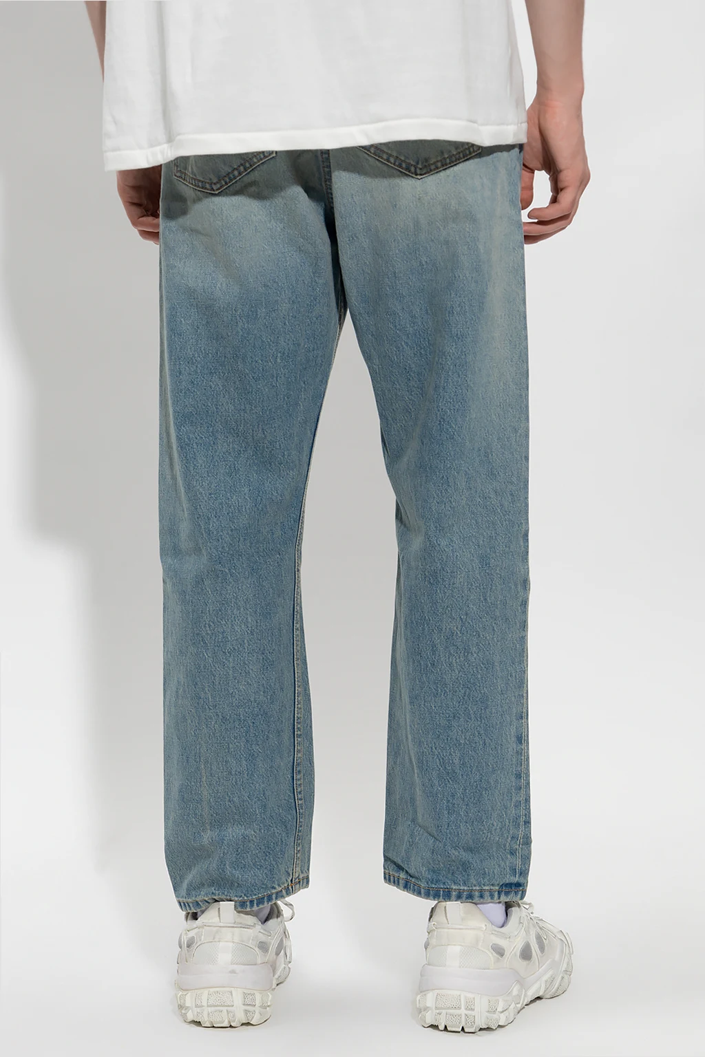 Niebieskie jeansy Rhude. Zapinane na guziki. Ozdobione aplikacją w kolorze srebrnym z wygrawerowanym logo. Pięć kieszeni: trzy z przodu i dwie wsuwane z tyłu. Lekko zwężane nogawki.
