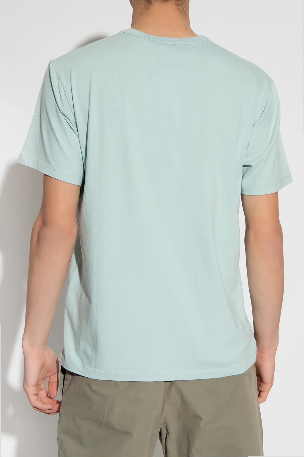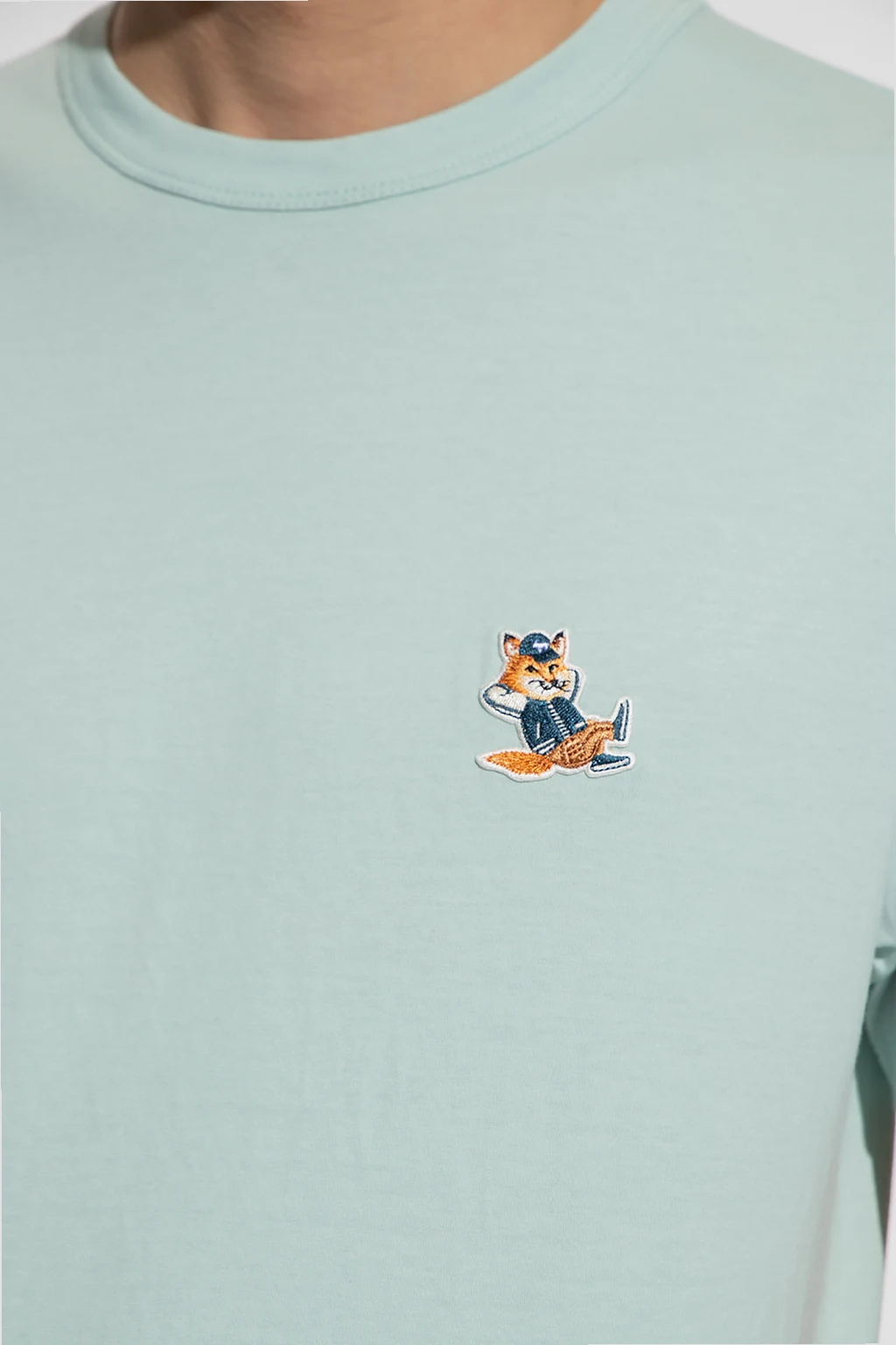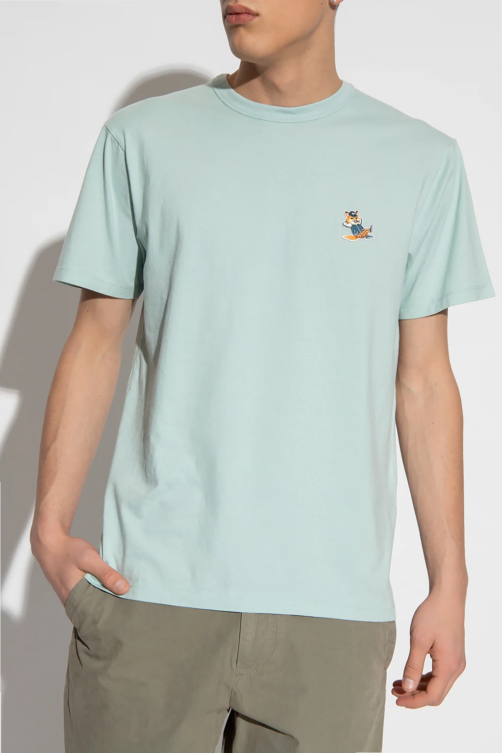 Niebieski t-shirt Maison Kitsune. Wykonany z bawełny. Ozdobiony naszywką z logo. Okrągły dekolt wykończony ściągaczem. Krótkie rękawy.