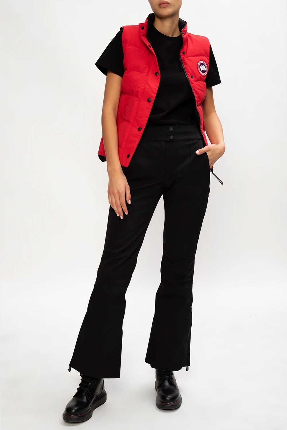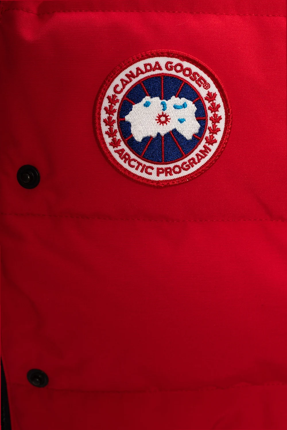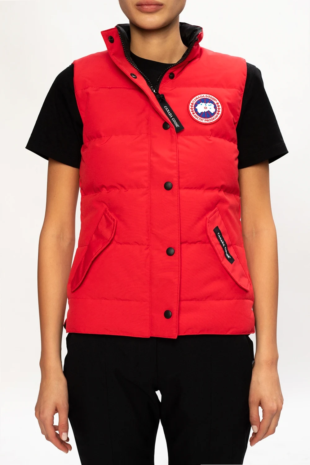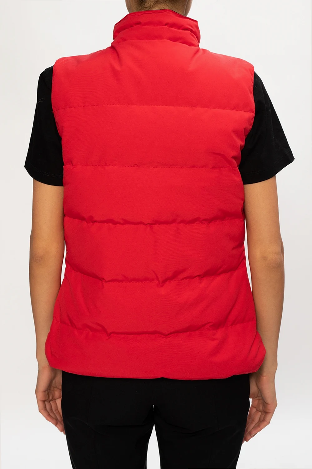 Czerwona, pikowana kamizelka puchowa, model 'Freestyle' Canada Goose. Zapinana na zamek i zatrzaski. Ozdobiona naszywką z logo w kolorze biało-granatowym. Z przodu dwie kieszenie z patką zapinane na zatrzaski.