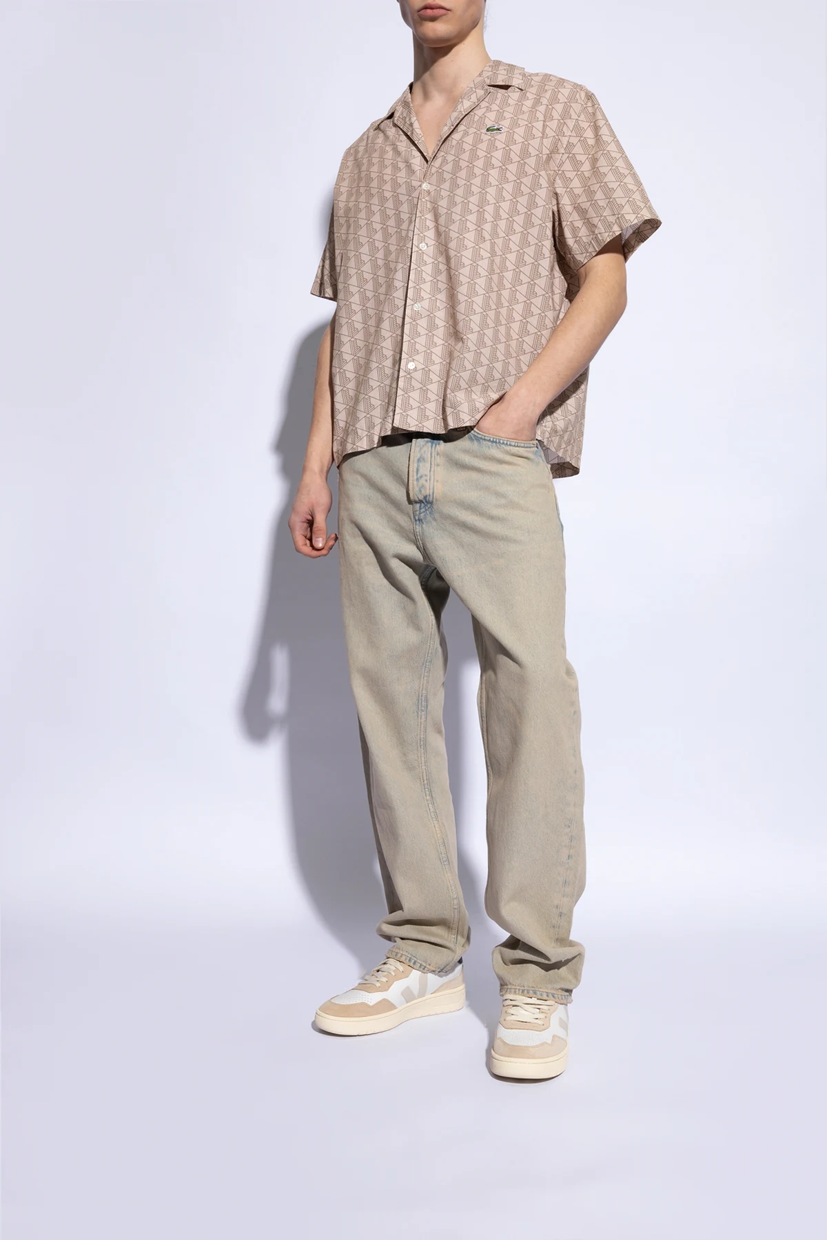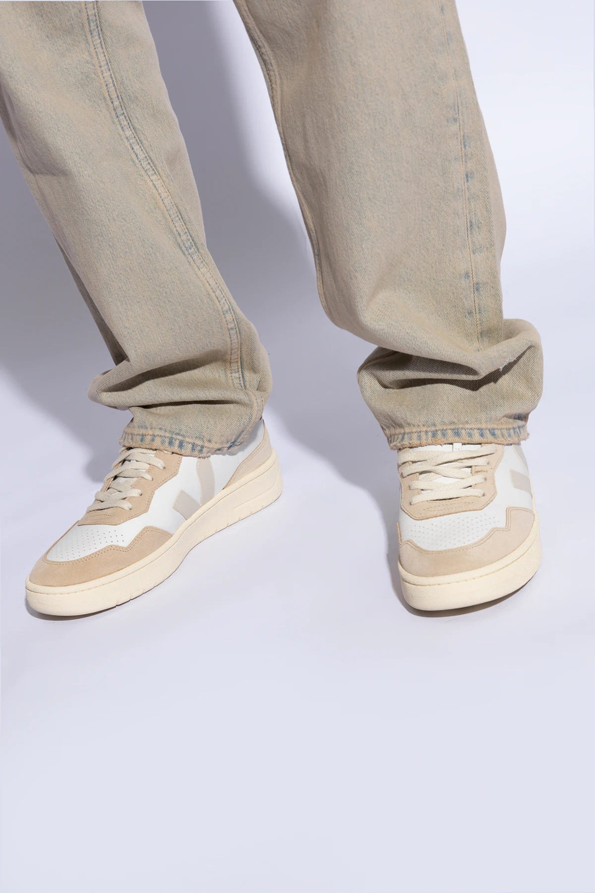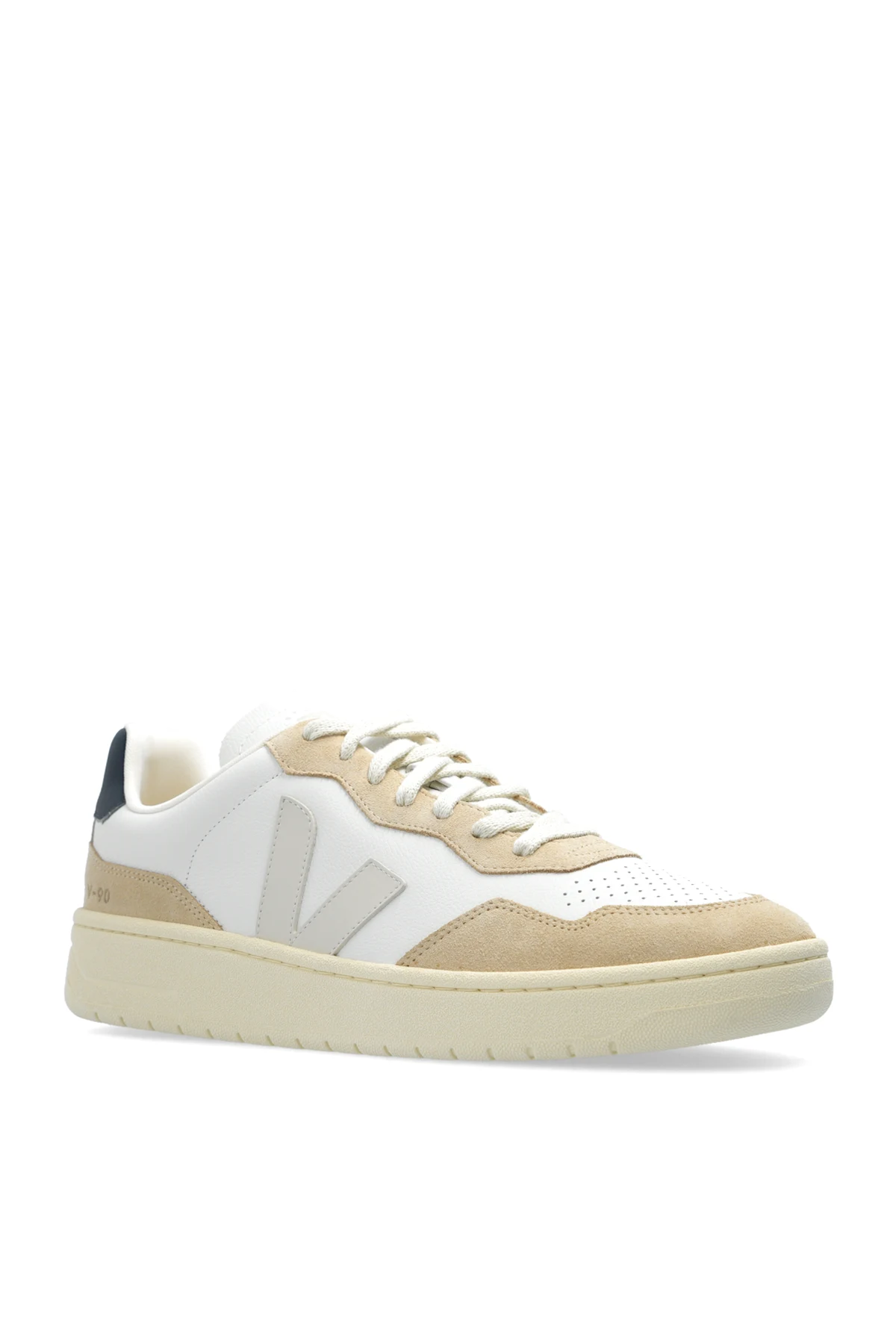 Prezentujemy Państwu buty sportowe ‘V-90’ od renomowanej marki Veja , które stanowią kwintesencję elegancji połączonej z nowoczesnością. Model ten charakteryzuje się wyjątkowym designem, gdzie dominujący biały kolor harmonijnie współgra z beżowymi i szarymi akcentami, a charakterystyczna naszywka z logo "V" nadaje obuwiu rozpoznawalny charakter.