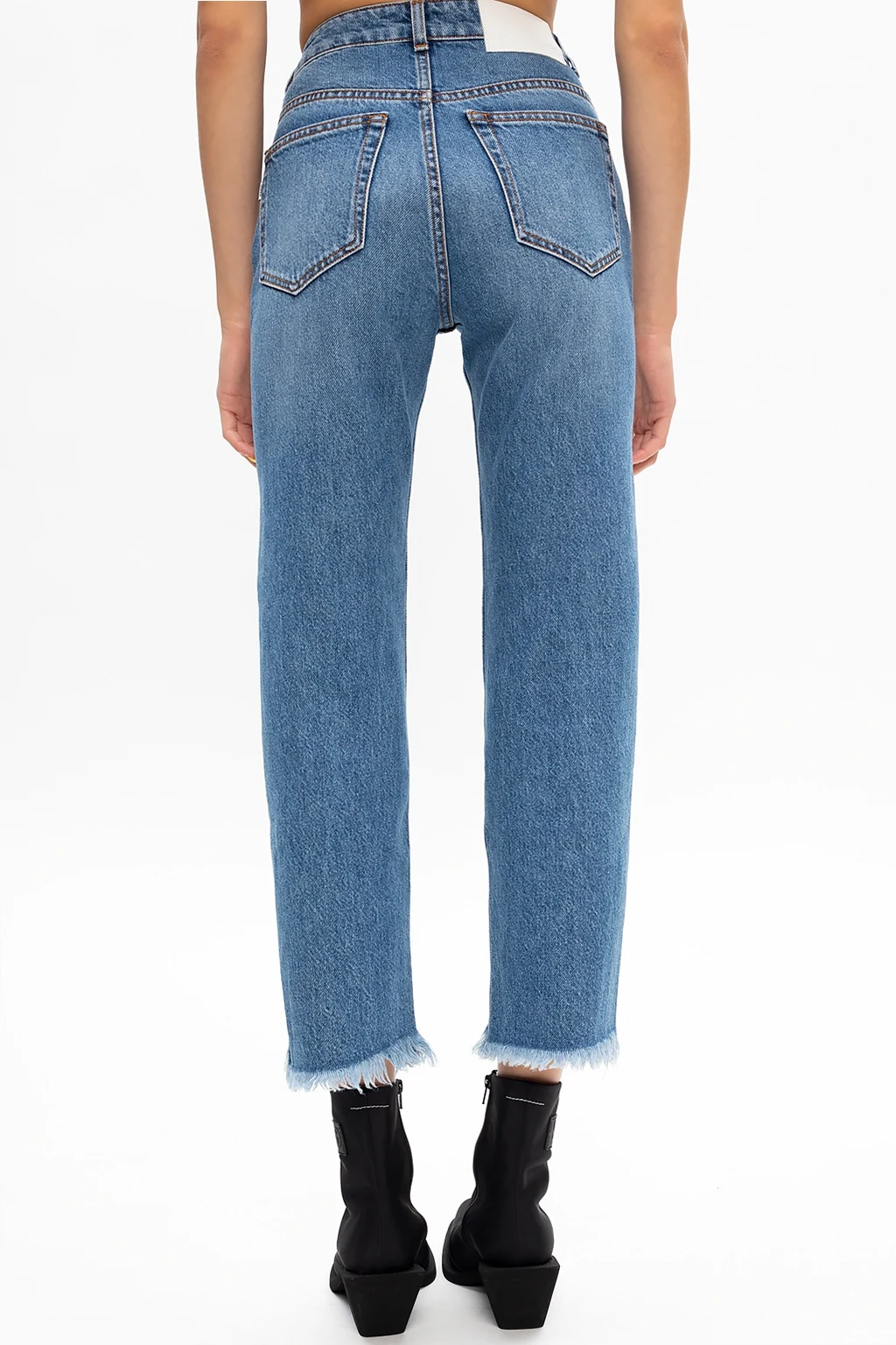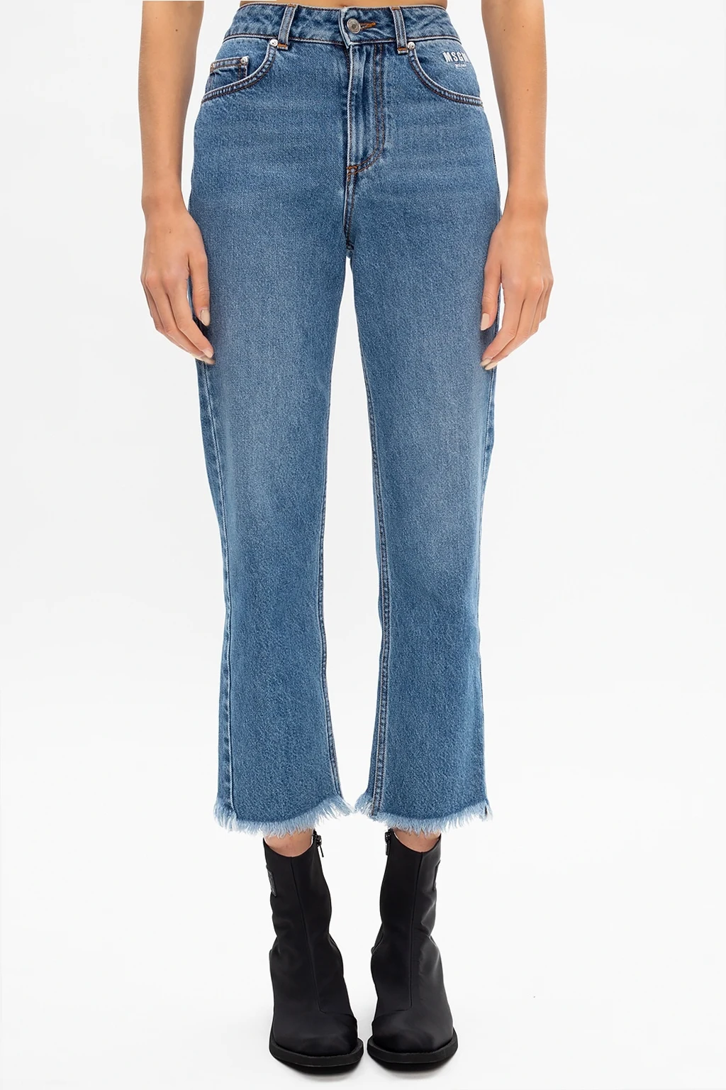 Granatowe jeansy MSGM. Zapinane na guzik. Ozdobione wyszytym logo w kolorze białym oraz naszywką z logo. Pięć wsuwanych kieszeni. Nogawki z surowym wykończeniem.