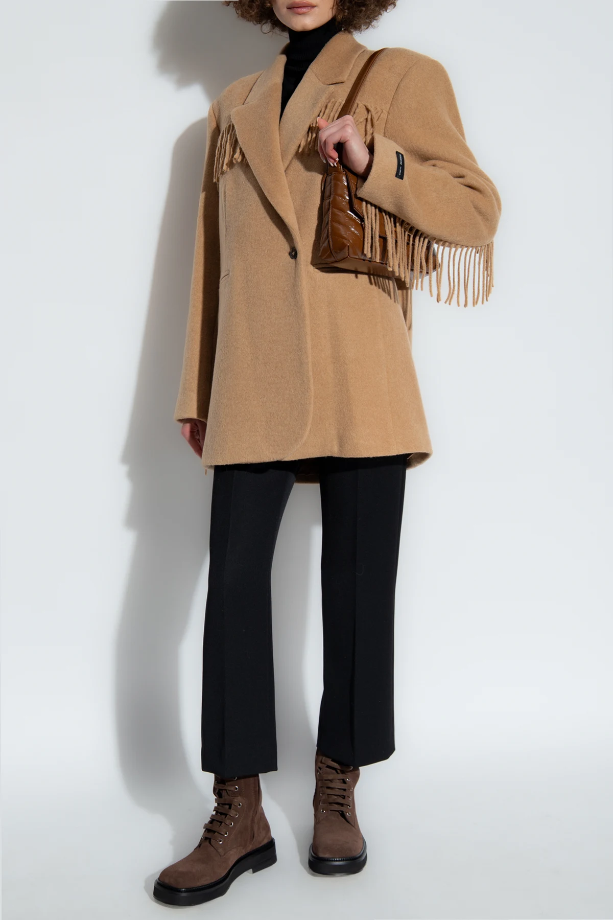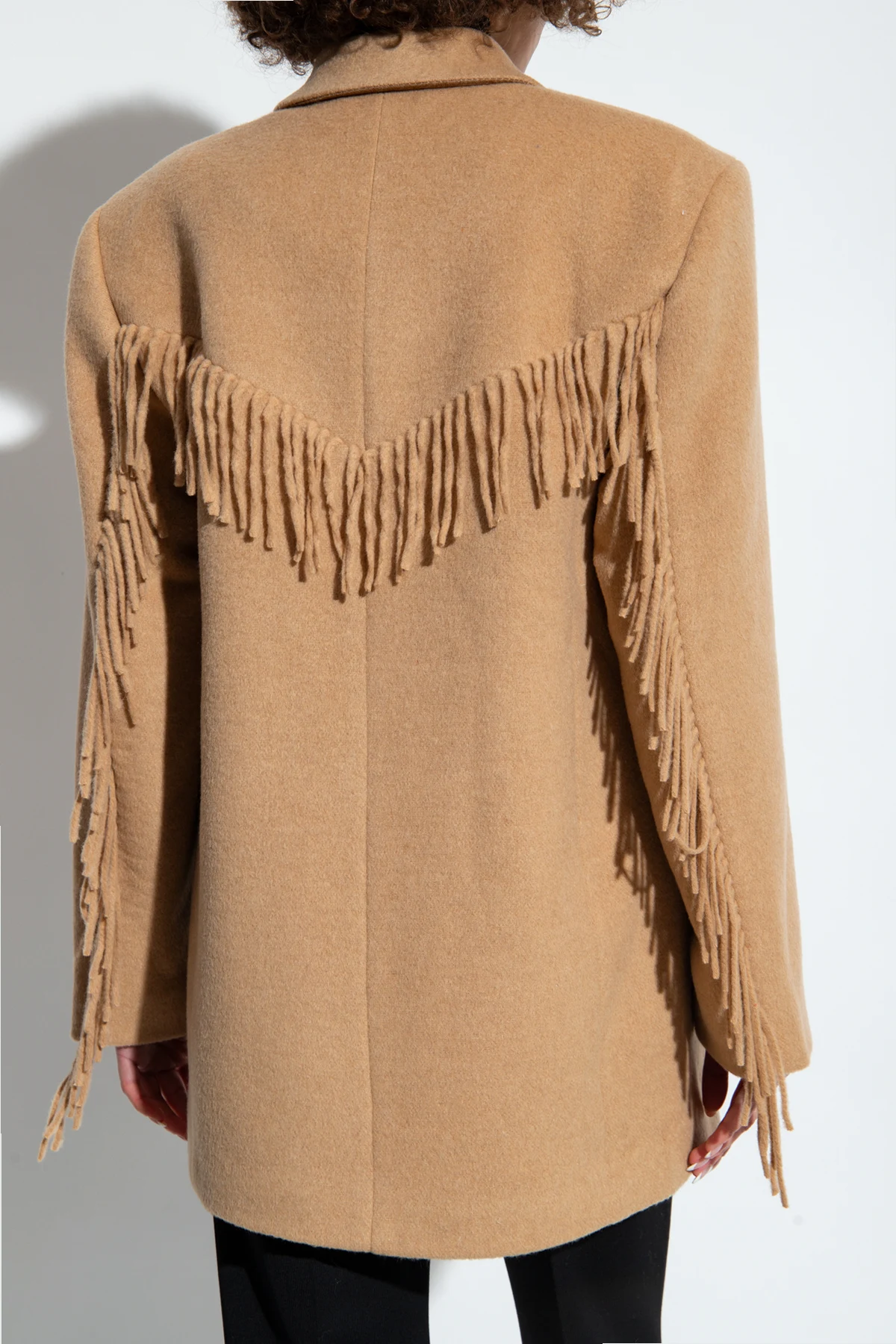 Beżowy, krótki płaszcz, model ‘Alice’ Lemaire. Zapinany na guzik. Ozdobiony frędzlami. Dwie wsuwane kieszenie. Otwarte klapy. Długie rękawy.