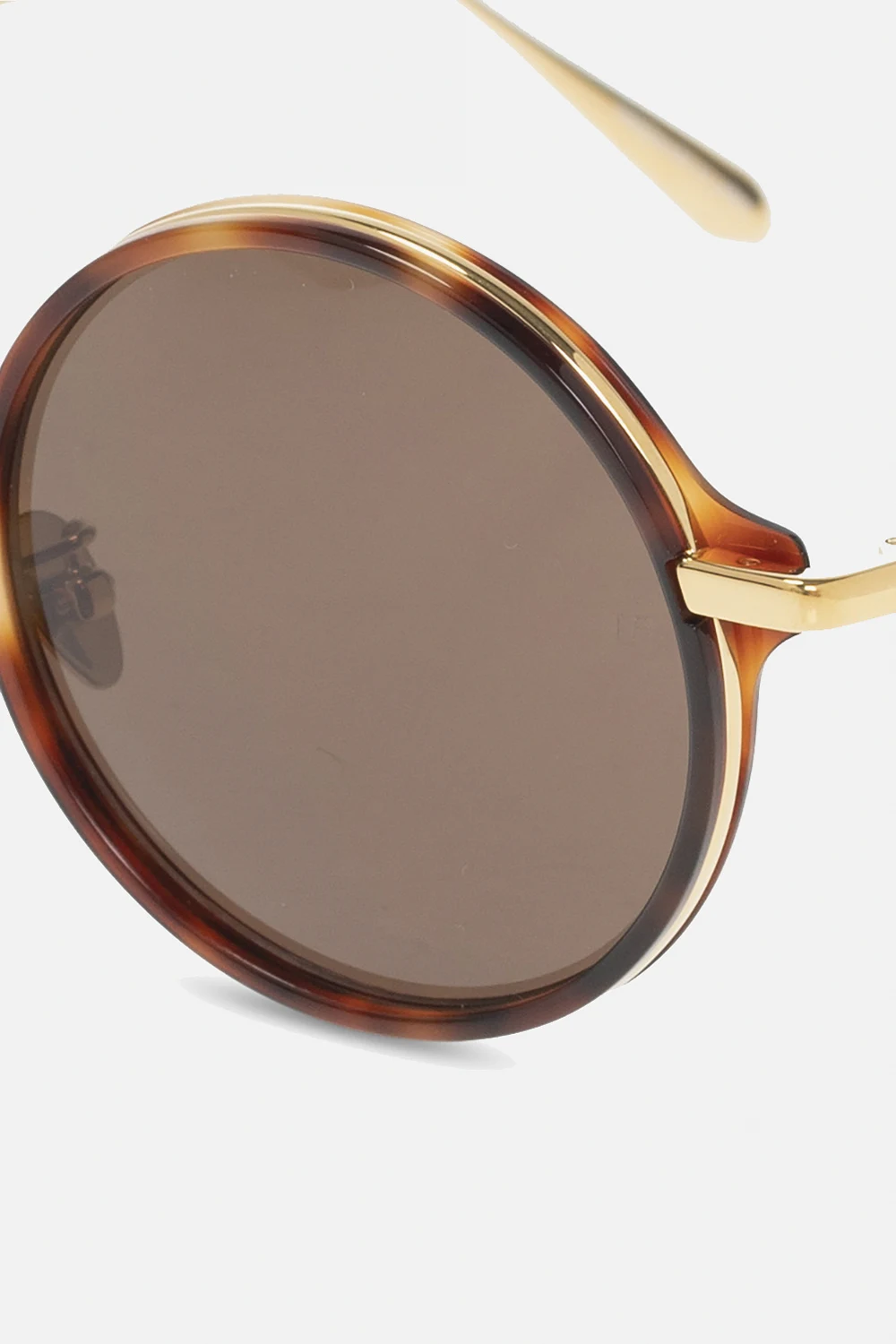 Okrągłe okulary przeciwsłoneczne w kolorze brązowo-pomarańczowo-złotym, model ‘Bara’ Linda Farrow. Wykonane z acetatu. Rama ozdobiona wzorem ‘Tortouse Shell’. Zauszniki i mostek z tytanu w kolorze złotym. Brązowe soczewki z wygrawerowanym logo 100% UVA i UVB. Dołączone czarne etui z logo. Wykonane ręcznie w Japonii.