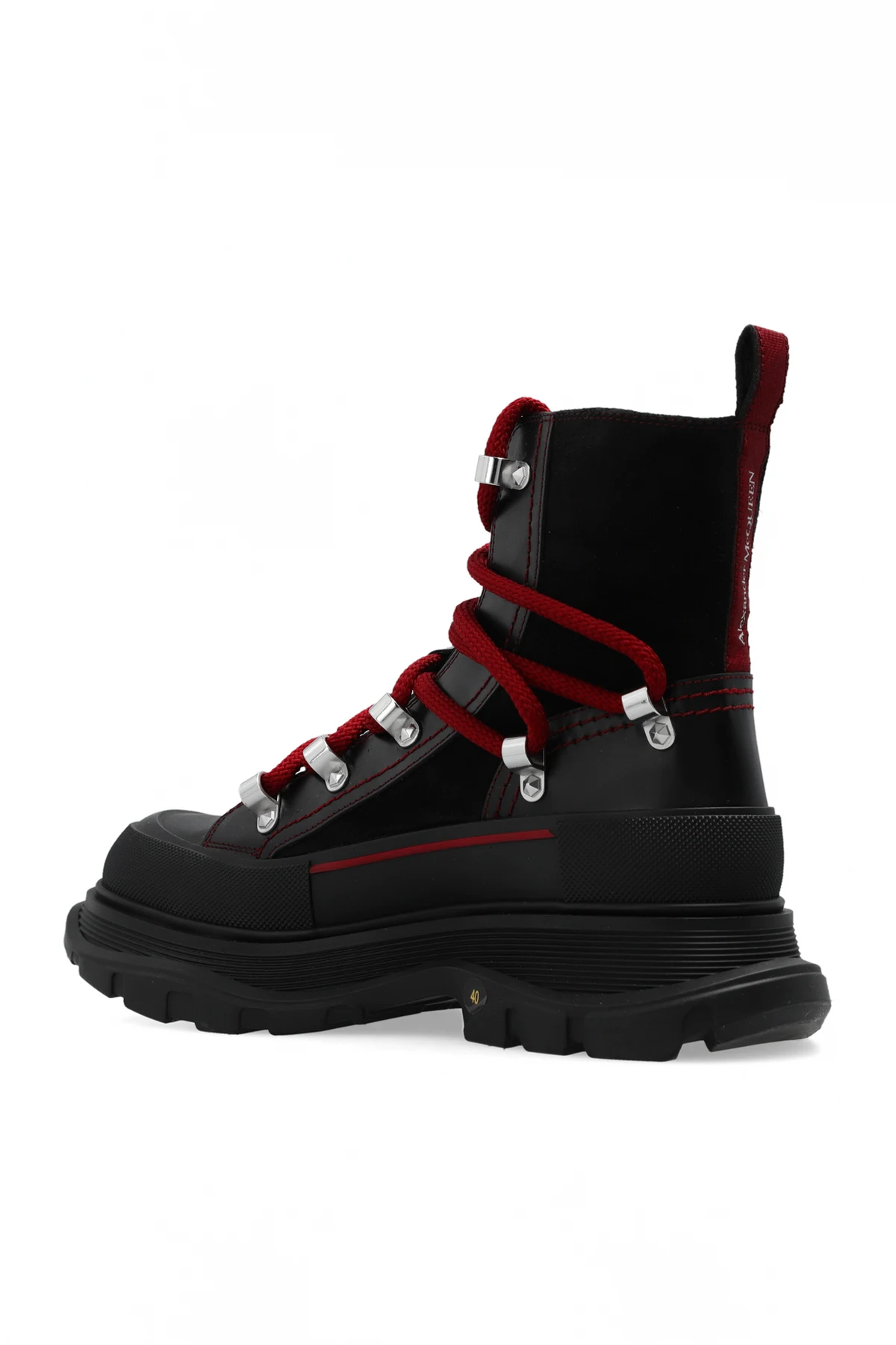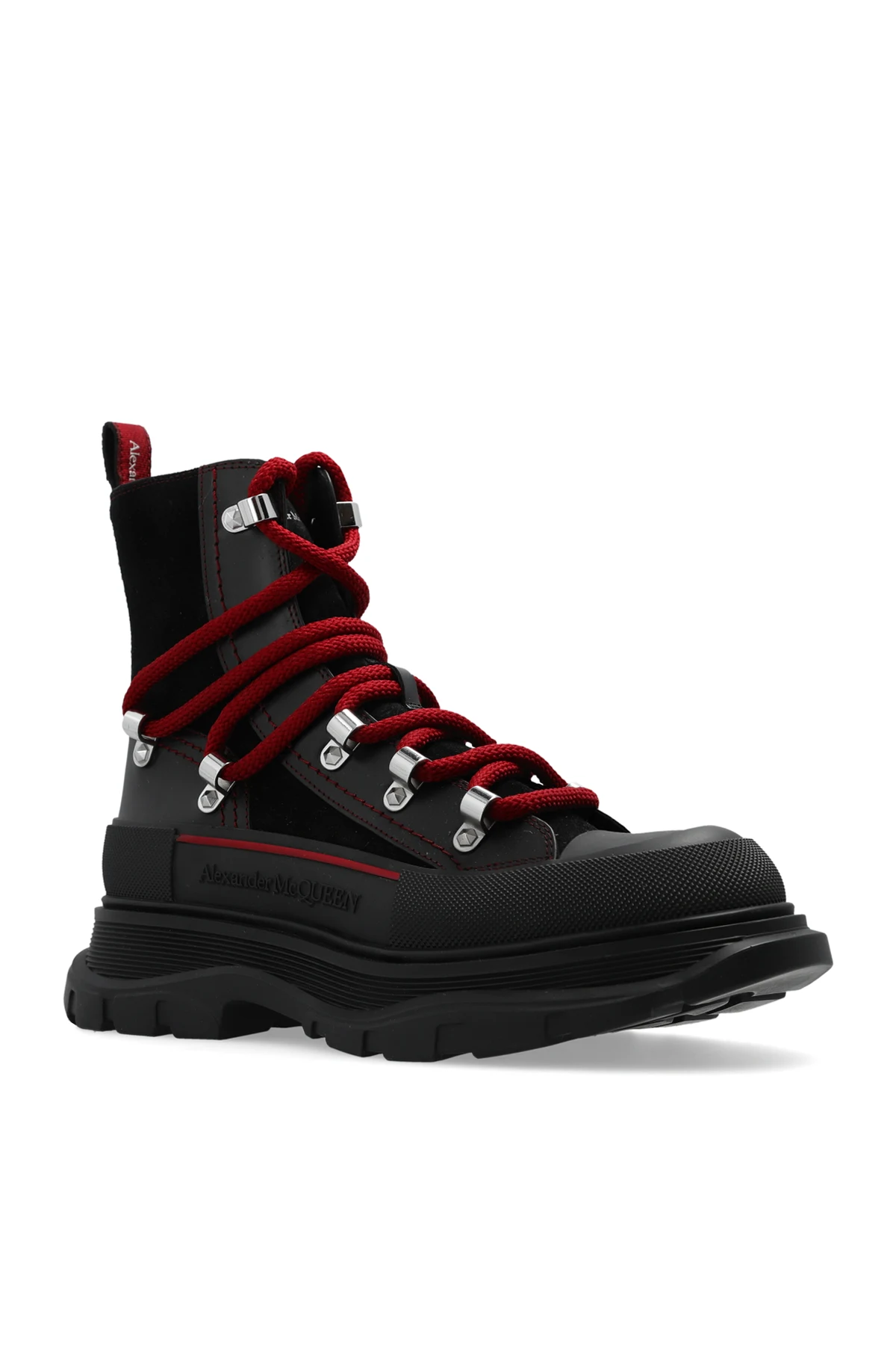 Czarno-bordowe, sznurowane buty za kostkę Alexander McQueen. Wykonane z zamszu i skóry. Ozdobione logo. Czarne, gumowa podeszwa.