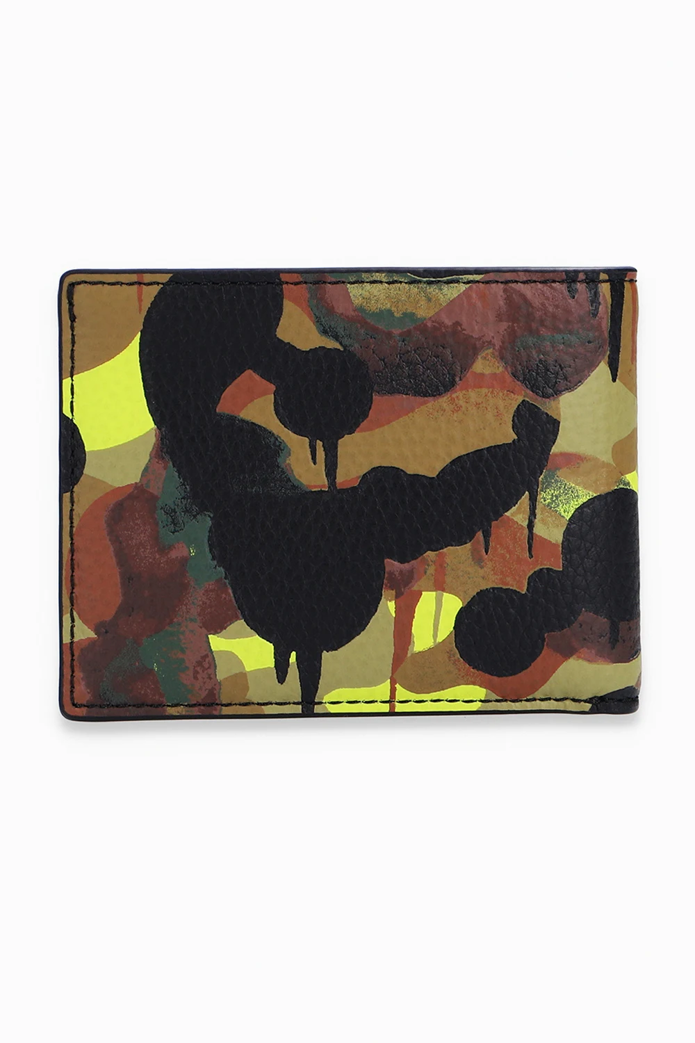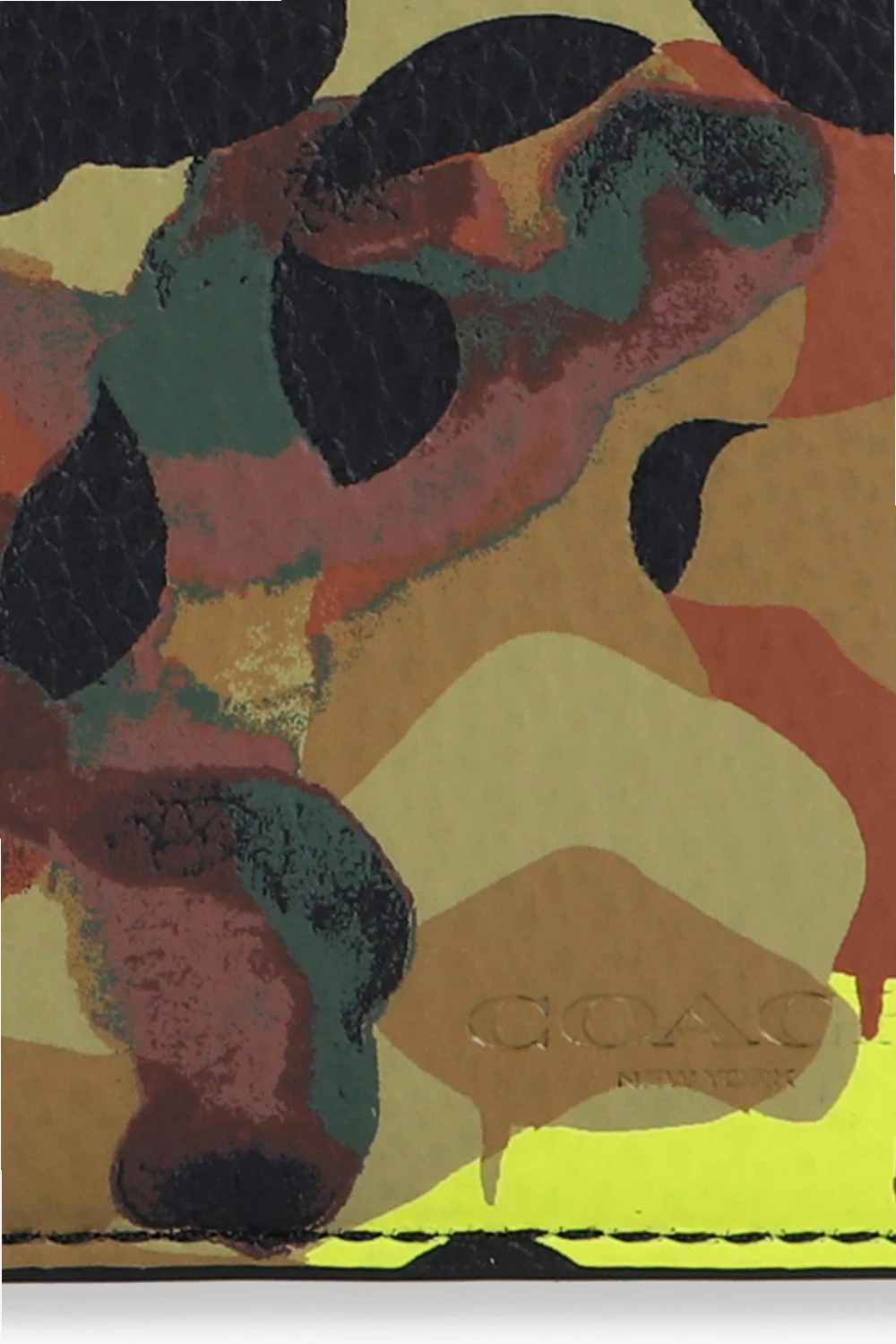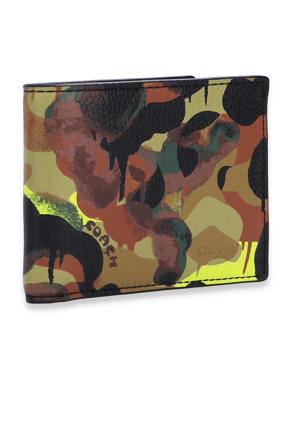 Kolorowy, składany portfel Coach. Wykonany ze skóry. Ozdobiony nadrukiem z logo. Wewnątrz kieszeń na banknoty, dwie wsuwane kieszenie i sześć miejsc na karty.
