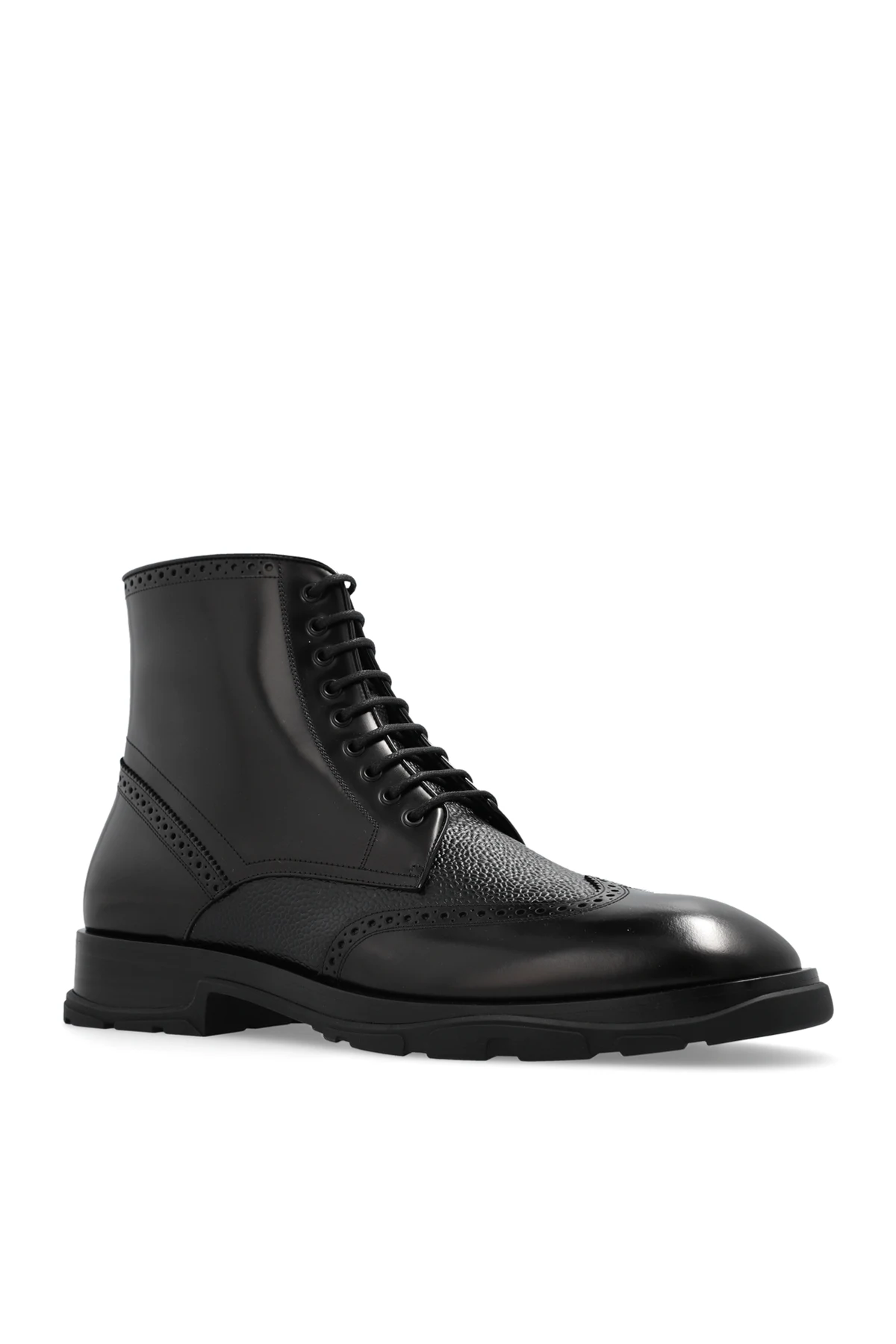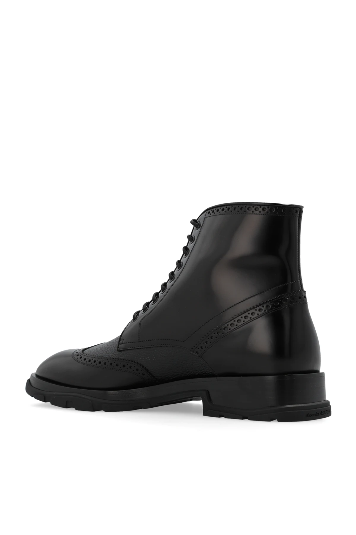 Czarne, sznurowane buty za kostkę Alexander McQueen. Wykonane ze skóry o specjalnej fakturze i gładkiej. Wykończone ażurowym wzorem. Czarna, gumowa podeszwa.