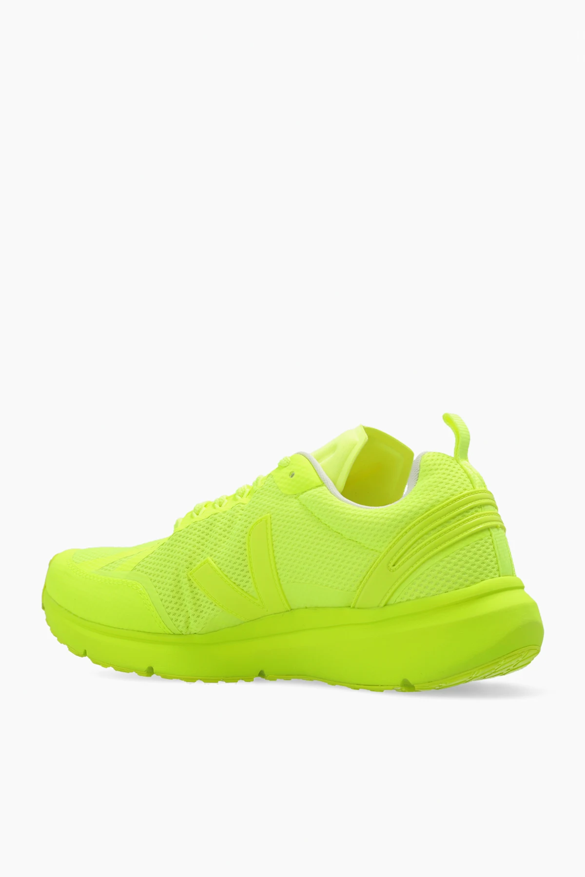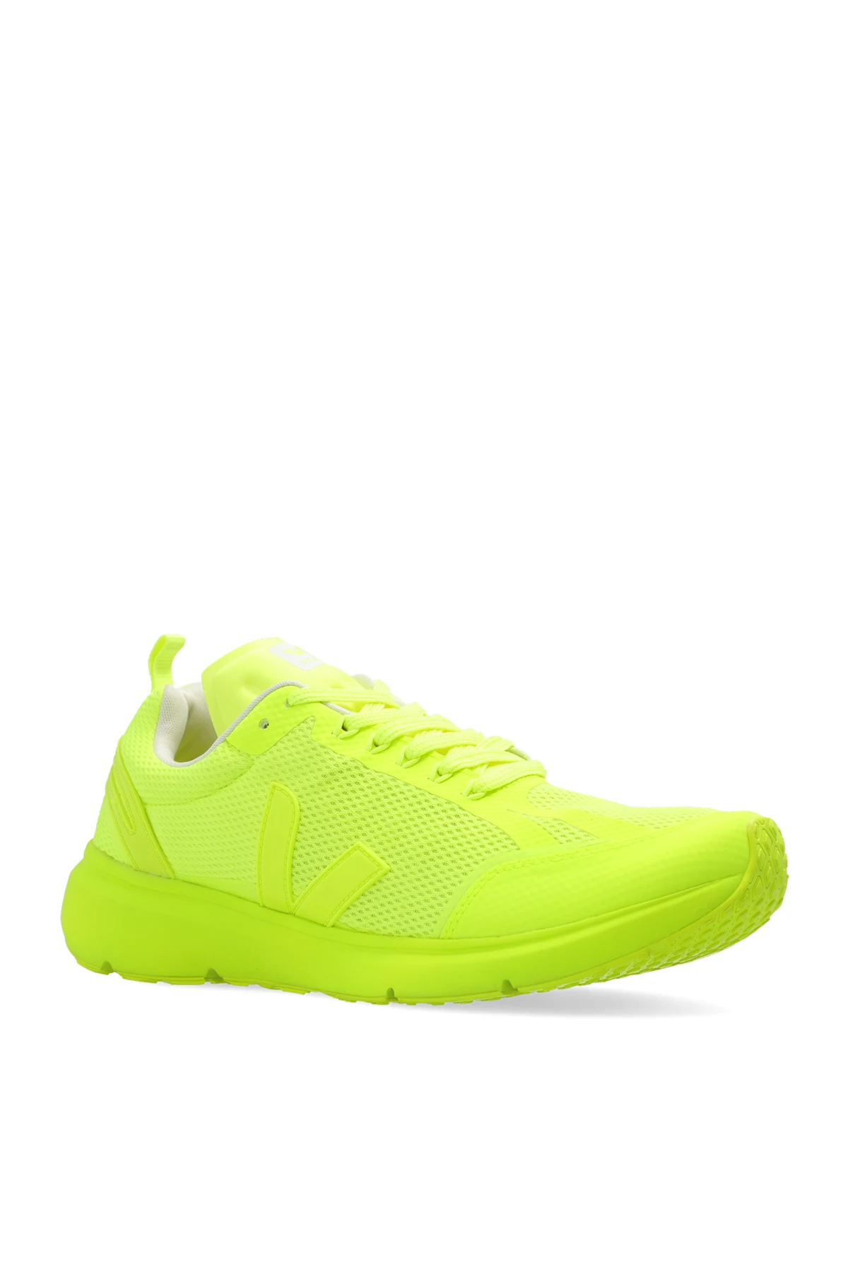 Neonowożółte, sznurowane buty sportowe, model ‘Condor 2’ Veja. Wykonane z oddychającej siatki Alveomesh pochodzącej z recyklingu. Na języku nadrukowane logo. Charakterystyczna dla marki naszywka wykonana z innowacyjnego materiału Pebax Rnew. Wkładka wykonana z trzciny cukrowej, gumy Amazon, bawełny organicznej i pochodzącej z recyklingu pianki EVA. Lateksowe poduszki amortyzujące L-Foam. Neonowożółta, gumowa podeszwa wykonana z materiałów organicznym oraz pochodzących z recyklingu.