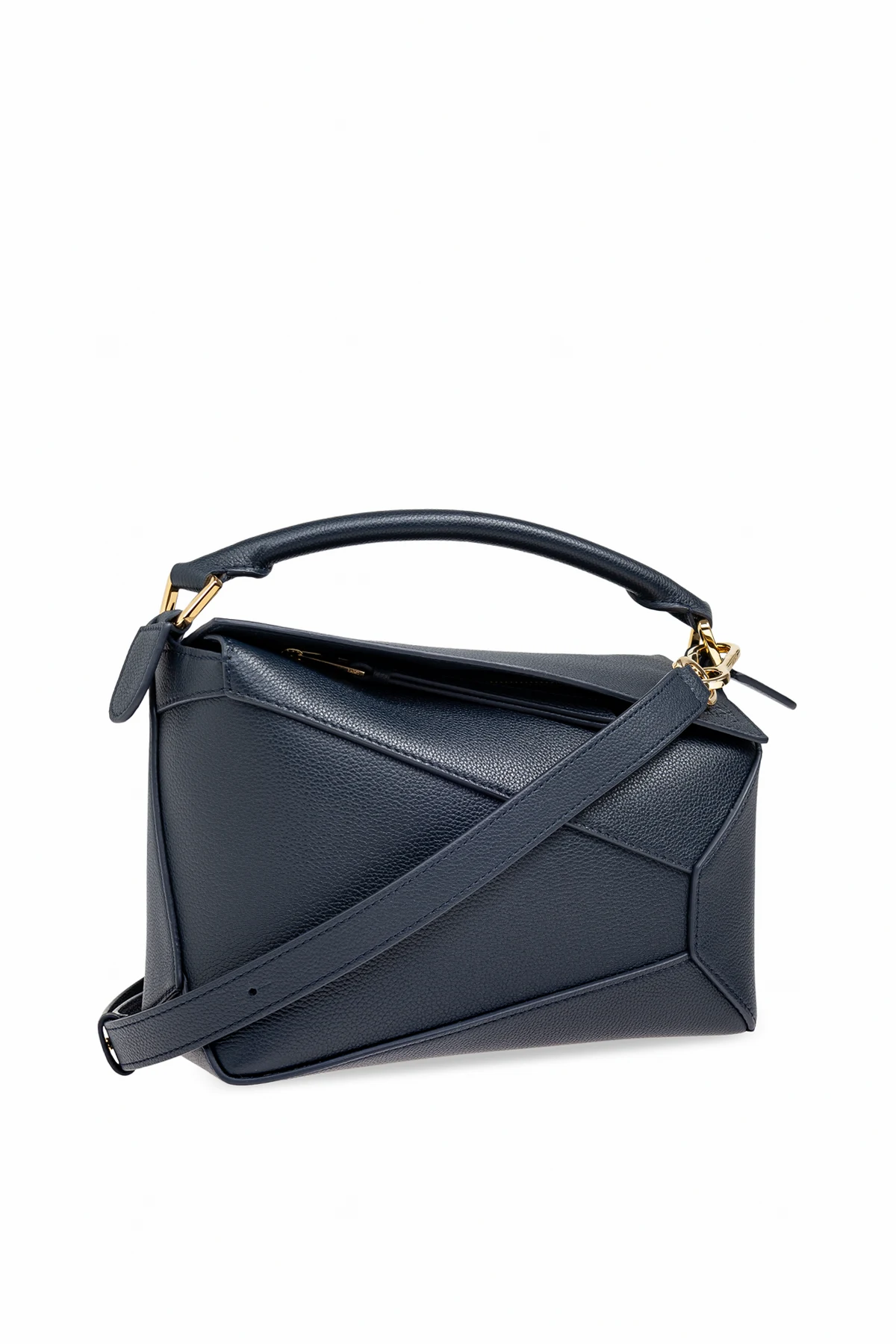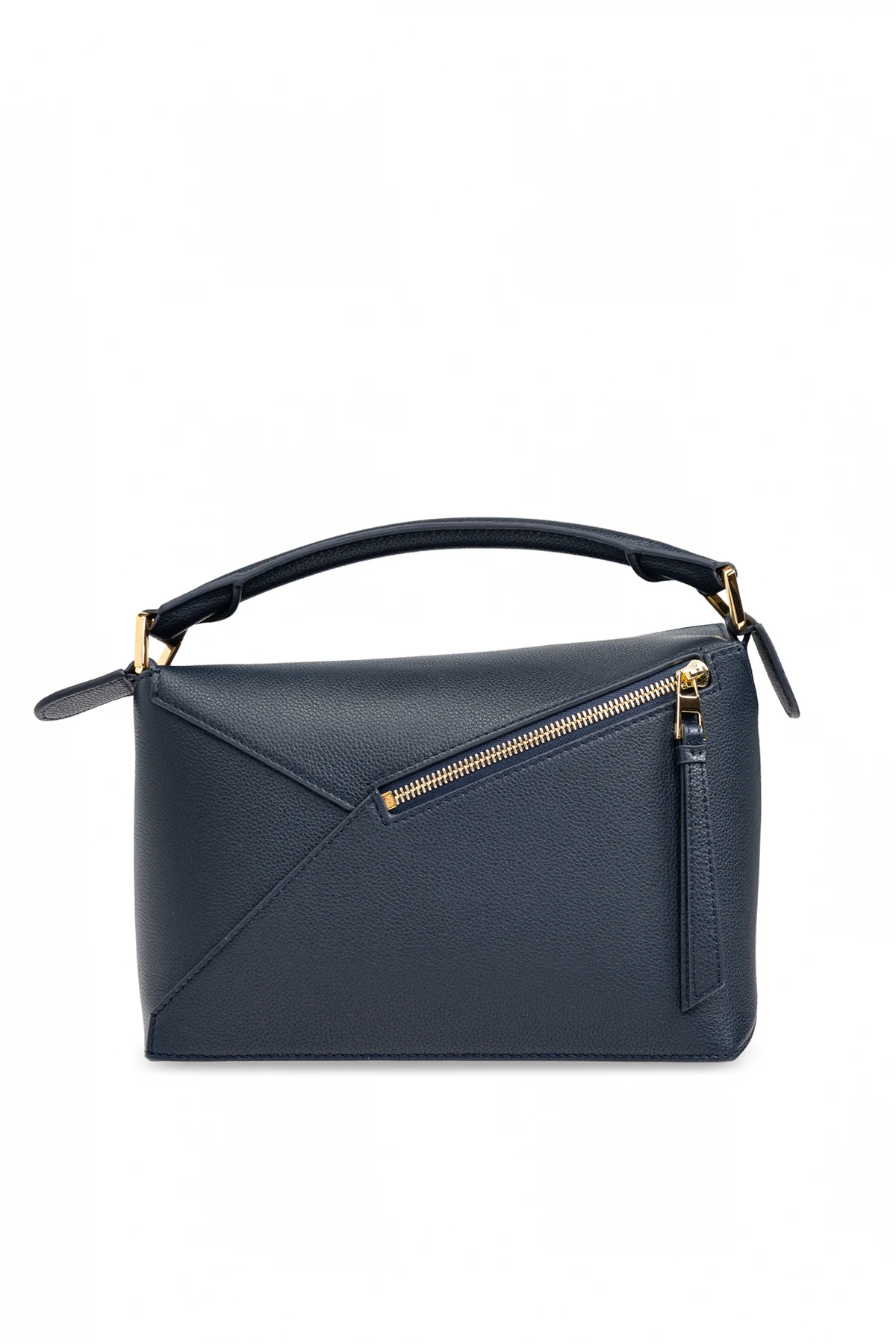 Odkryj Torba do ręki "Puzzle Edge Small" marki Loewe, która z wdziękiem łączy nowoczesność z tradycją. Ta granatowa torba o unikalnym, geometrycznym kształcie, inspirowanym układanką, to prawdziwe dzieło sztuki użytkowej.
