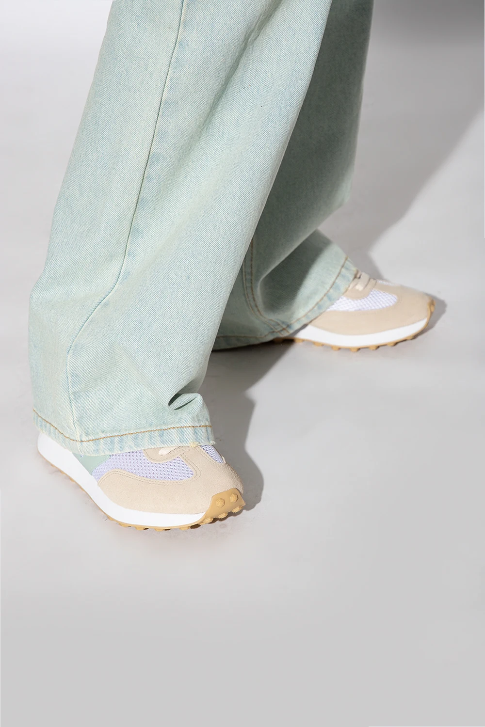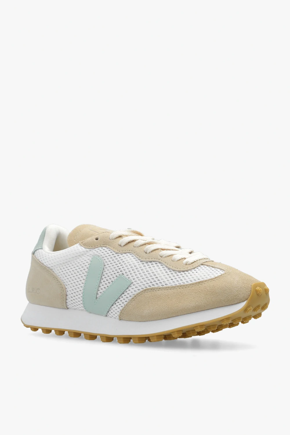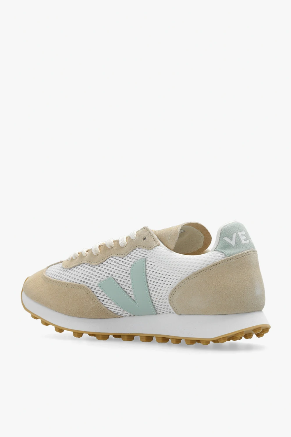 Beżowo-biało-jasnozielone, sznurowane buty sportowe, model ‘RIO BRANCO LIGHT AIRCELL’ Veja. Wykonane z materiału i skóry. Ozdobione aplikacjami z logo. Biało-brązowa, gumowa podeszwa.