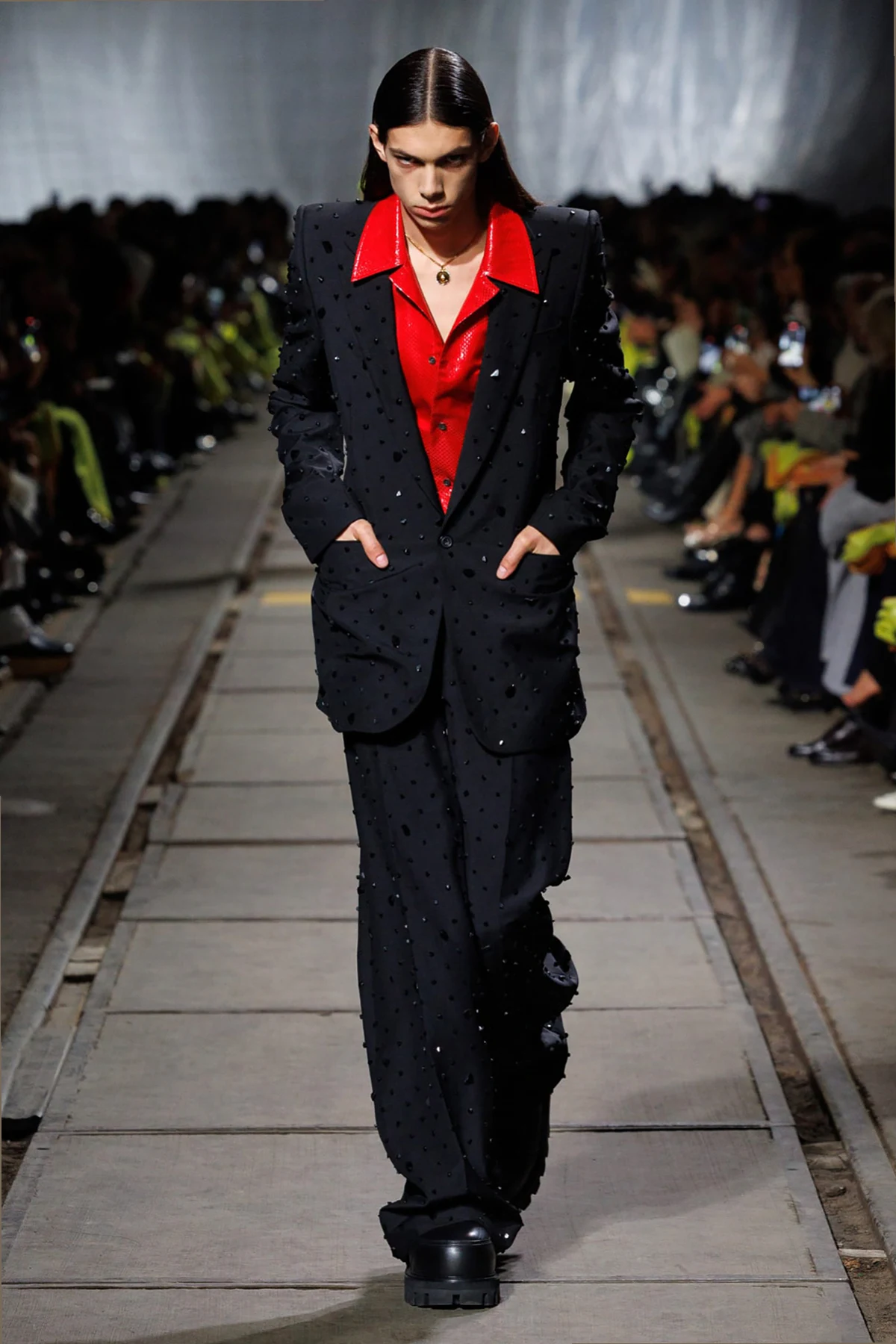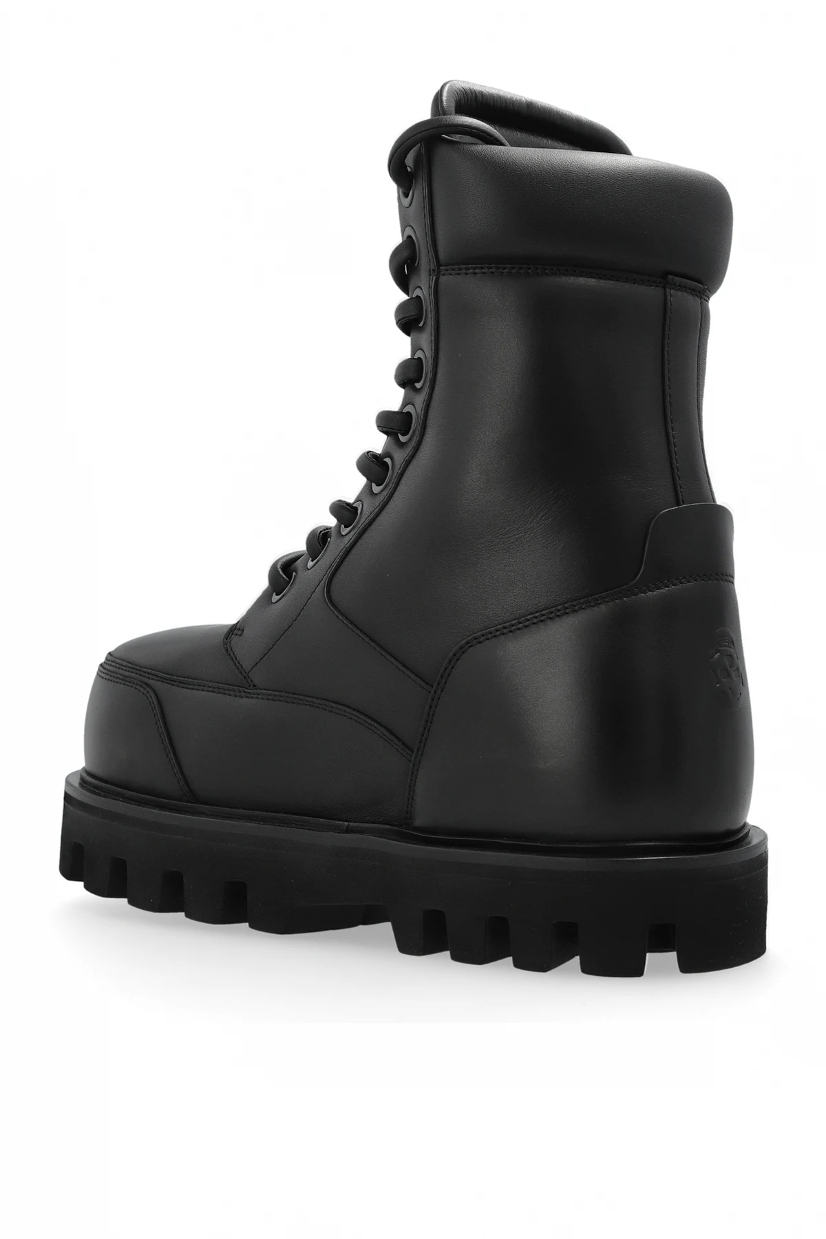 Przedstawiamy czarne skórzane botki na koturnie od renomowanej marki Alexander McQueen . Te wyjątkowe buty wykonane są z najwyższej jakości skóry, co nadaje im nie tylko elegancji, ale i nowoczesnego sznytu. Botki wyróżniają się masywną sylwetką, która podkreśla ich wyrazisty charakter, a wysokość sięgająca ponad kostkę dodaje elegancji i ochrony.