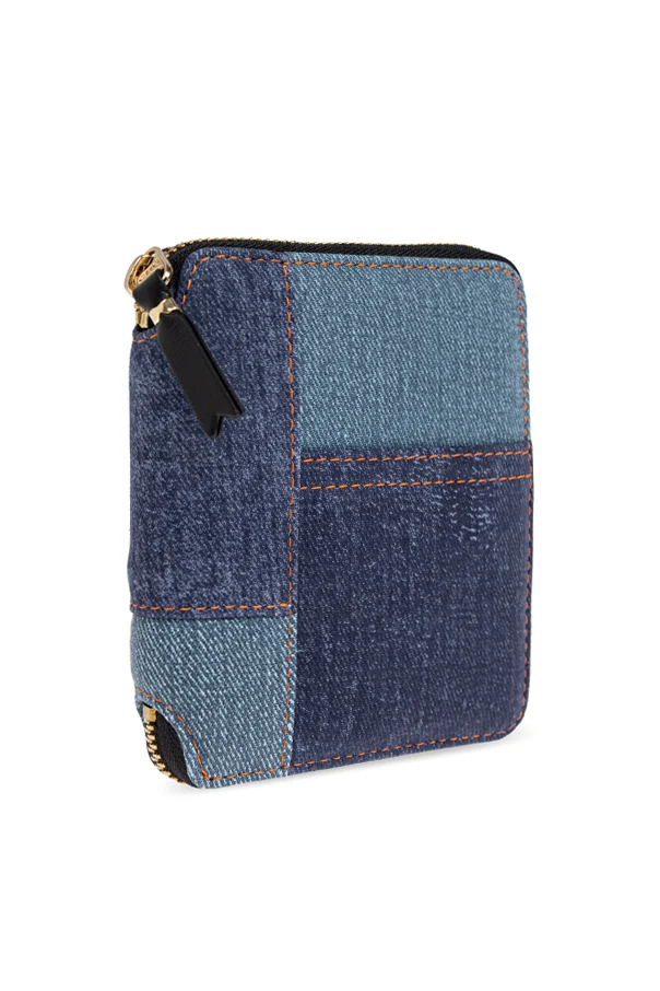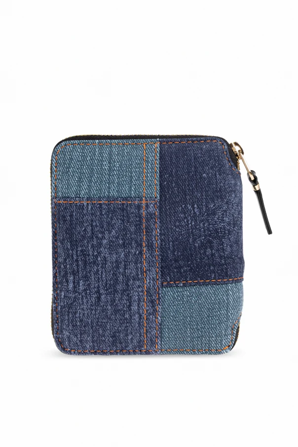 Skórzany portfel od Comme des Garçons zachwyca od pierwszego spojrzenia wysublimowaną formą oraz nowoczesną interpretacją klasyki. Kwadratowy, zwarty kształt portfela, z łagodnie zaokrąglonymi brzegami, skrywa w sobie wyrafinowaną grę patchworku – zewnętrzną powierzchnię tworzą starannie dobrane niebieskie panele, ułożone w uporządkowany, geometryczny wzór.