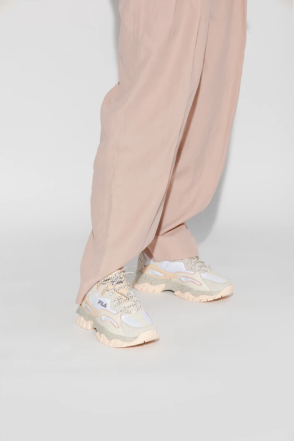 Biało-kremowo-różowe, sznurowane buty sportowe, model ‘Ray Tracer TR2’ Fila. Wykonane ze sportowego materiału, wykończone zamszem i skórą. Na języku, z boku i z tyłu ozdobione logo. Odblaskowe wstawki. Kremowo-różowa, gumowa podeszwa.