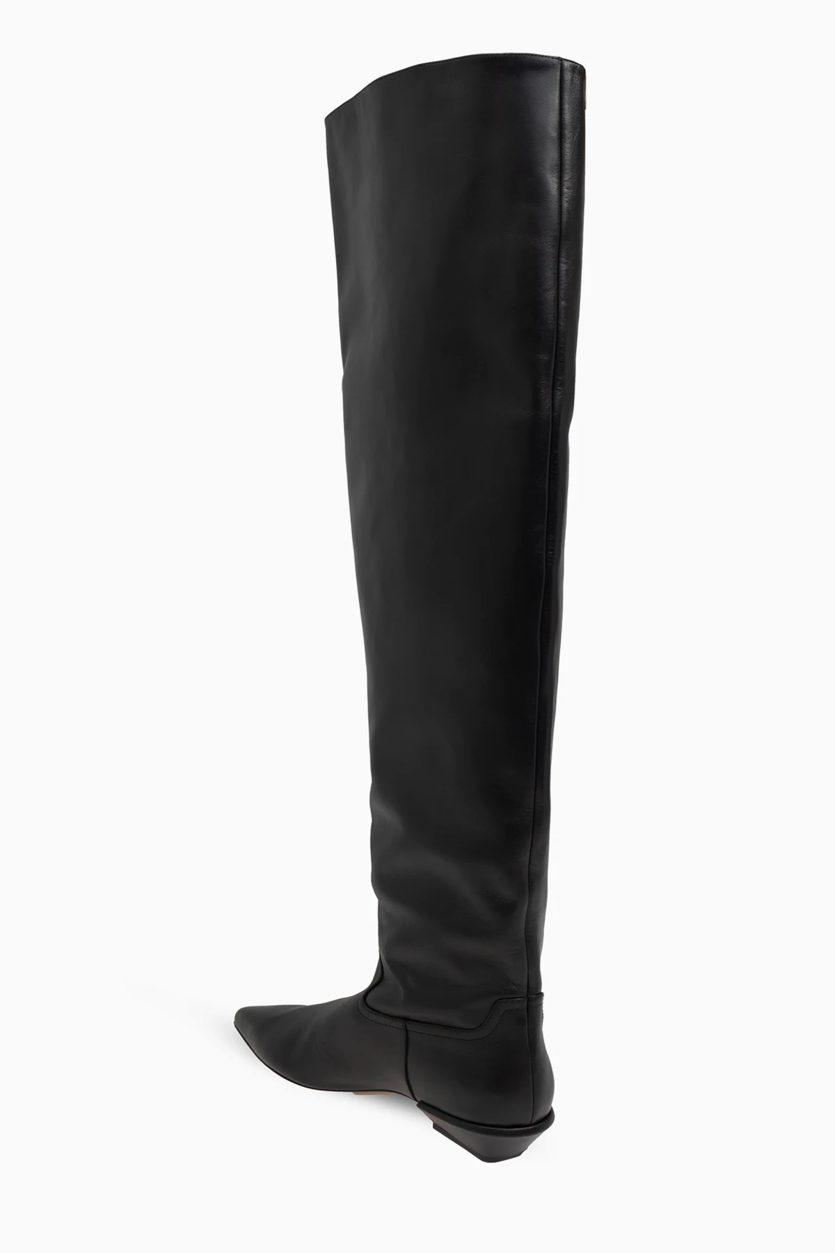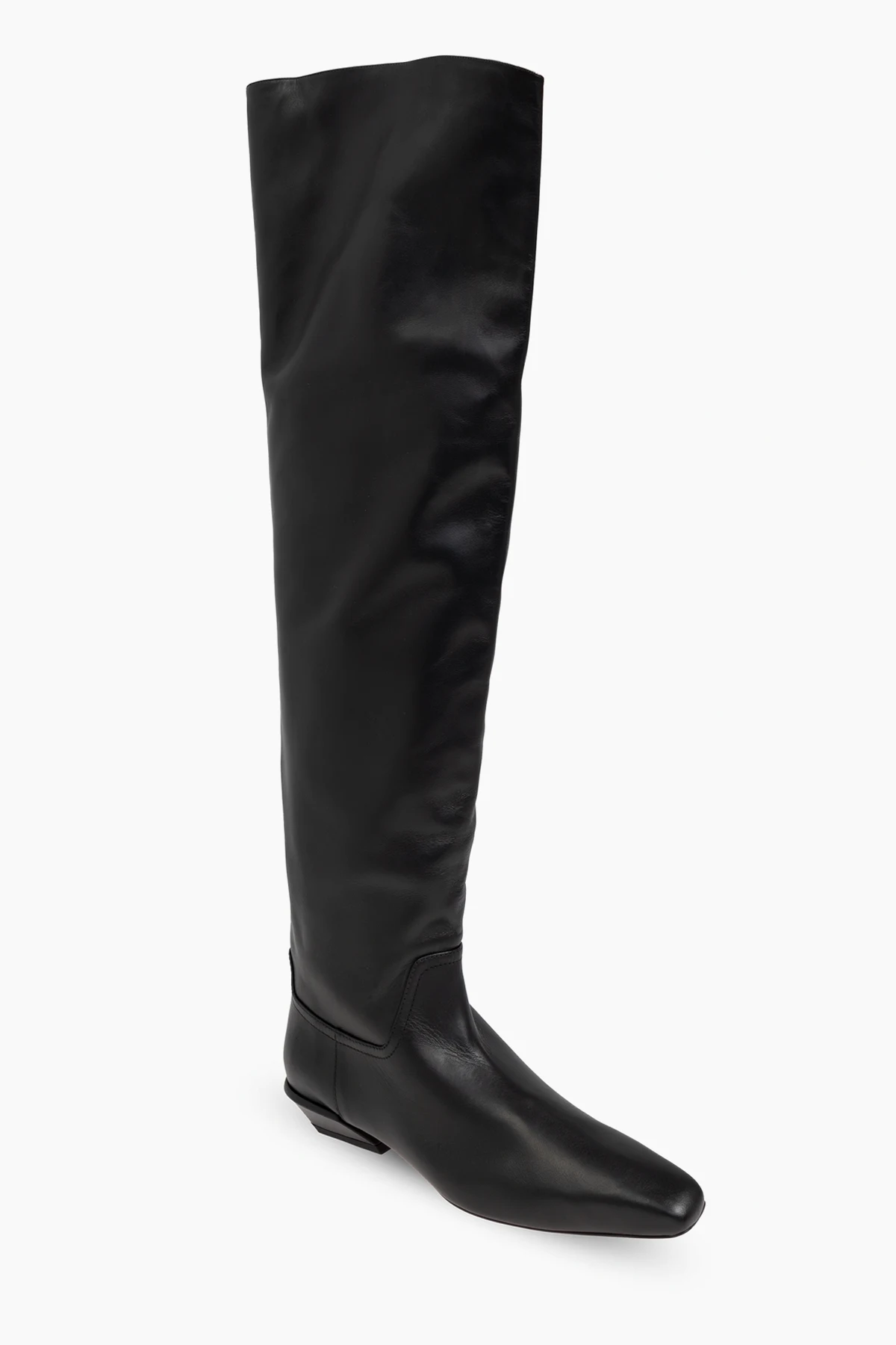 Odkryj prawdziwą elegancję dzięki skórzanym kozakom 'Bettina' z ekskluzywnej kolekcji od Paris Texas. Te wysokie buty, sięgające powyżej kolan, wyróżniają się smukłym krojem z lekko zaokrąglonym noskiem oraz niskim obcasem, co zapewnia komfort podczas noszenia. Wykonane z najwyższej jakości, miękkiej i elastycznej skóry, zachwycają prostotą i minimalistycznym designem.