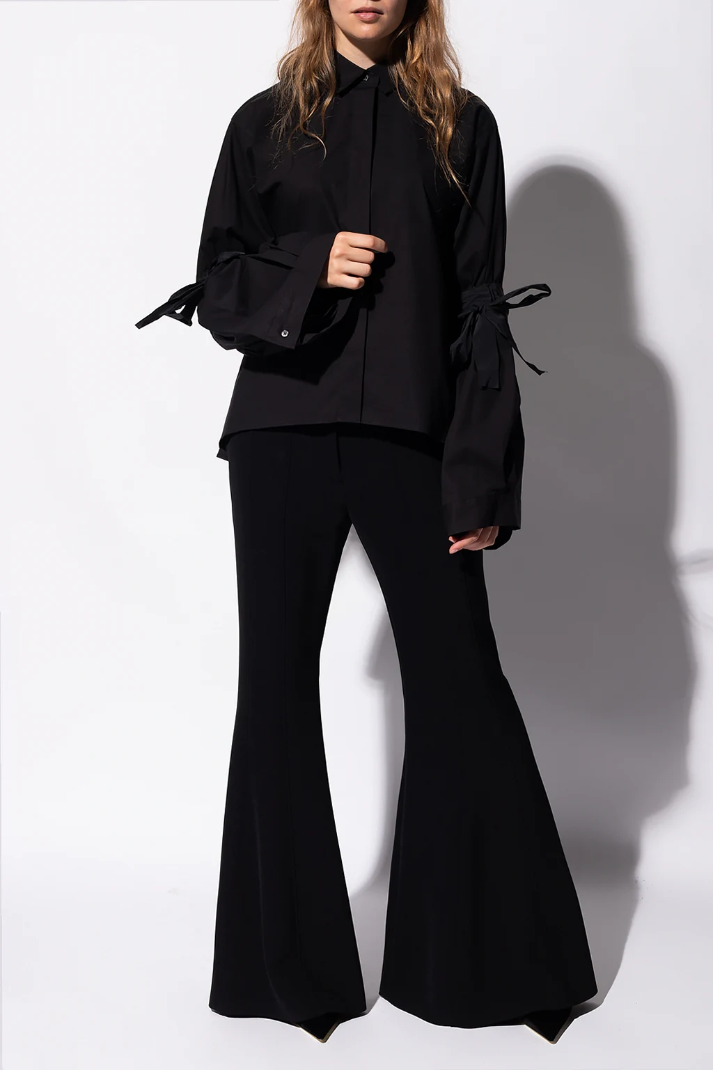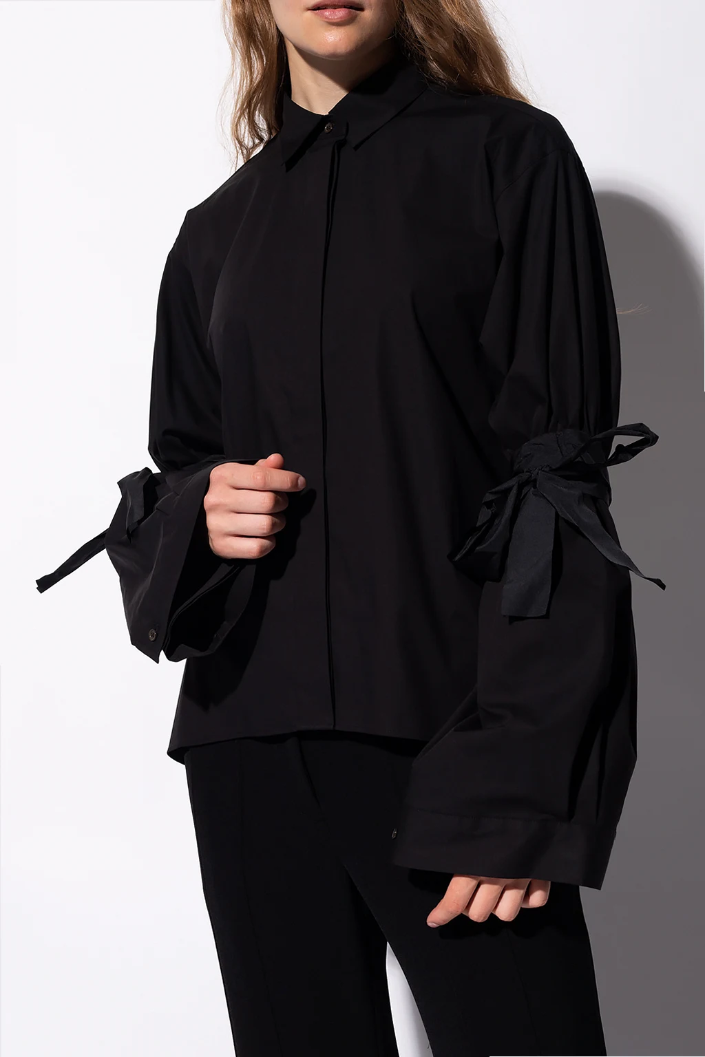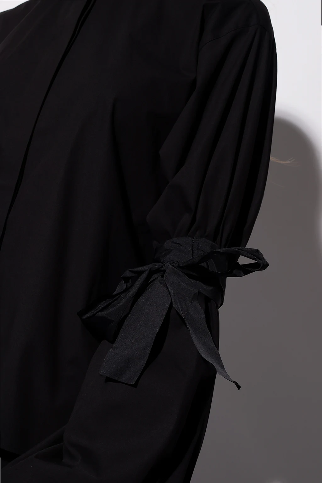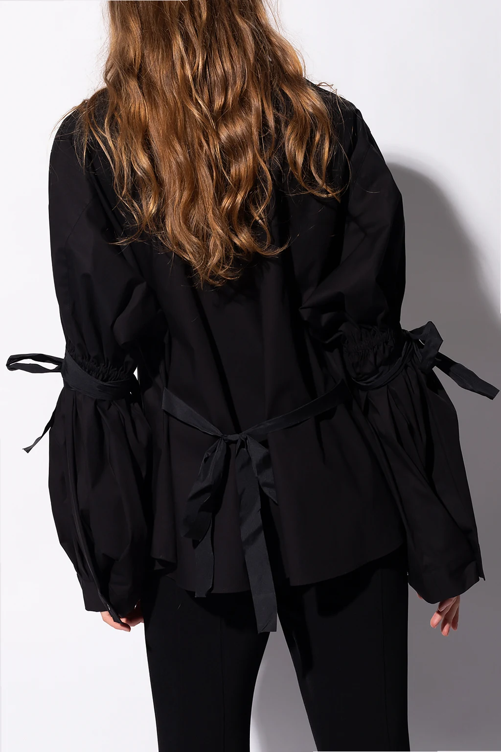 Czarna, bawełniana koszula Red Valentino. Zapinana na guziki. Szerokie rękawy ozdobione marszczeniami i dekoracyjnym wiązaniem.