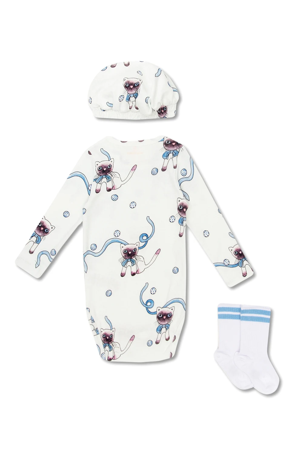 Biały zestaw Mini Rodini. Wykonany z bawełny. Ozdobiony wzorem z motywem zwierzęcym. Body z zapięciami na zatrzask. Skarpety oraz czapka wykończona ściągaczem.