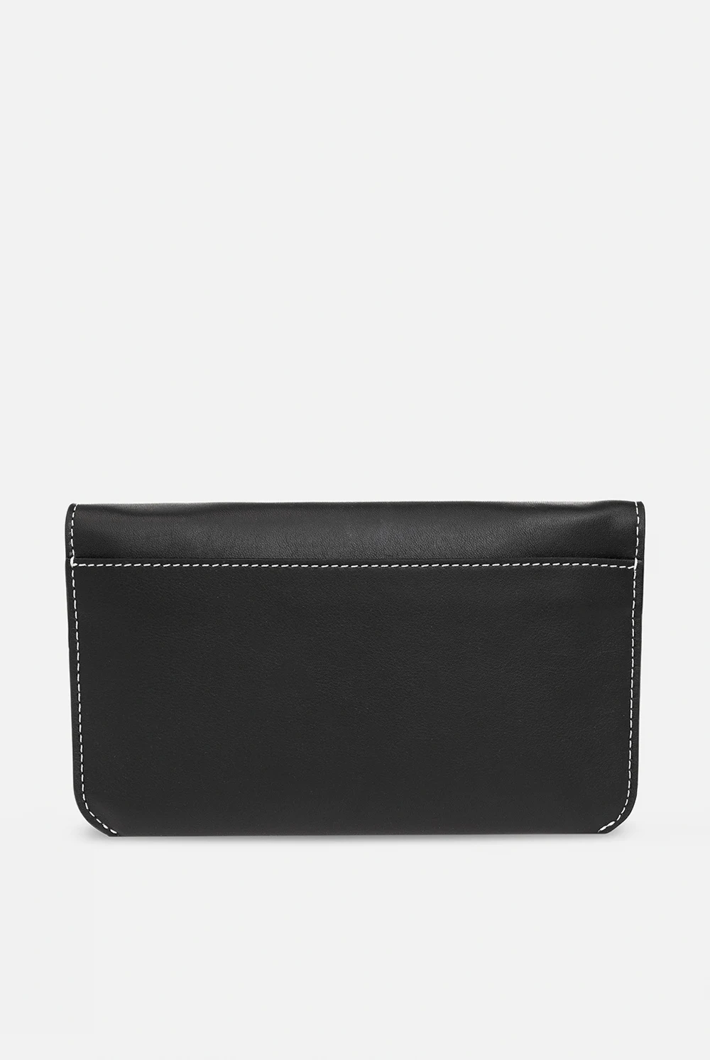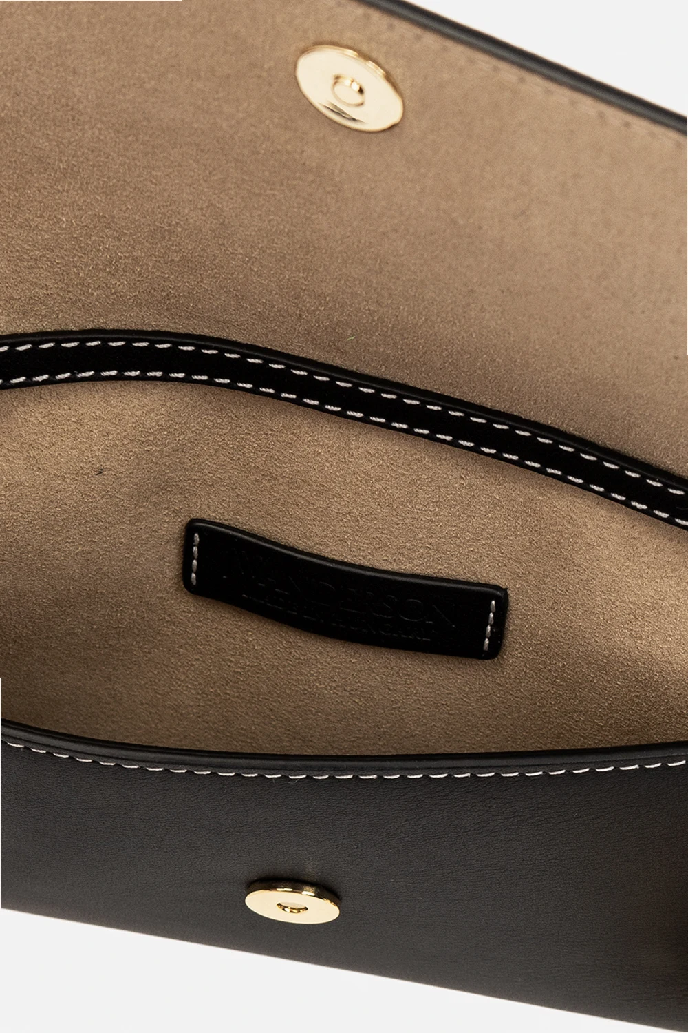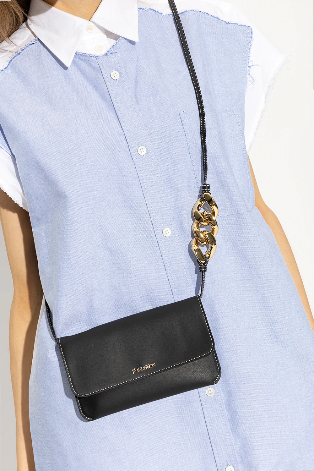 Czarne etui na telefon J.W. Anderson. Wykonane ze skóry cielęcej. Zamykane na zatrzask. Dekoracyjne, kontrastowe szwy w kolorze białym. Z przodu nadrukowane logo. Z tyłu wsuwana kieszeń. Regulowany pas na ramię ozdobiony aplikacją w kształcie ogniw łańcucha. Metalowe wykończenie w kolorze złotym.