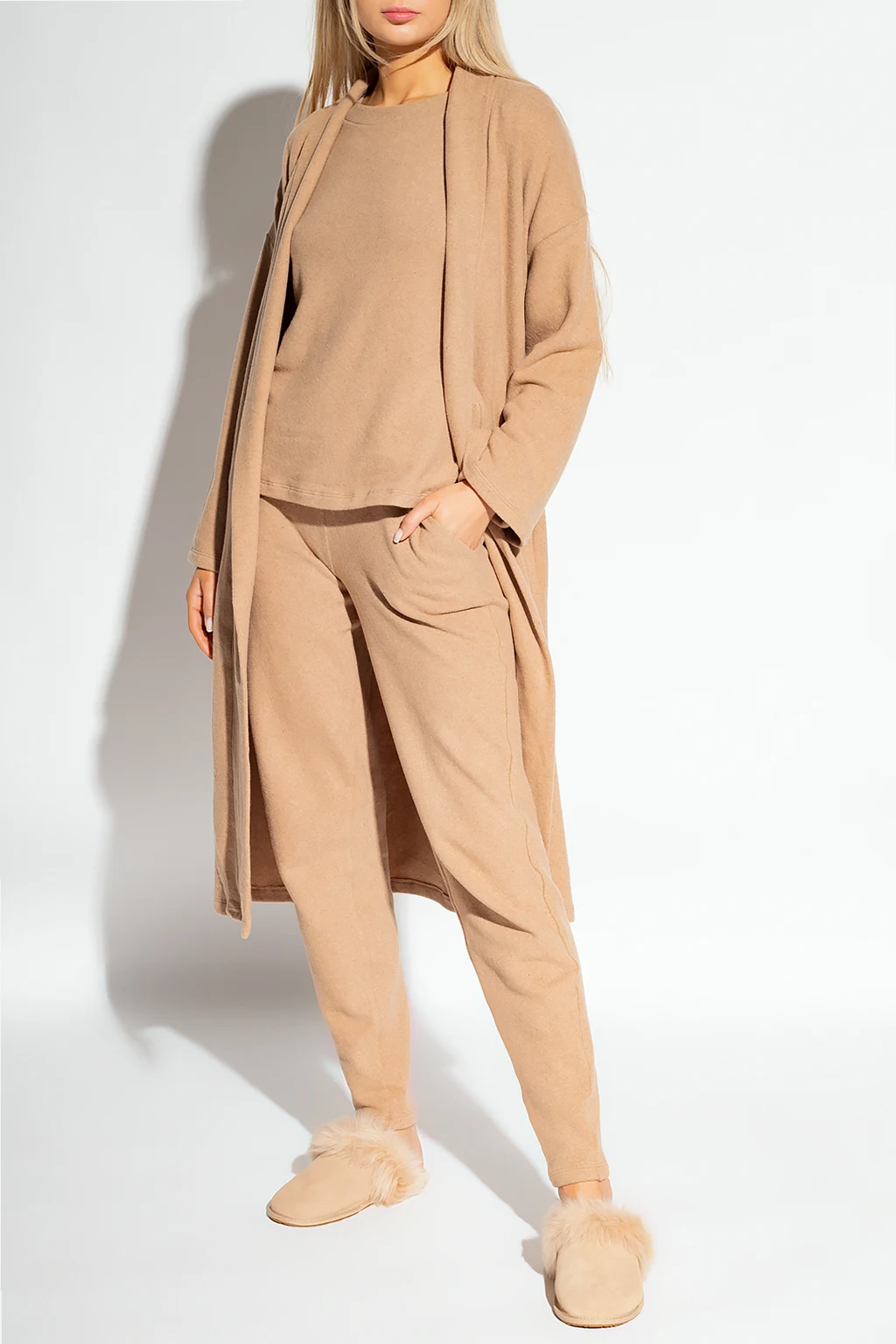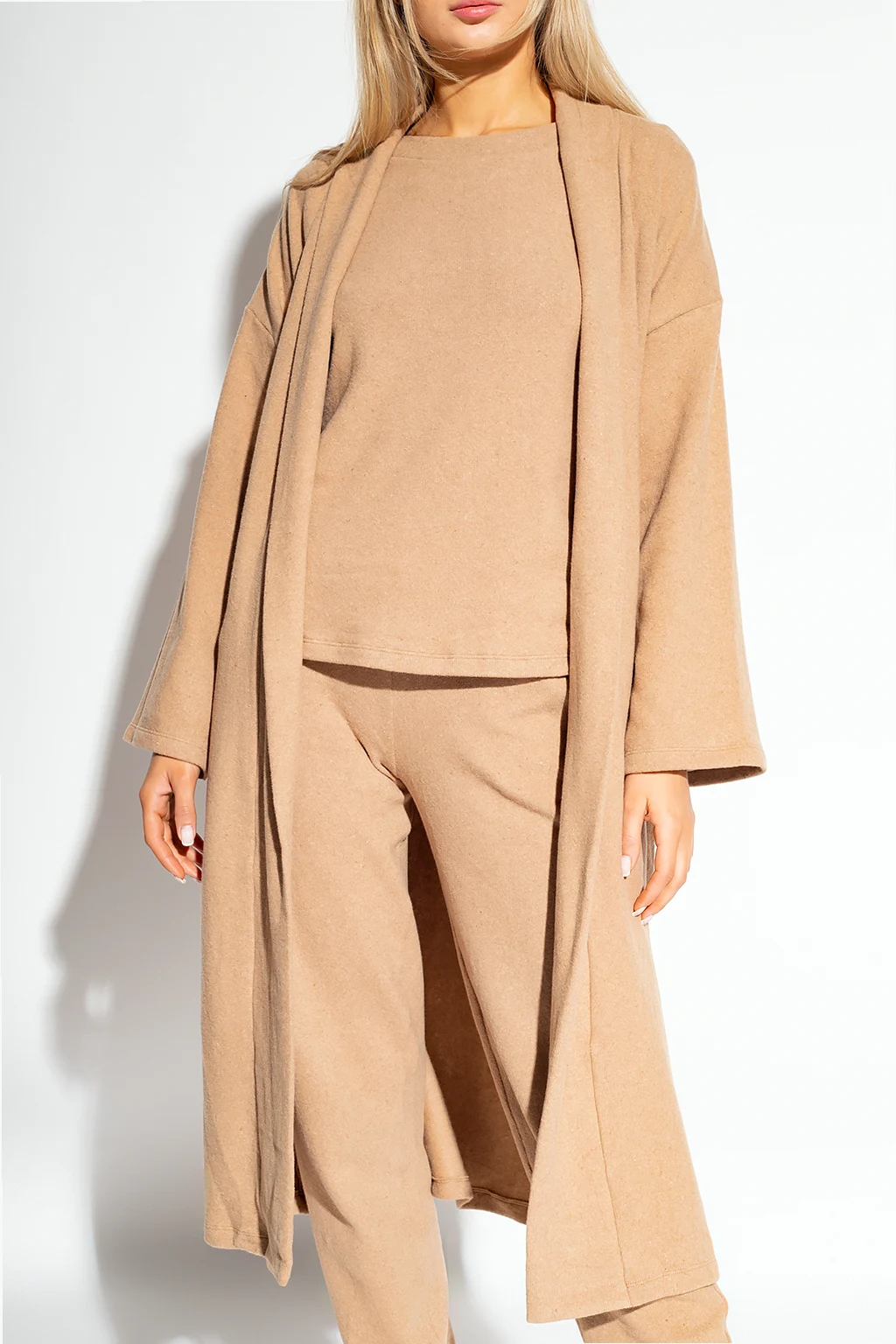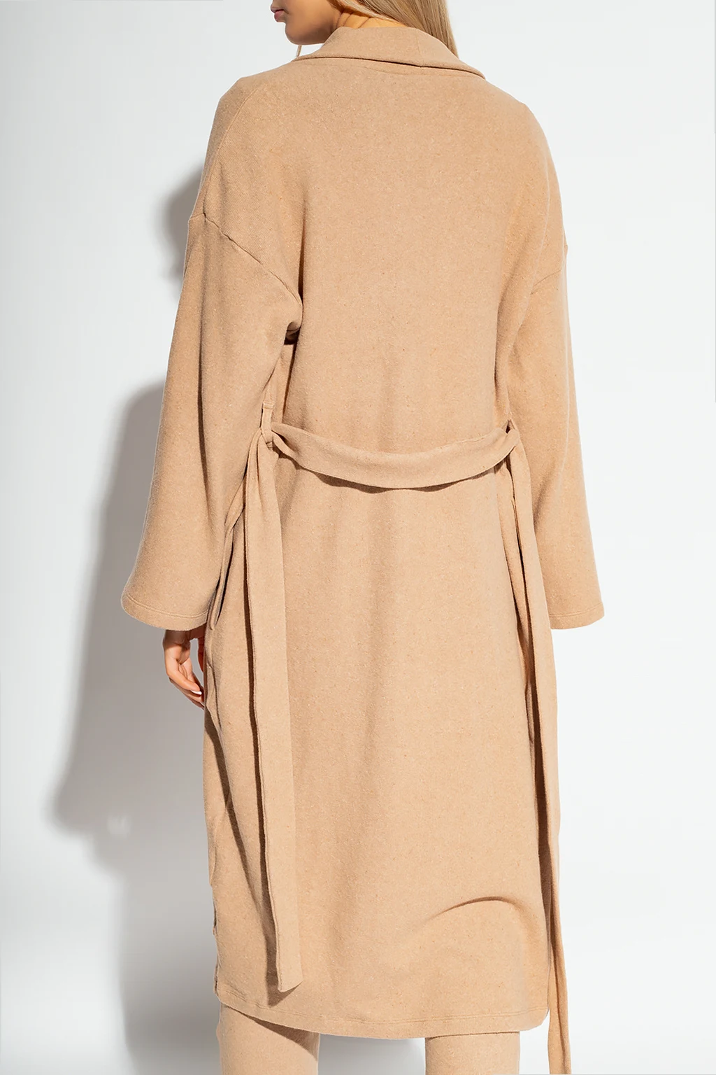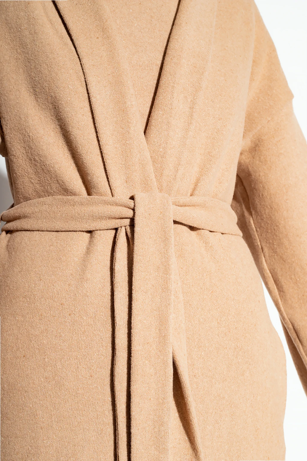 Beżowy szlafrok Hanro. Wykonany z mieszanki bawełny. Wiązany w talii dołączonym paskiem. Dekolt wykończony kołnierzem szalowym. Dwie wsuwane kieszenie. Długie rękawy.