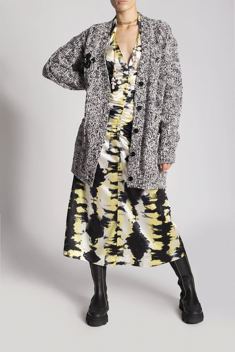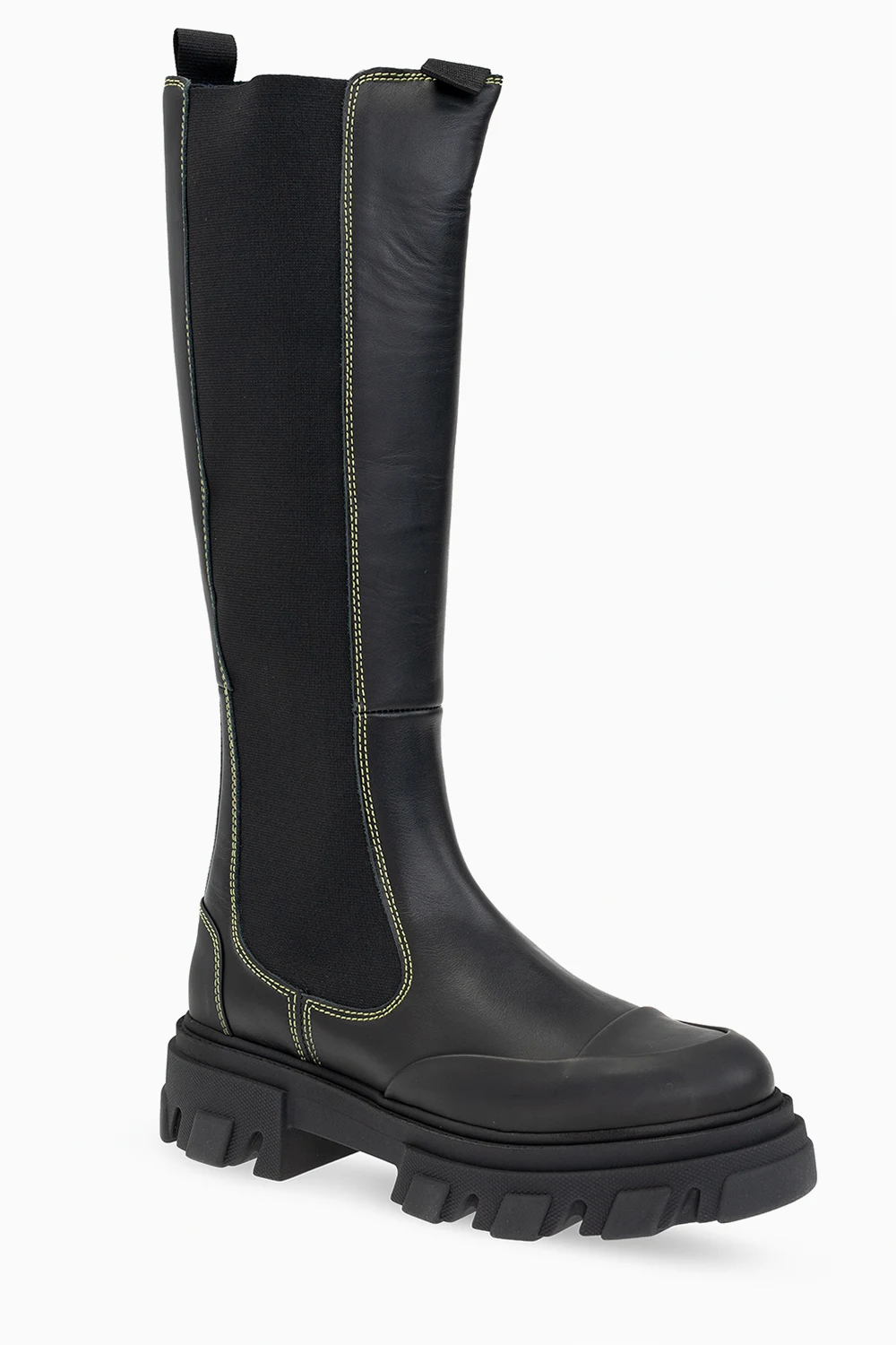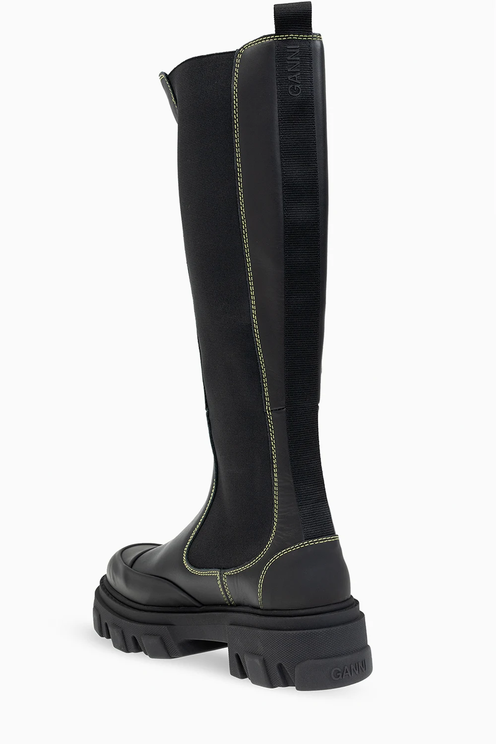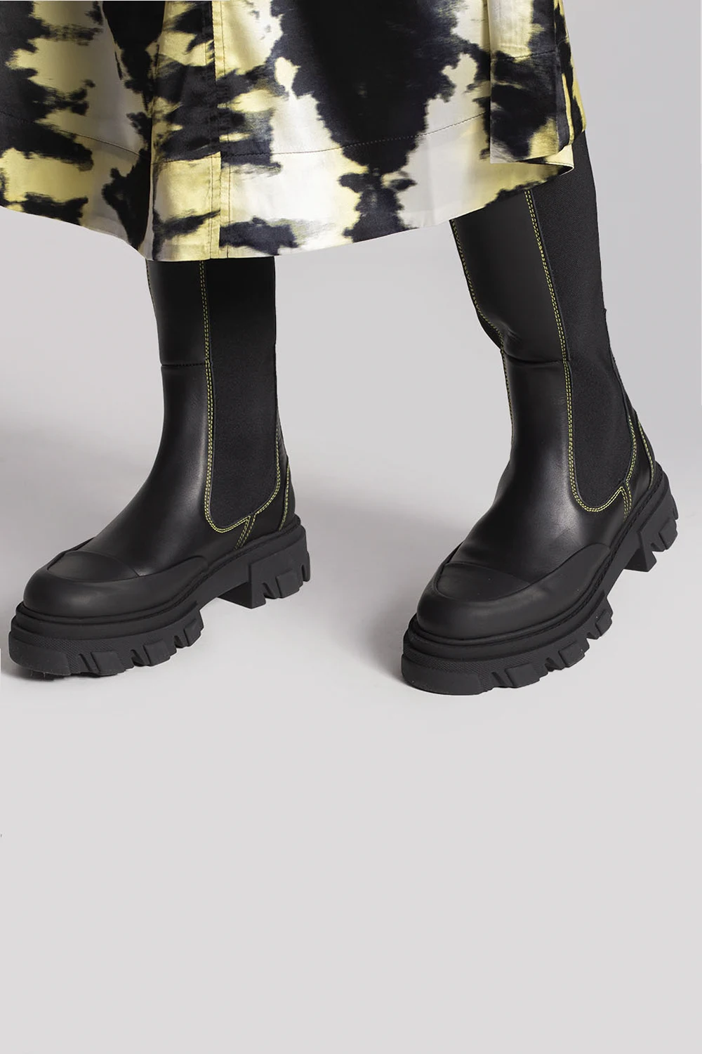 Czarne buty, model ‘Chelsea’ Ganni. Wykonane ze skóry. Wykończone gumą. Po bokach wszyta guma. Ozdobne przeszycia w kolorze żółtym. Z tyłu wypukłe logo. Czarna, gumowa podeszwa.