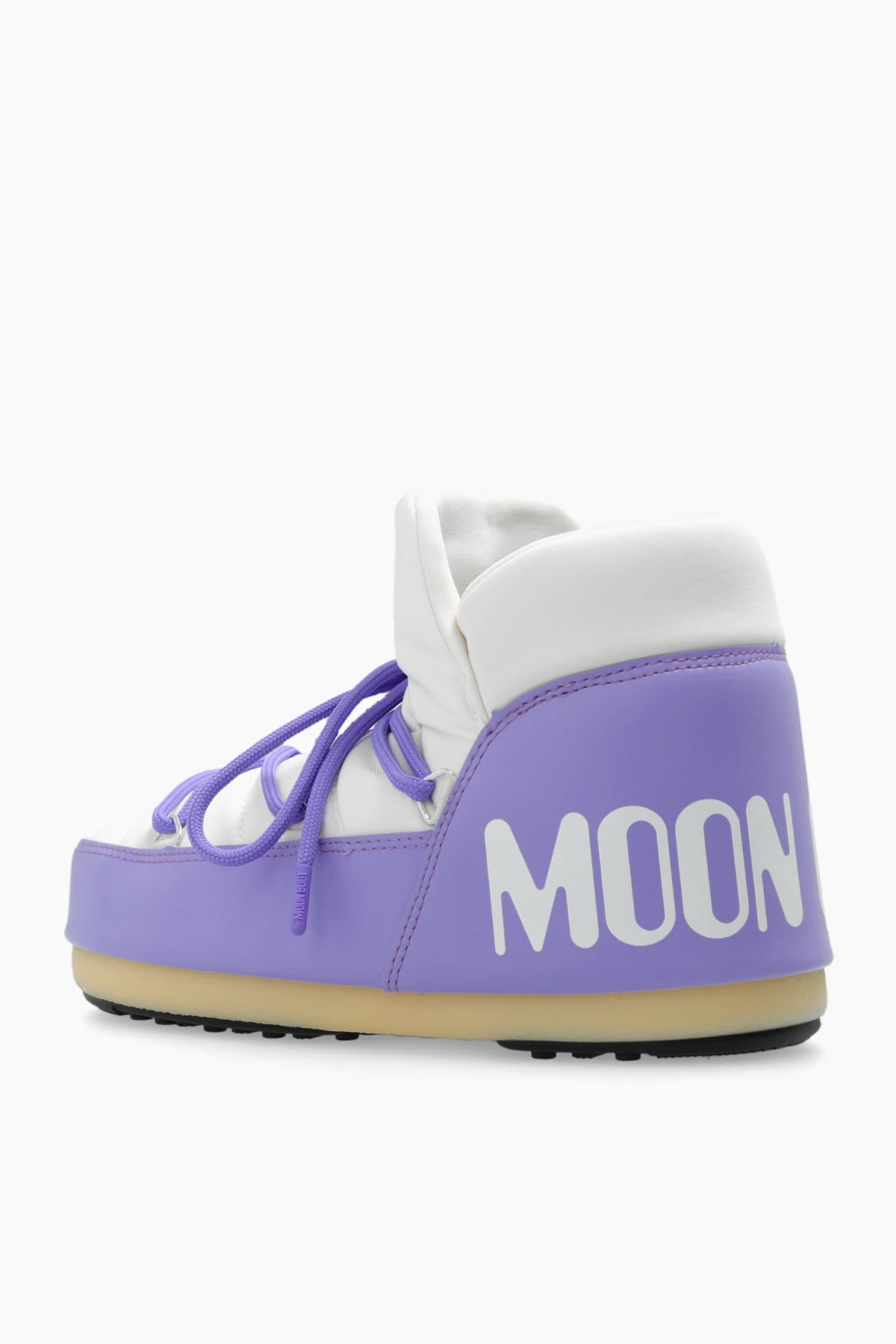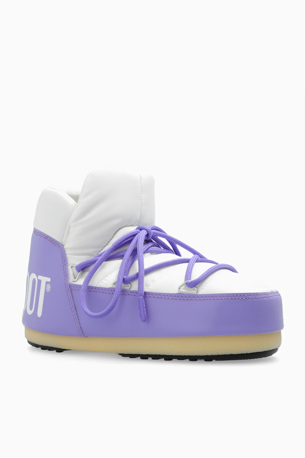 Biało-jasnofioletowe, wodoodporne śniegowce, model ‘Pumps’ Moon Boot. Z przodu sznurowane. Ozdobione białym, nadrukowanym logo. Przyssawki na czarno-kremowej, gumowej podeszwie bieżnika, zapewniają przyczepność w każdym terenie. Metalowe elementy w kolorze srebrnym.