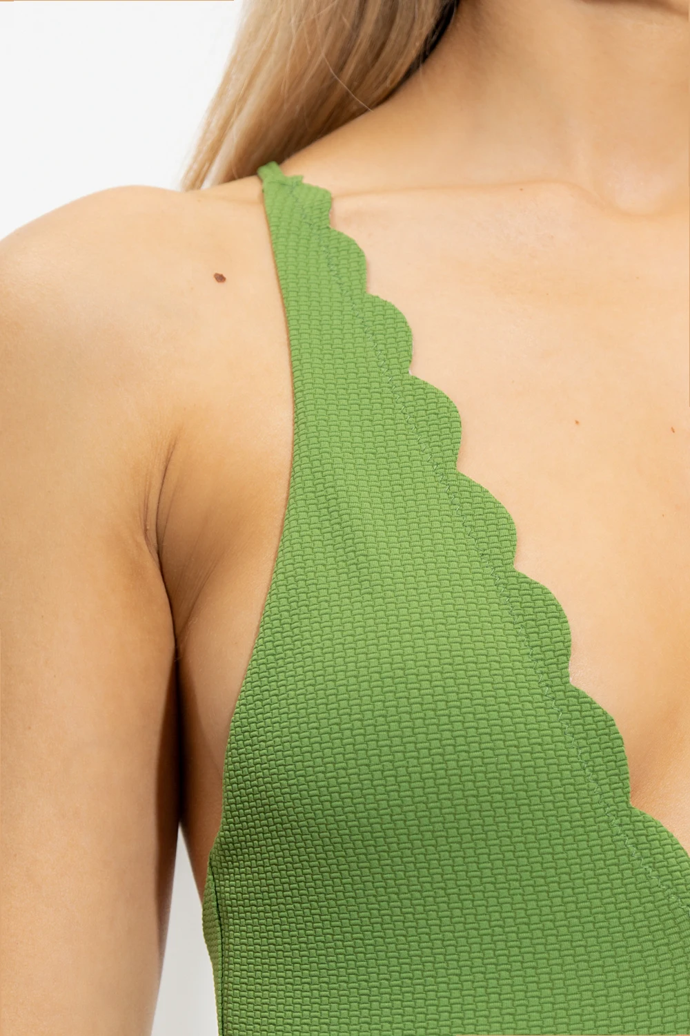 Dwustronny, jednoczęściowy kostium kąpielowy na ramiączkach, model ‘North Maillot’ Marysia. Wykonany z elastycznej, teksturowanej tkaniny. Charakterystyczne, ręcznie wycinane brzegi. Z jednej strony zielony. Z drugiej strony jasnoróżowy.