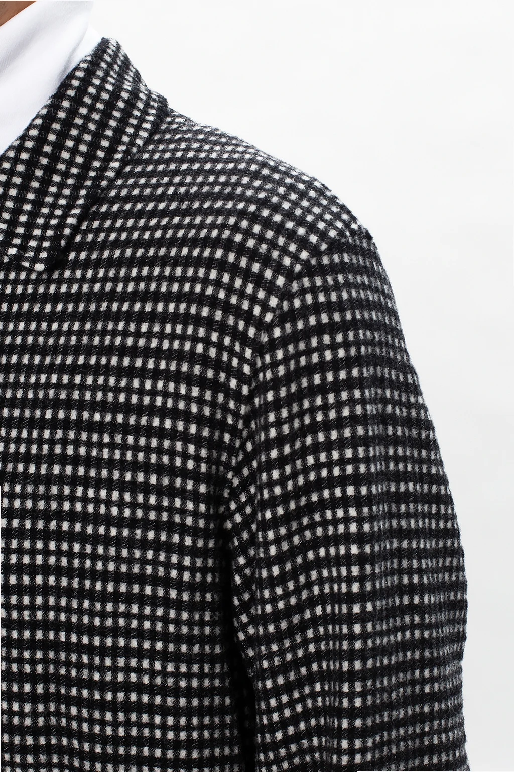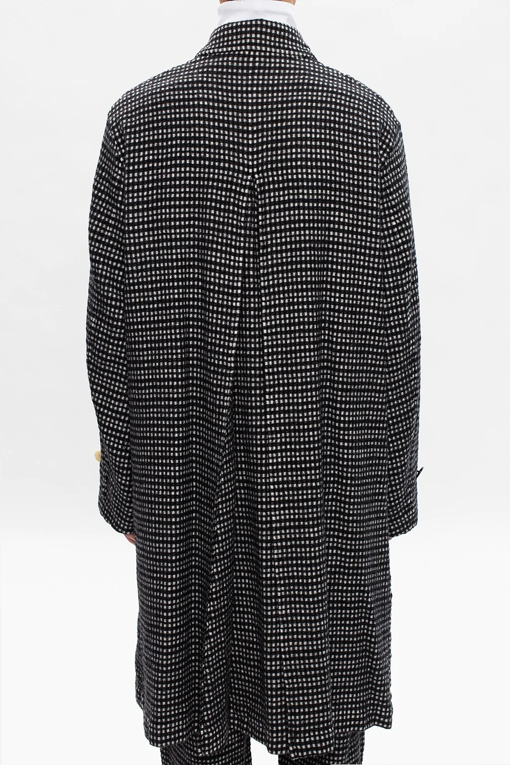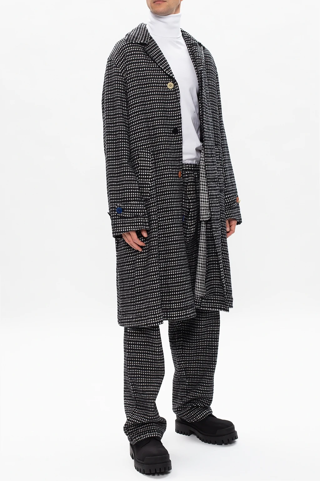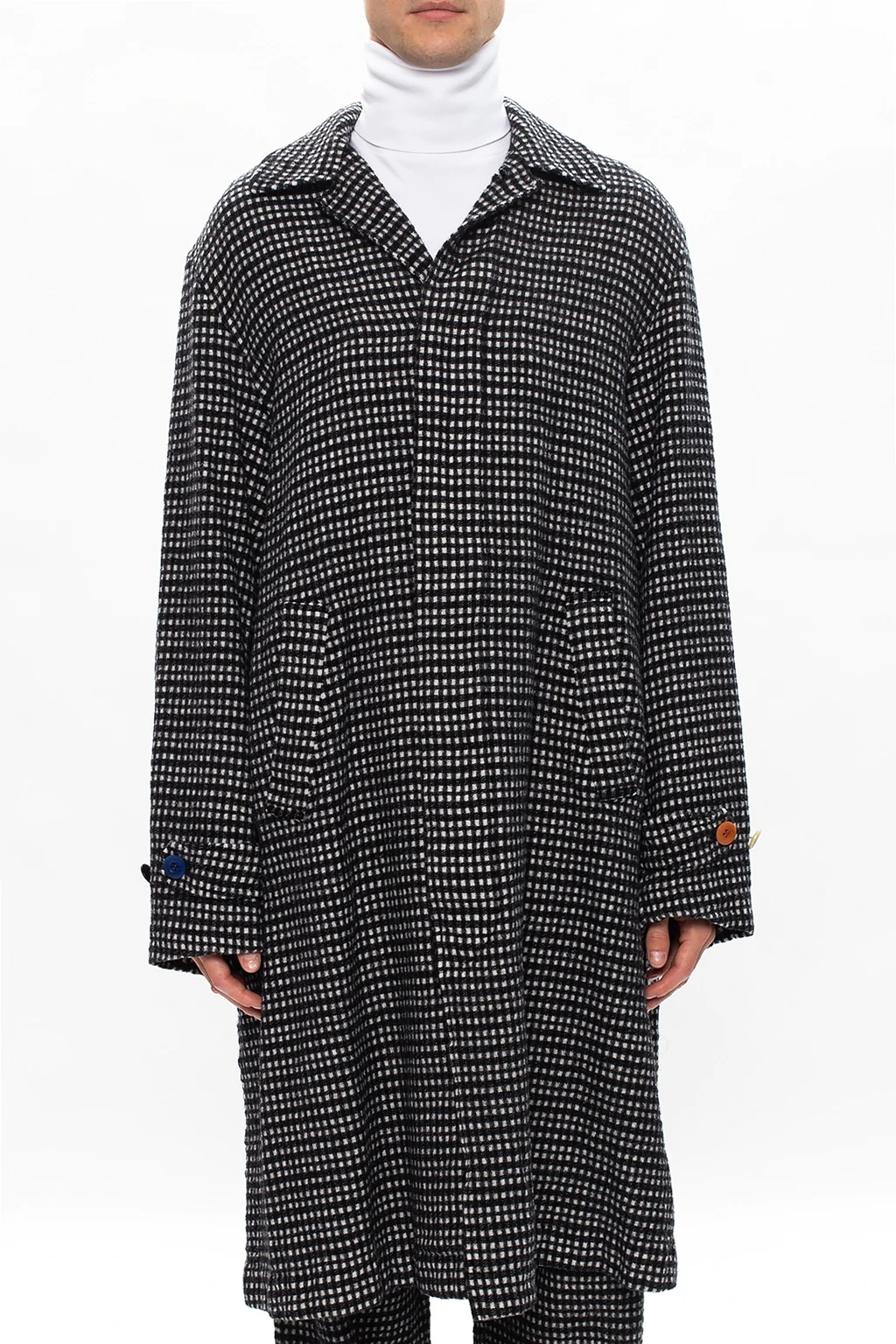 Czarno-biały płaszcz Undercover. Wykonany z wełny. Zapinany na guziki. Wyszyty wzór w kratę. Dwie wsuwane kieszenie. Na rękawach pasek zapinany na kolorowe guziki.