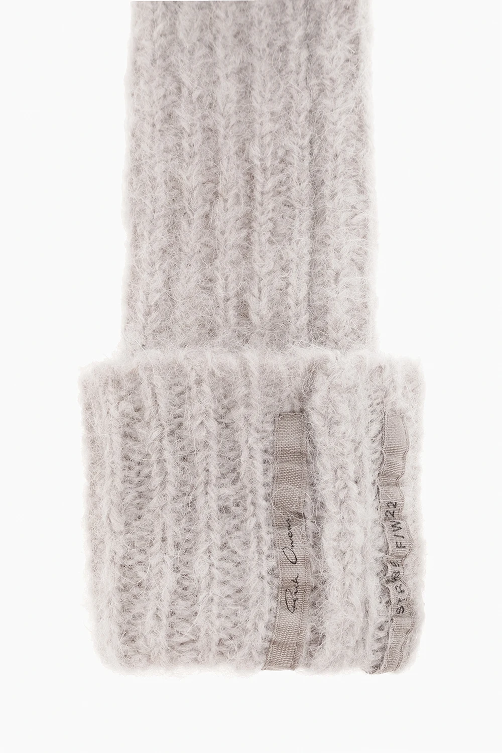Szare, prążkowane rękawy Rick Owens. Wykonane z moheru i alpaki. Ozdobione wycięciami. Wykończone ściągaczem.