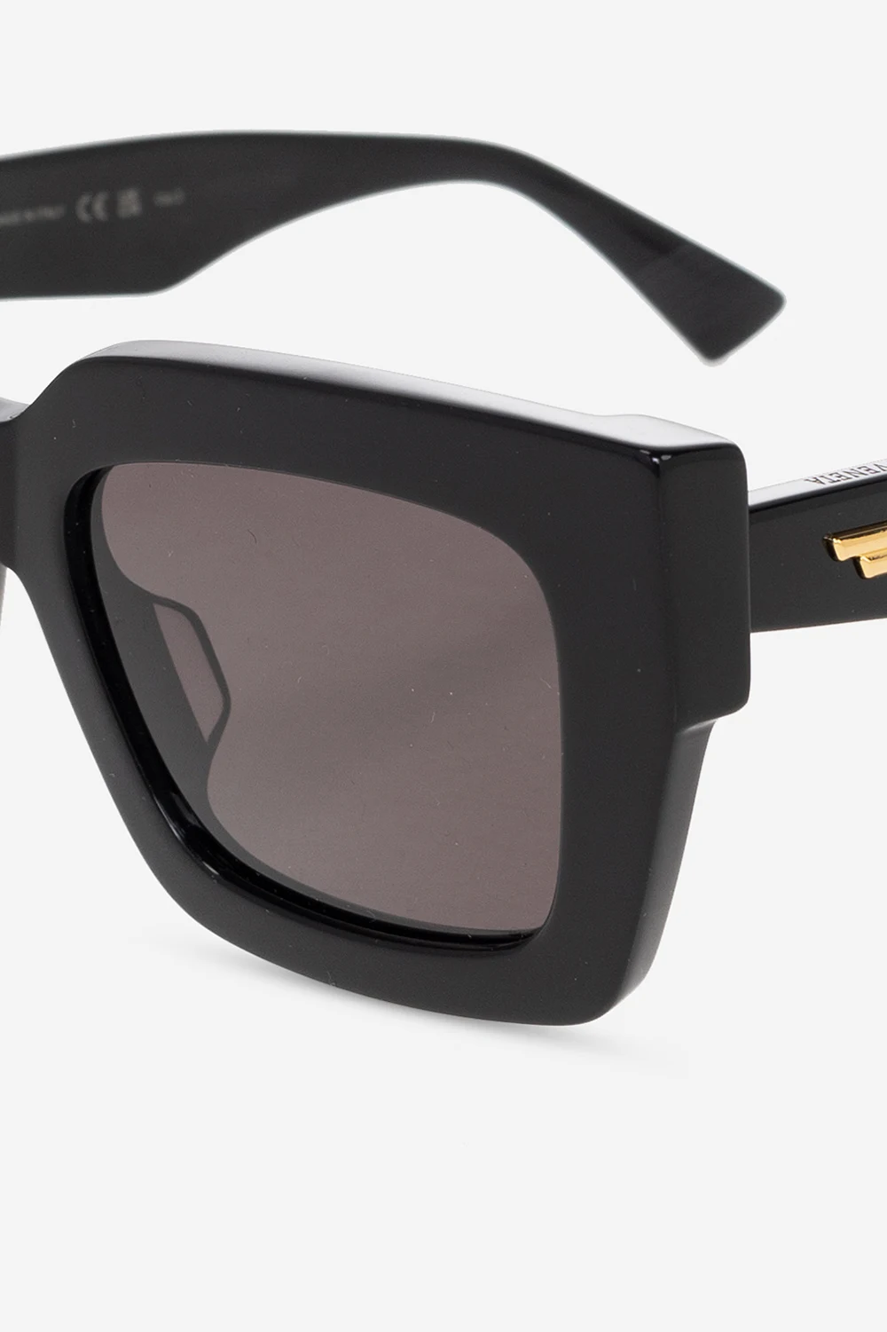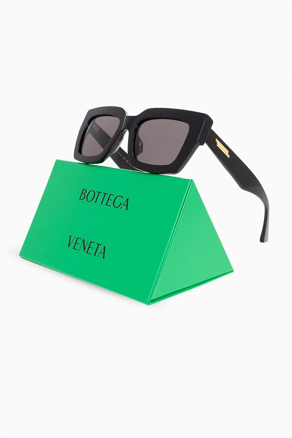 Czarne okulary przeciwsłoneczne, model ‘Classic’ Bottega Veneta. Kwadratowe oprawki z pojedynczym mostkiem i zintegrowanymi noskami. Zauszniki ozdobione metalową aplikacją w kształcie logo w kolorze złotym. Szare szkła ze 100% ochroną przed promieniami UV. Dołączone etui.