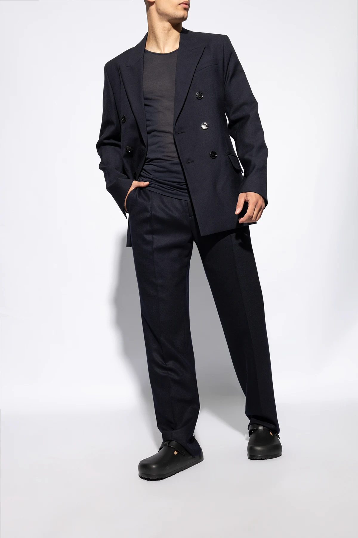 Design tych wyjątkowych klapków charakteryzuje się zaokrąglonym przodem i otwartą tylną częścią, typową dla tego rodzaju obuwia, wzbogacony o regulowany pasek z klamrą na wierzchu, co pozwala na idealne dopasowanie do stopy. Podeszwa o wyraźnym, grubym profilu nie tylko stanowi wzrokowy akcent, ale także zapewnia dodatkową amortyzację i stabilność podczas chodzenia. Szczegółem podkreślającym autentyczność i prestiż marki jest subtelnie umieszczone logo projektanta na bocznej części obuwia.