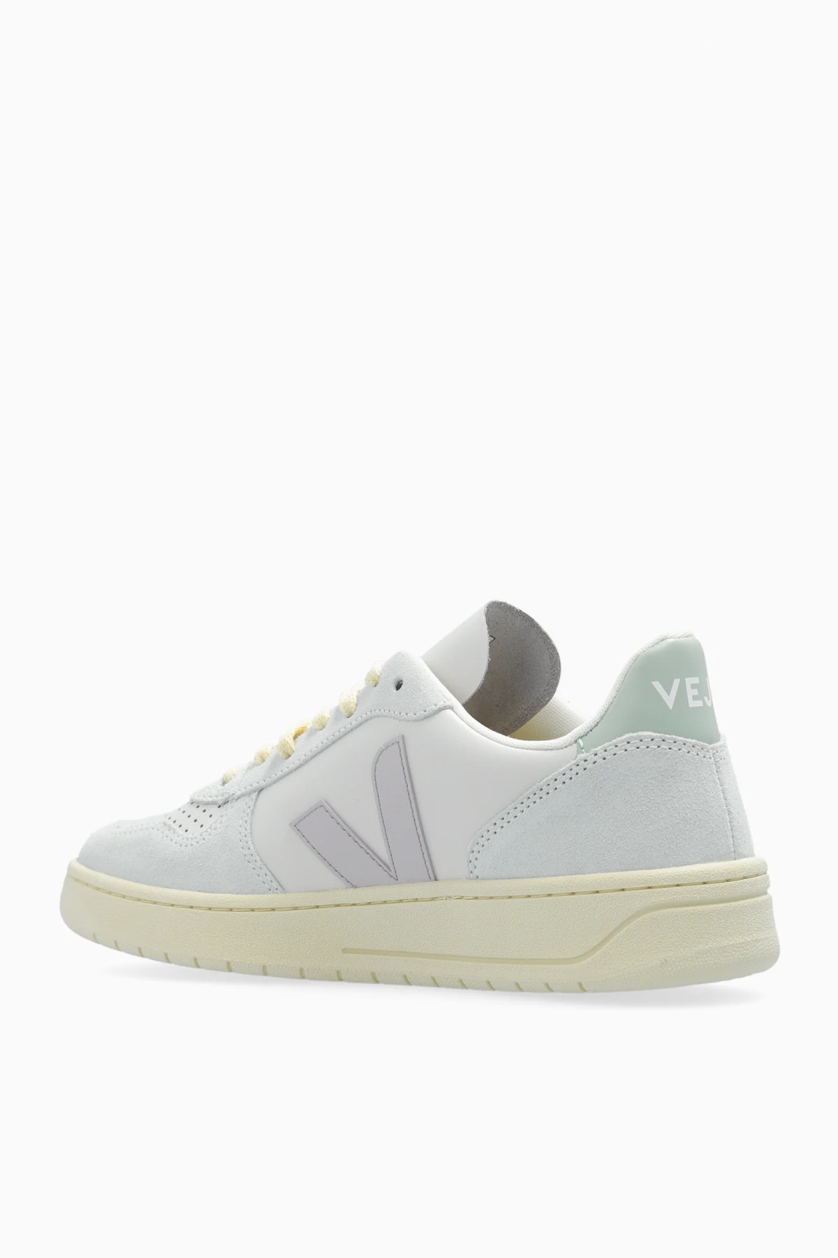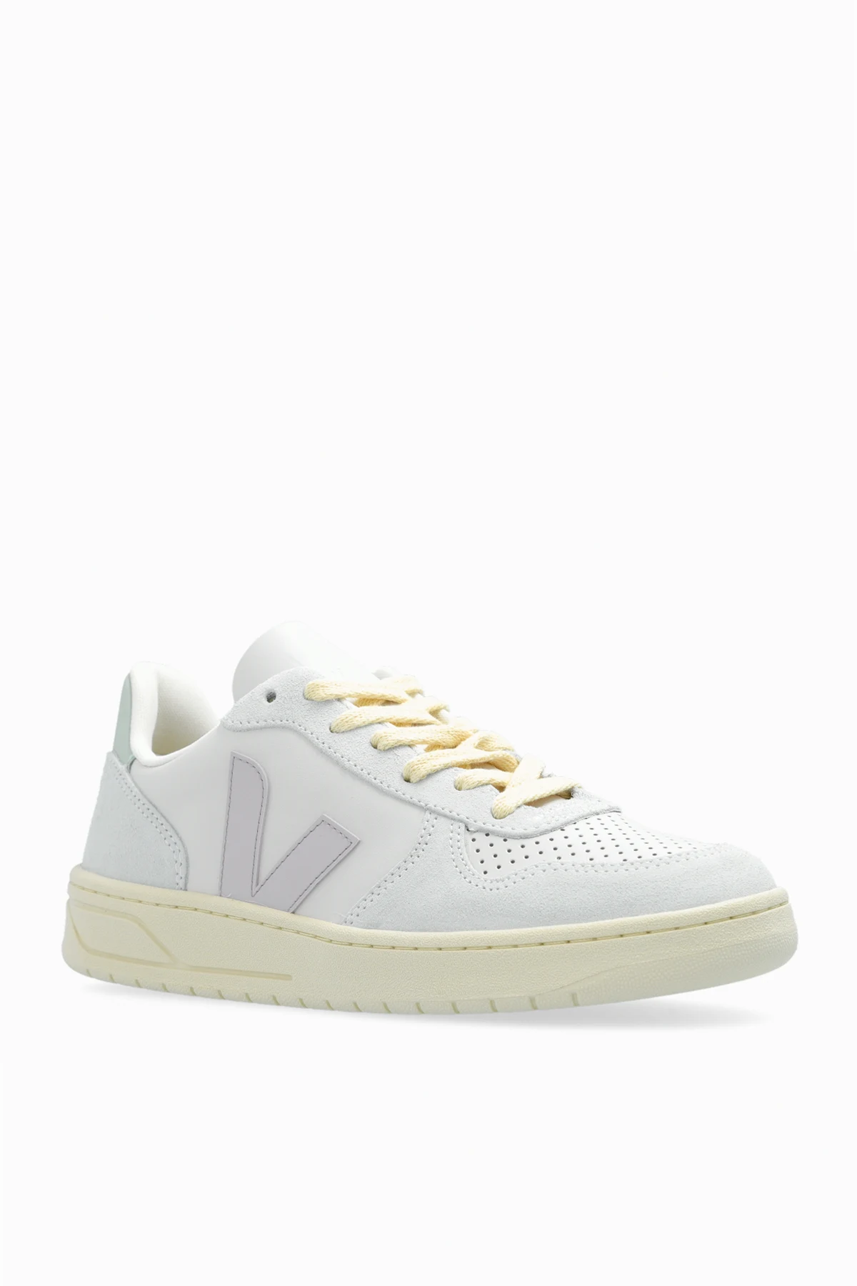 Kolorowe, sznurowane buty sportowe, model ‘V-10 Leather’ Veja. Wykonane ze skóry i zamszu. Sznurowadła z bawełny organicznej. Z boku ozdobione naszywką w kształcie litery ‘V’. Na języku i z tyłu logo. Z przodu perforacja. Wewnątrz materiał z recyklingu. Wkładka z gumy amazońskiej, trzciny cukrowej, pianki EVA pochodzącej z recyklingu i bawełny organicznej. Kremowa podeszwa wykonana z gumy amazońskiej, krzemionki, gumy z recyklingu, gumy syntetycznej i innych materiałów.