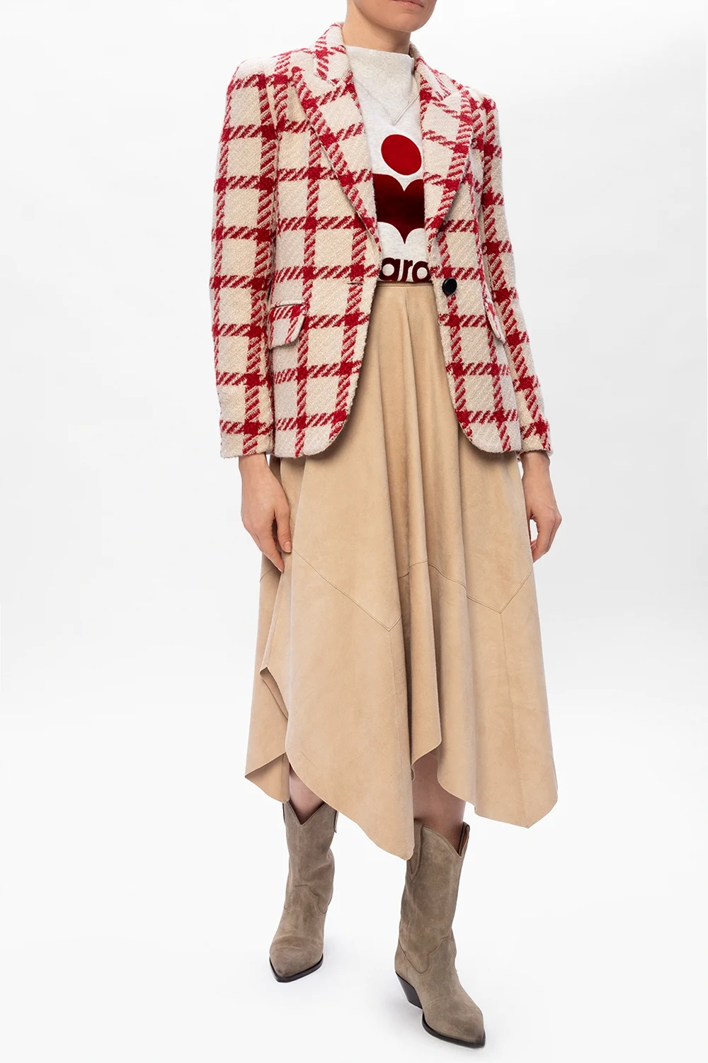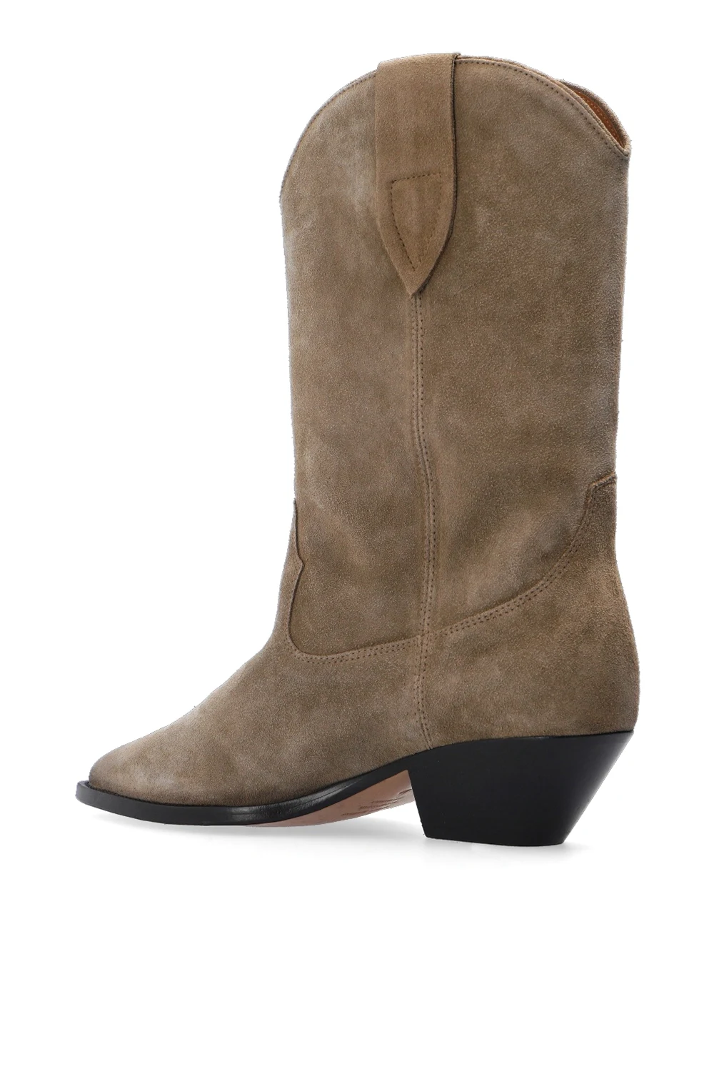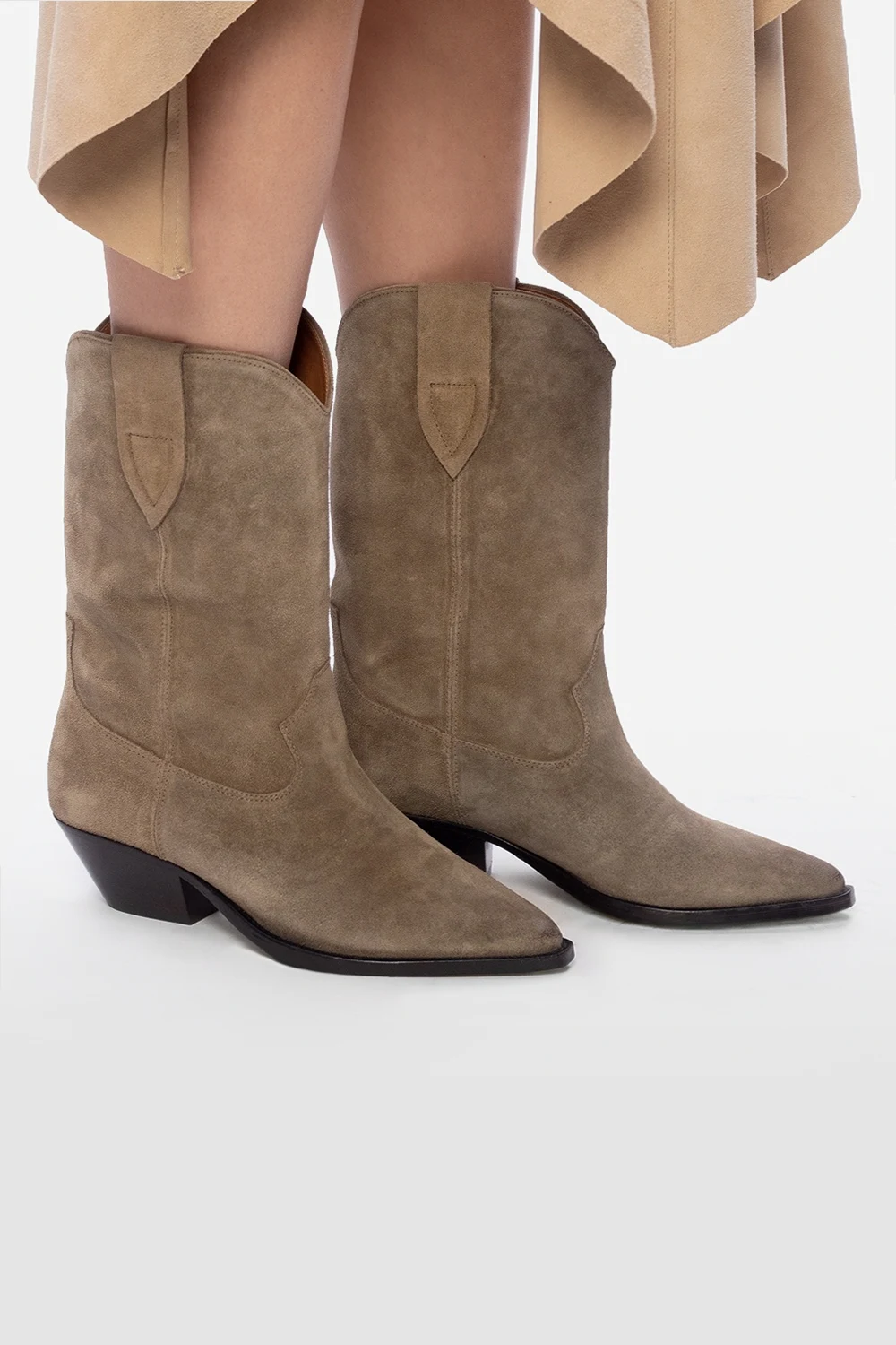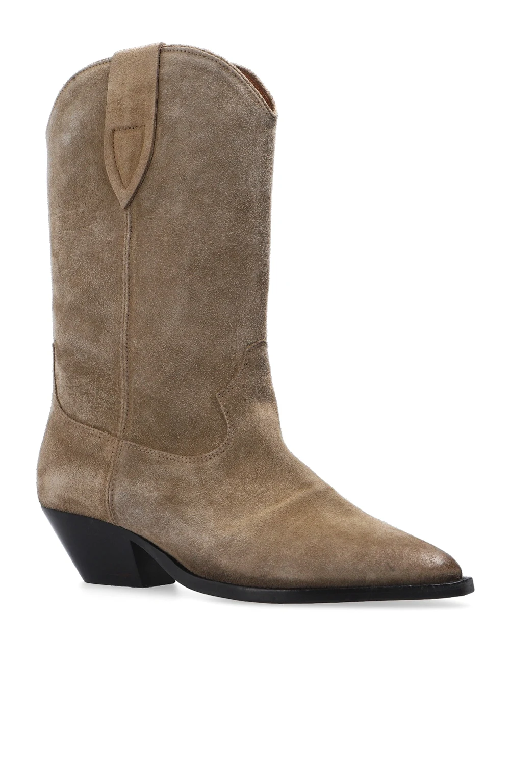 Beżowe, wsuwane botki, model ‘Washed Iconic’ Isabel Marant. Wykonane ze skóry. Ozdobione przeszyciami oraz efektem znoszenia. Nosek w szpic. Beżowo-czarna, skórzana podeszwa.