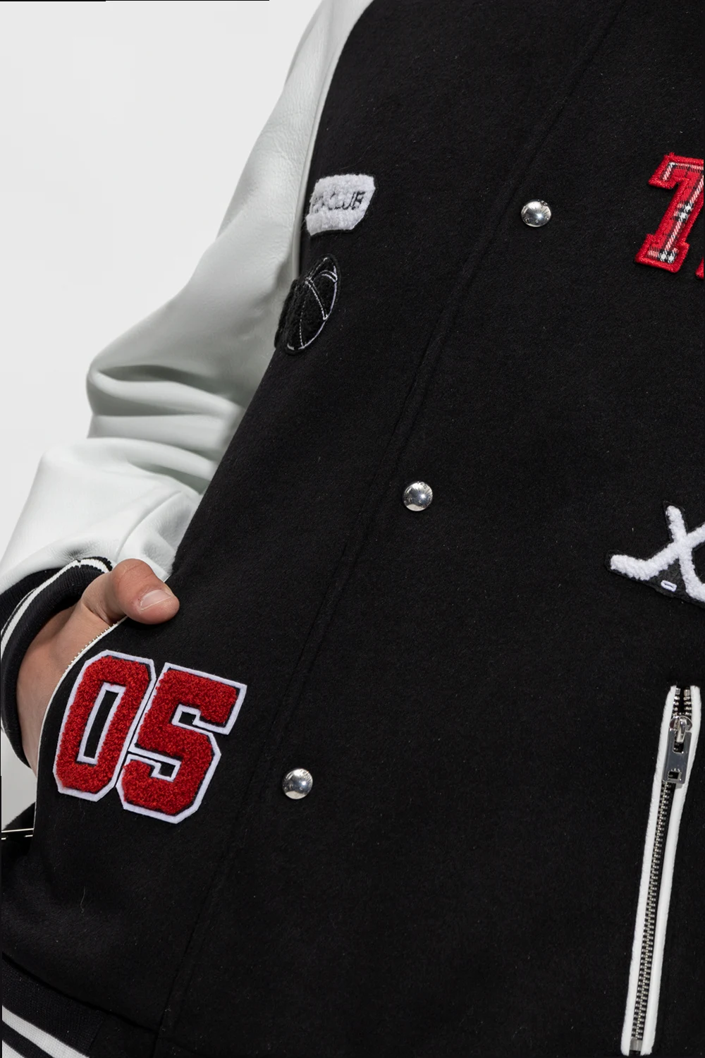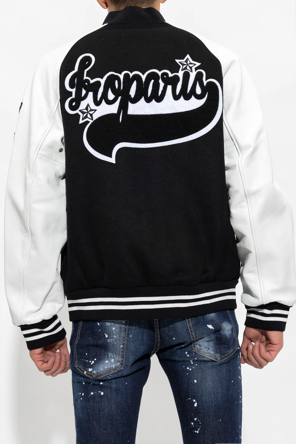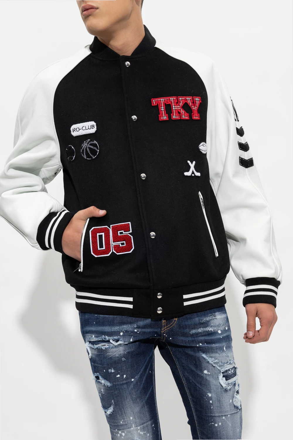 Czarno-biała kurtka typu ‘bomber’, model ‘Dave’ Iro. Wykonana z wełny i skóry jagnięcej. Zapinana na zatrzaski. Ozdobiona licznymi, kolorowymi naszywkami z motywem logo. Dwie kieszenie zapinane na zamek. Kołnierz, długie, skórzane rękawy oraz dół wykończone ściągaczem.