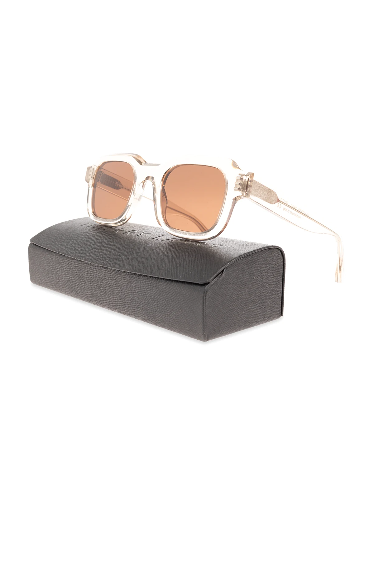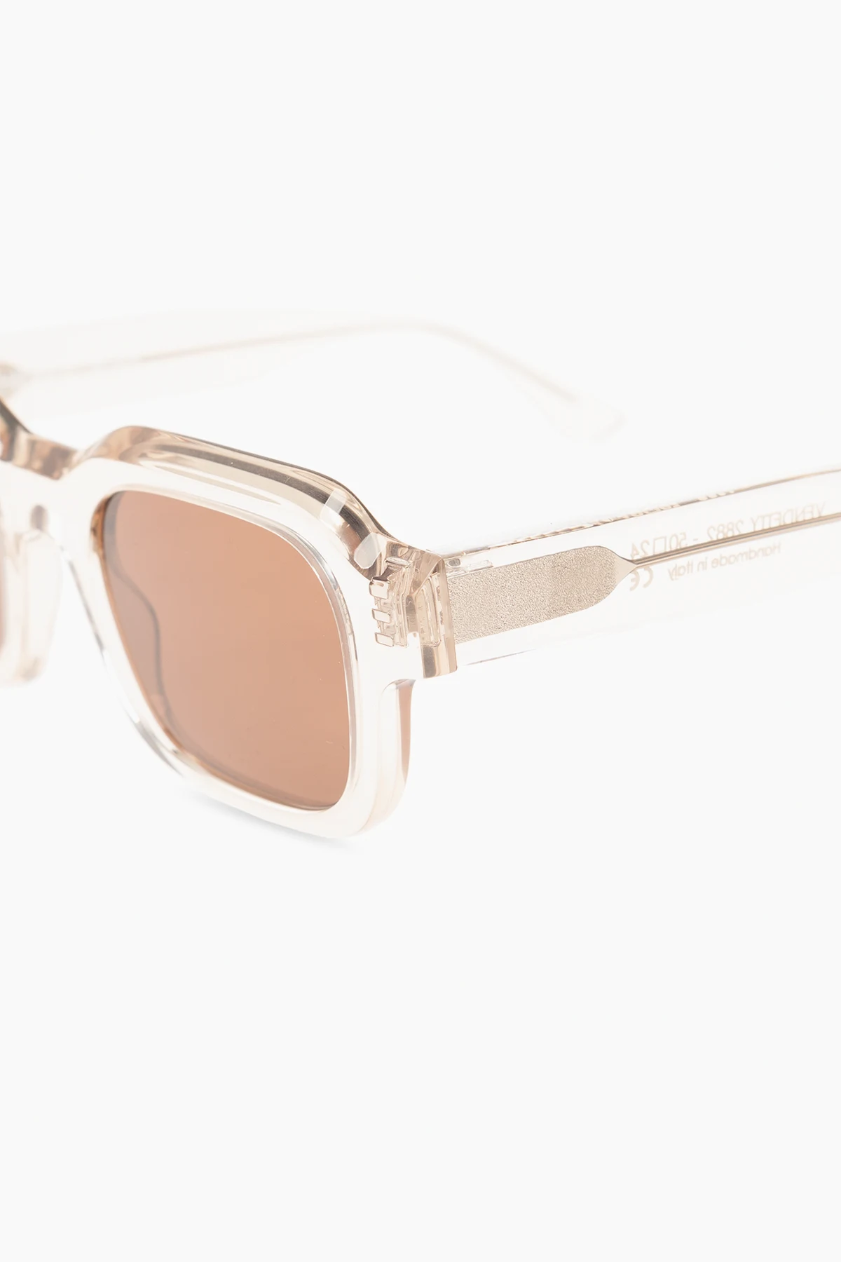 Jasnobeżowe, transparentne okulary przeciwsłoneczne, model ‘Vendetty’ Thierry Lasry. Prostokątne oprawki. Ostra, ścięta linia brwi. Zauszniki z wstawką w kolorze jasnego złota. Brązowe soczewki ze 100% ochroną przed promieniowaniem UV. Ręcznie wykonane we Włoszech. Dołączone etui.