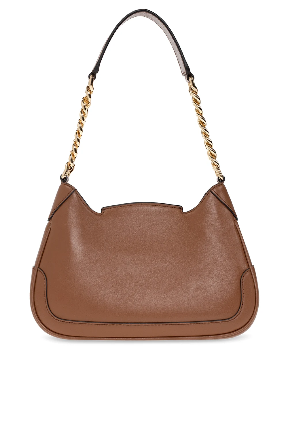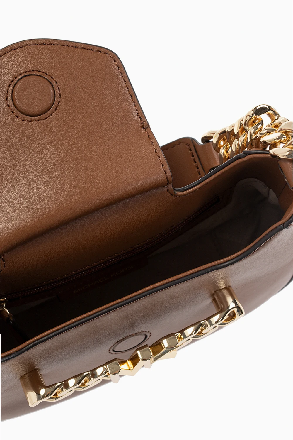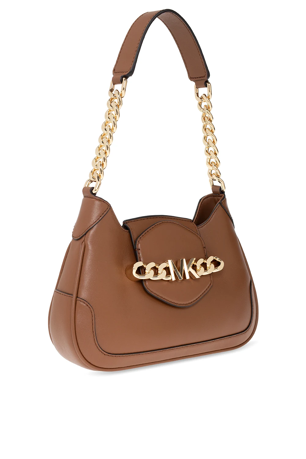 Brązowa, skórzana torba na ramię, model 'Hally' Michael Michael Kors. Zamykana na magnetyczne wsuwane zamknięcie. Z przodu ozdobiona metalową aplikacją z logo wykończoną łańcuchem w kolorze złotym. Krótki pasek na ramię. Wewnątrz komora z dwiema kieszeniami: wsuwaną oraz zamykaną na zamek. Metalowe wykończenie w kolorze złotym.