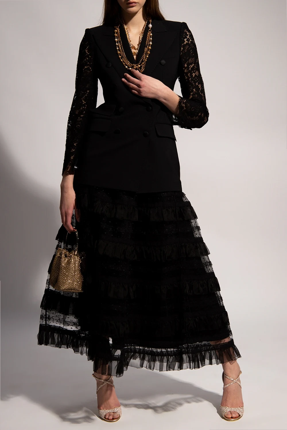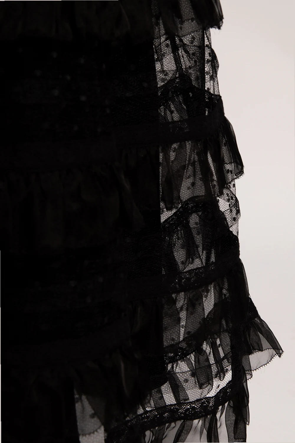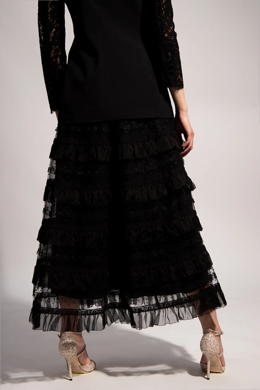 Czarna, transparentna spódnica Red Valentino. W pasie wszyta guma. Ozdobiona falbanami, siatką oraz koronką.