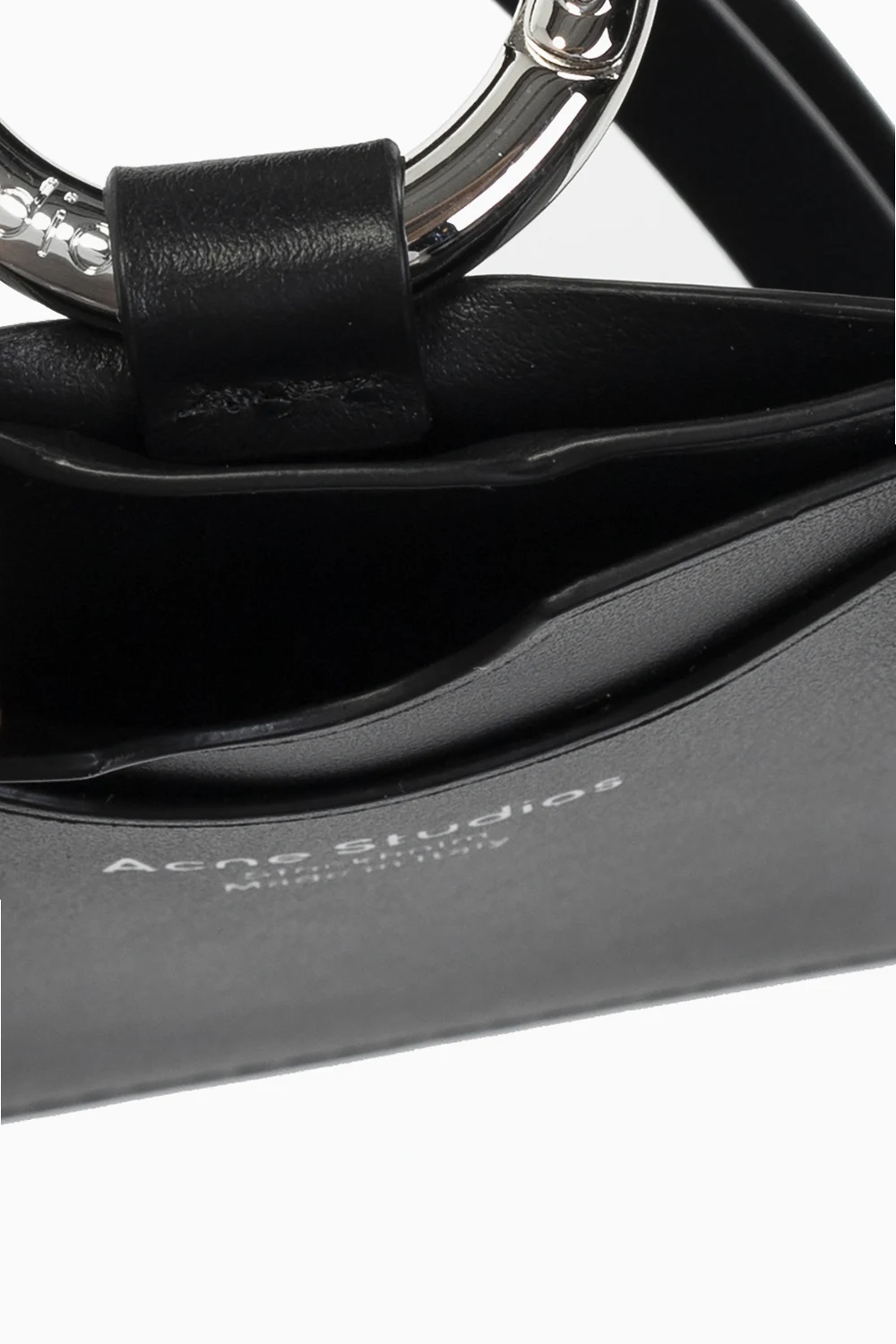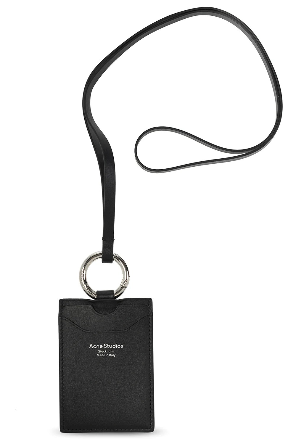 Czarne etui na karty Acne Studios. Wykonane ze skóry. Ozdobione wzorem z logo w kolorze srebrnym. Trzy miejsca na karty. Pas na szyję wykończony karabińczykiem.