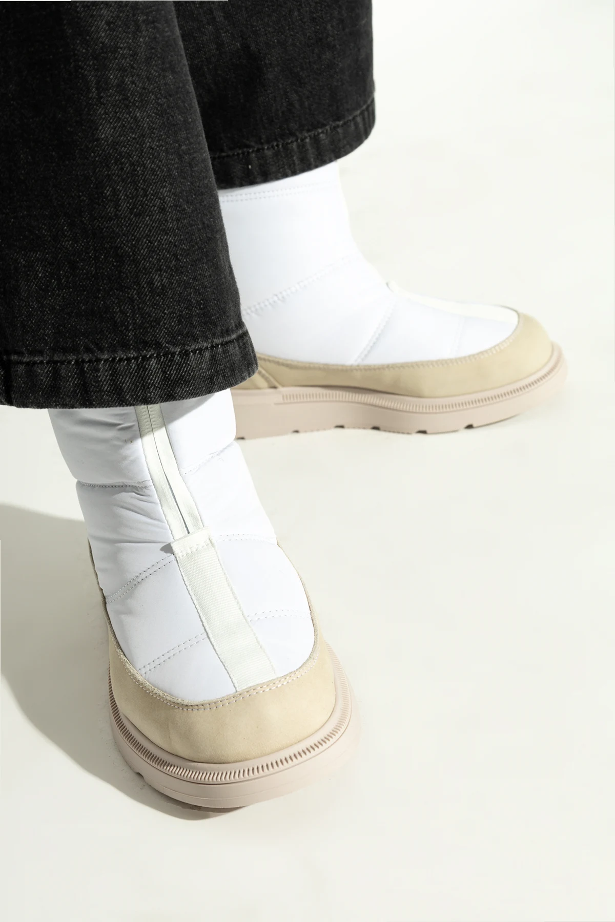 Buty te wyróżniają się klasycznym, wysokim fasonem , sięgającym powyżej kostki, oraz prostym, minimalistycznym designem z delikatnymi przeszyciami. Górna część buta, wykonana z białego, syntetycznego materiału, zapewnia ciepło i ochronę przed wilgocią, podczas gdy dolna część, obejmująca okolice palców i pięty, wykonana jest z beżowego zamszu, dodając elegancji i kontrastu. Gruba, gumowa podeszwa gwarantuje doskonałą przyczepność na śniegu i lodzie.