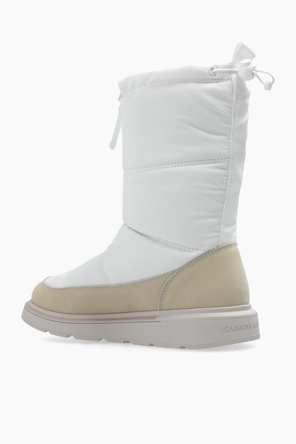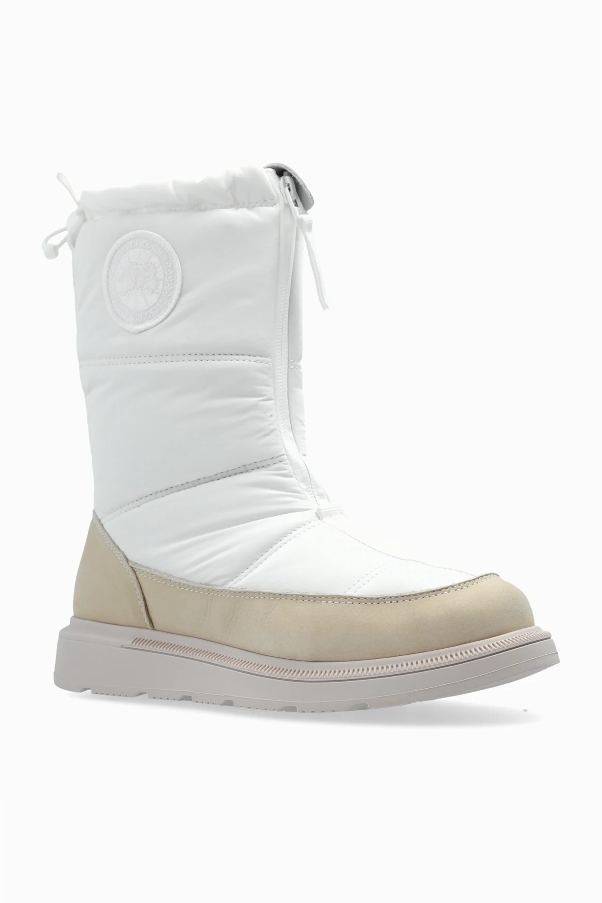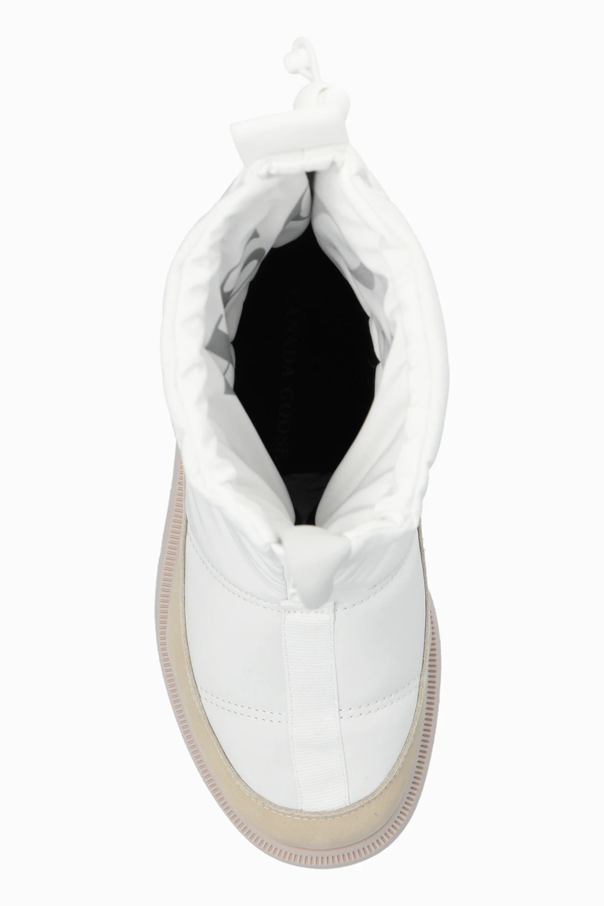 Na boku buta znajduje się okrągłe, wypukłe logo projektanta, a na górze ściągacz z troczkiem, który zapewnia idealne dopasowanie i chroni przed dostawaniem się śniegu do środka. Z tyłu buta umieszczony jest subtelny napis "CANADA GOOSE" wytłoczony na gumowej podeszwie. Wnętrze buta wyściełane jest miękkim, ocieplonym materiałem, gwarantującym komfort i ciepło.